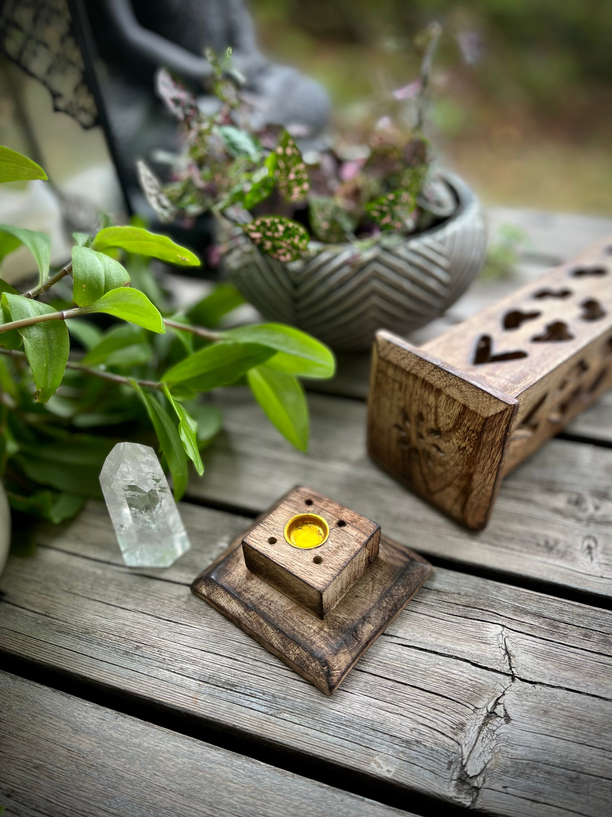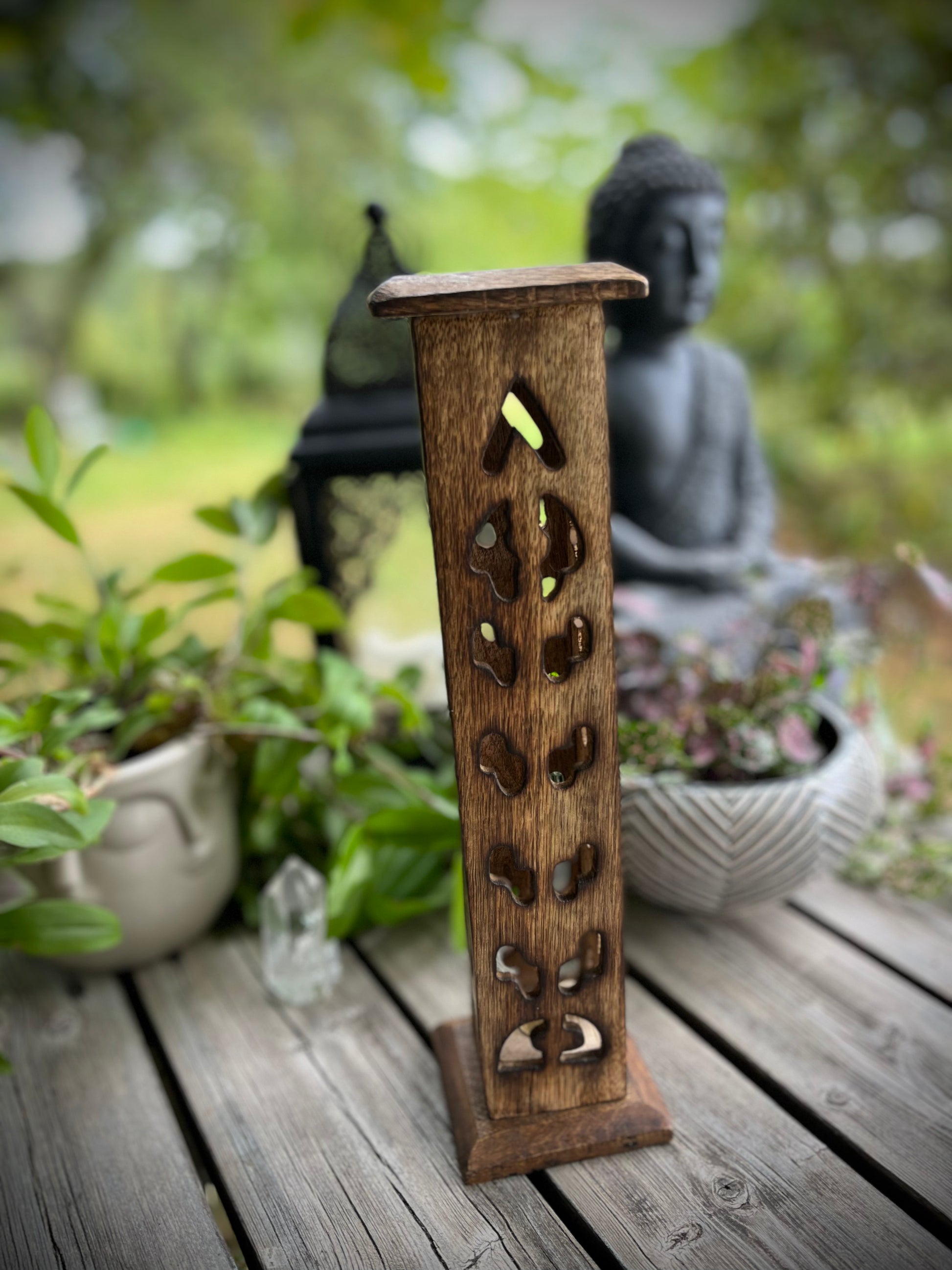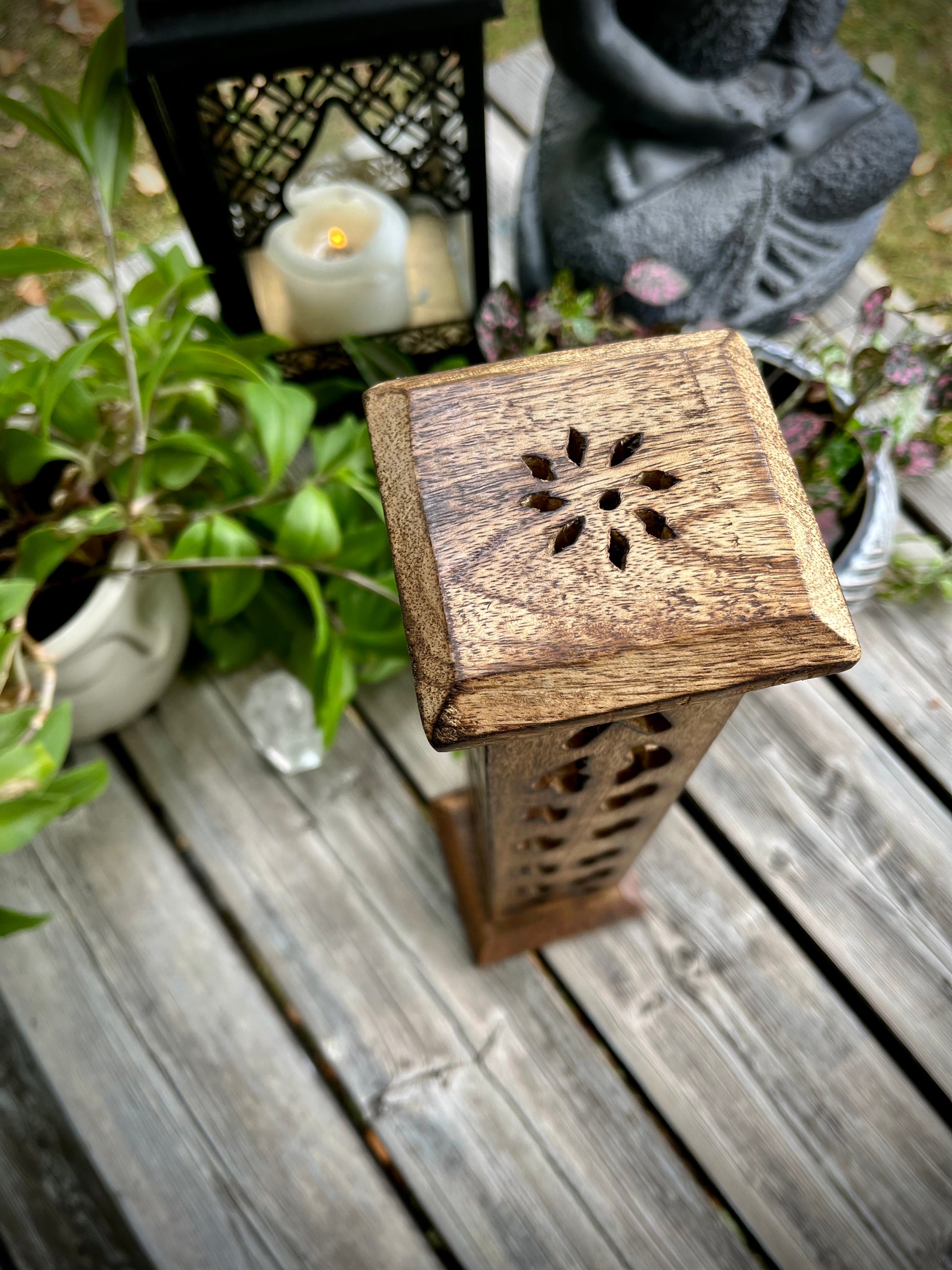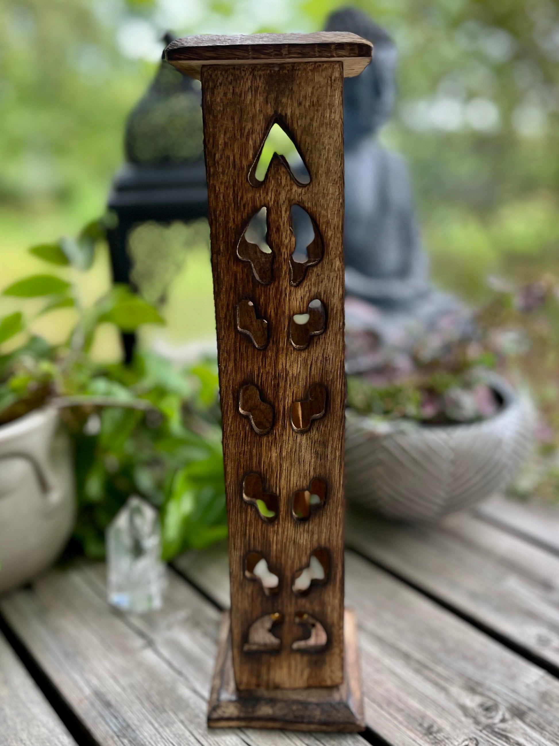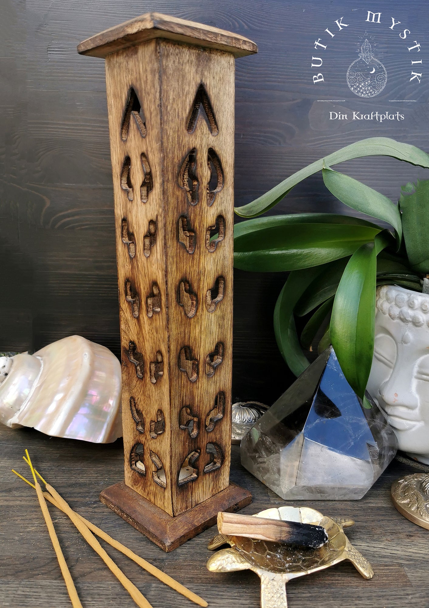 Denna rökelsebrännare är handsnidad i Indien. Den snidade utskärningar får röken sippra ut vackert. Var och en av de fyra sidorna är huggen i en vacker design. Trätornet kan bränna fyra rökelsepinnar åt gången samt en rökelsekon. Mycket lätt att rengöra.