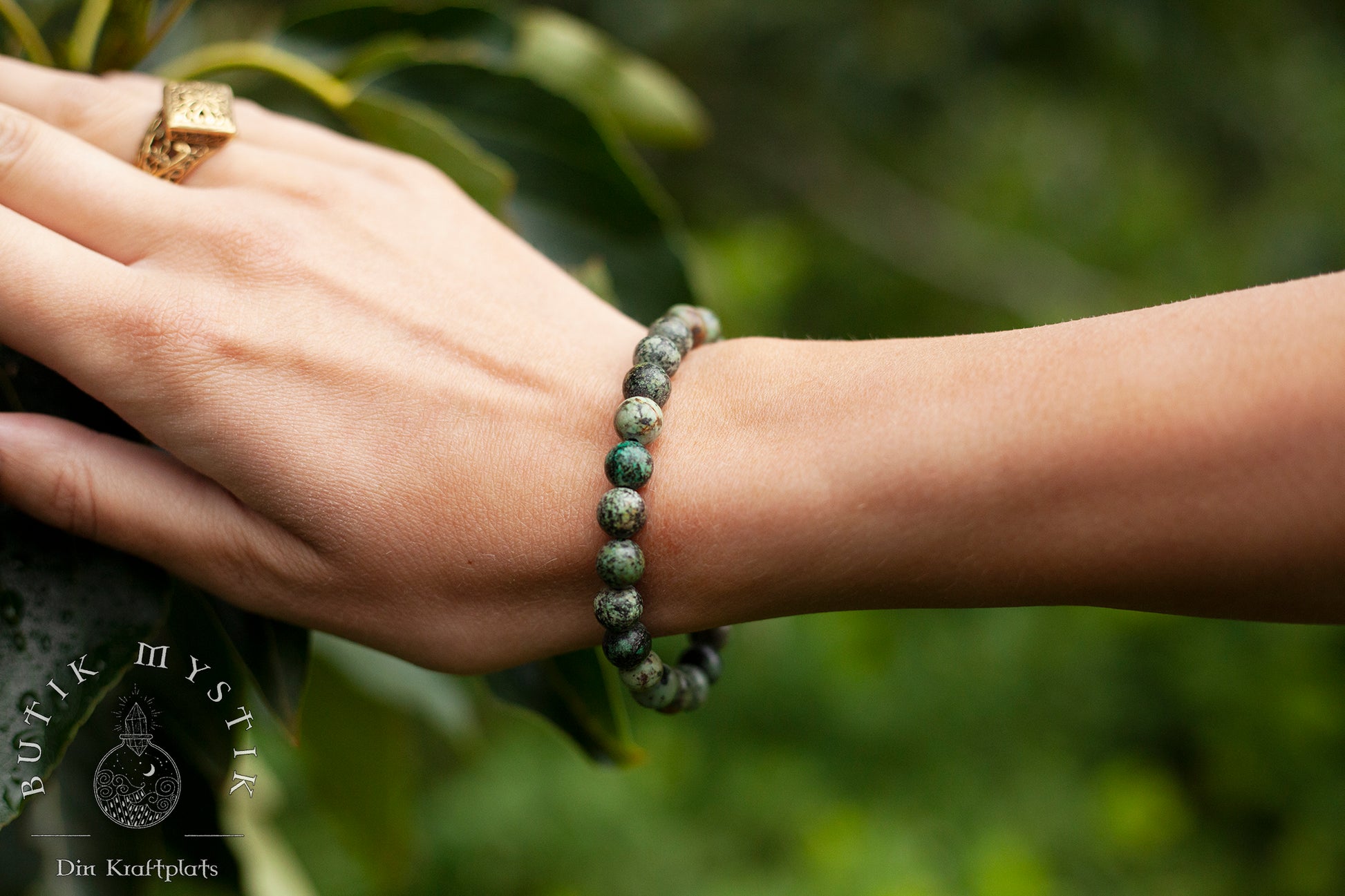 Afrikansk turkos är en spräcklig form av jaspis. Stenen, som anses vara "evolutionens sten", sägs åstadkomma stor förändring och transformation i ens liv. Dess uppmuntrande energi öppnar sinnen för nya möjligheter.