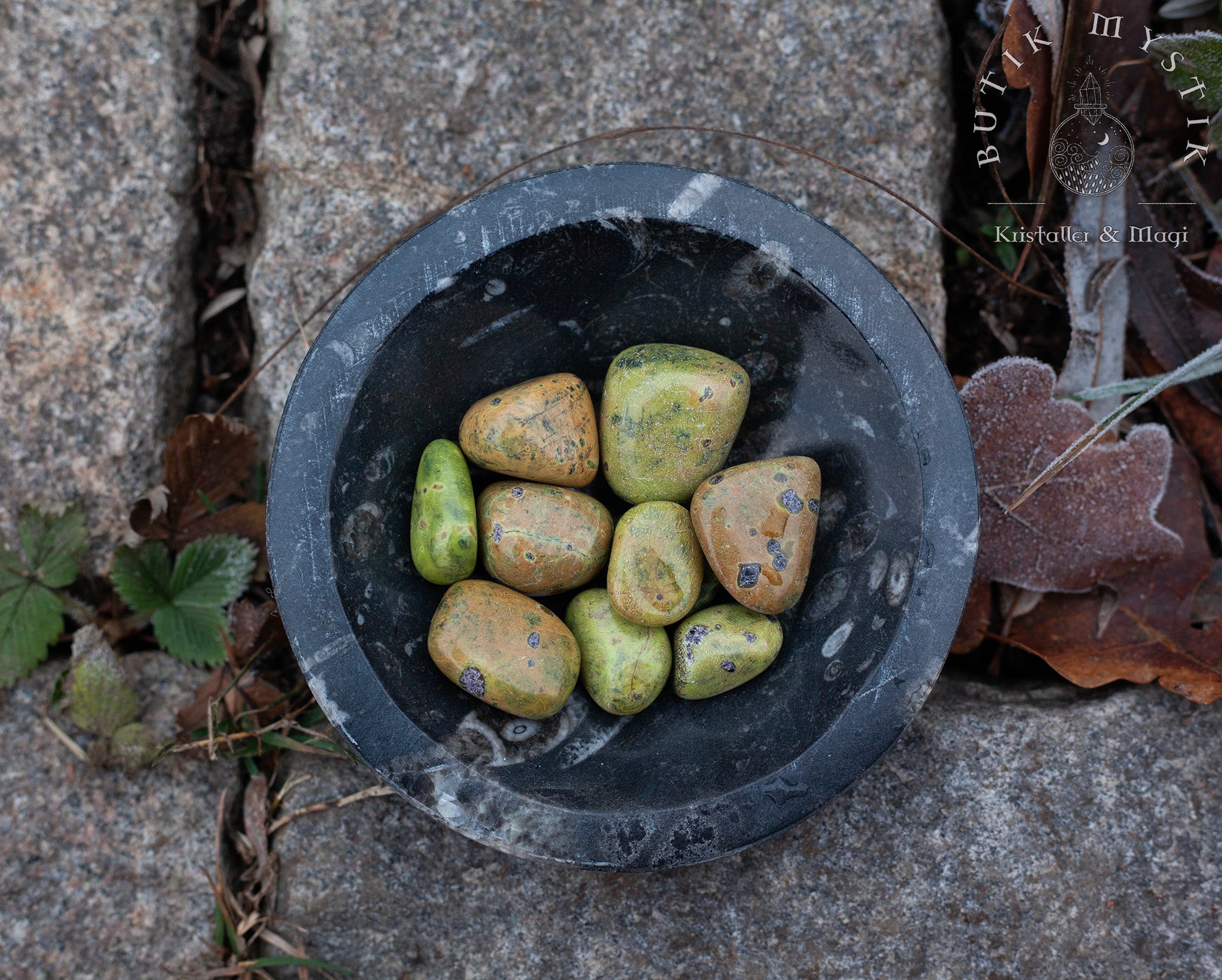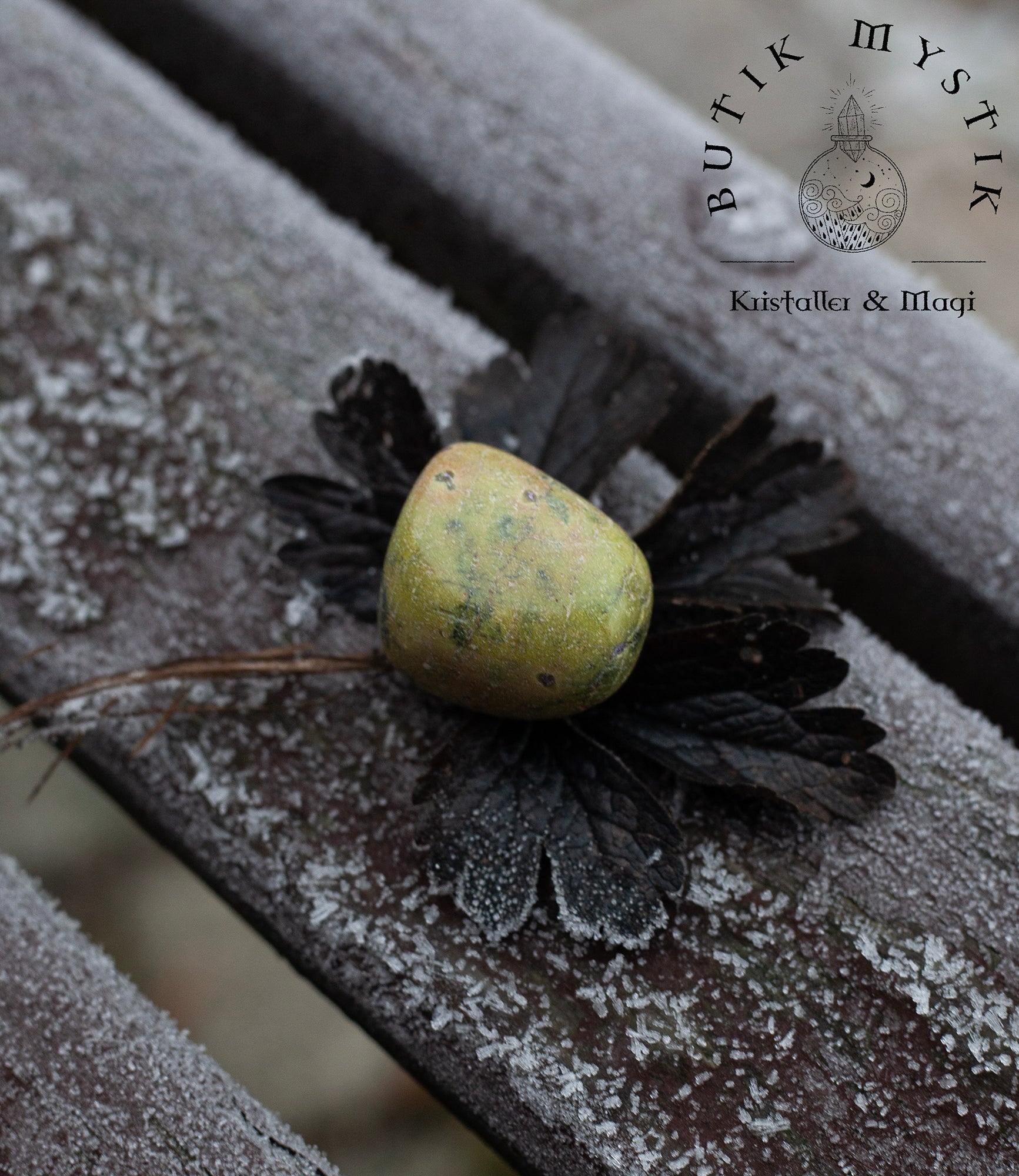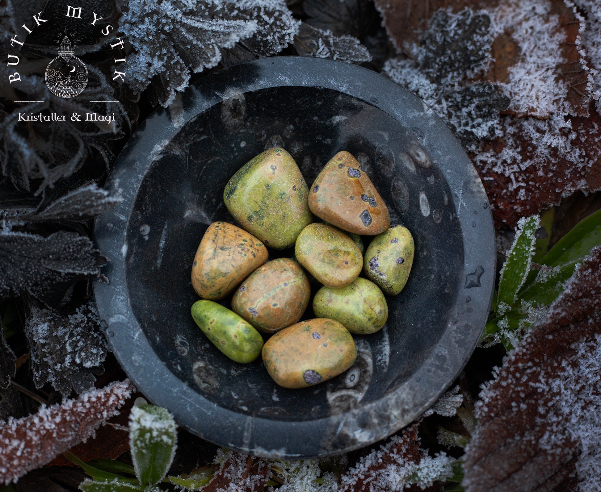 Atlantisit sägs hjälpa oss att uppnå andlig lugn som kan få dig att hålla dina känslor i schack. Det är en härlig avkopplande sten som kan är känd för att få oss att minnas gamla fakta och kunskap från tidigare liv. Det kan leda till en större förståelse för dina mönster och val i det här livet.