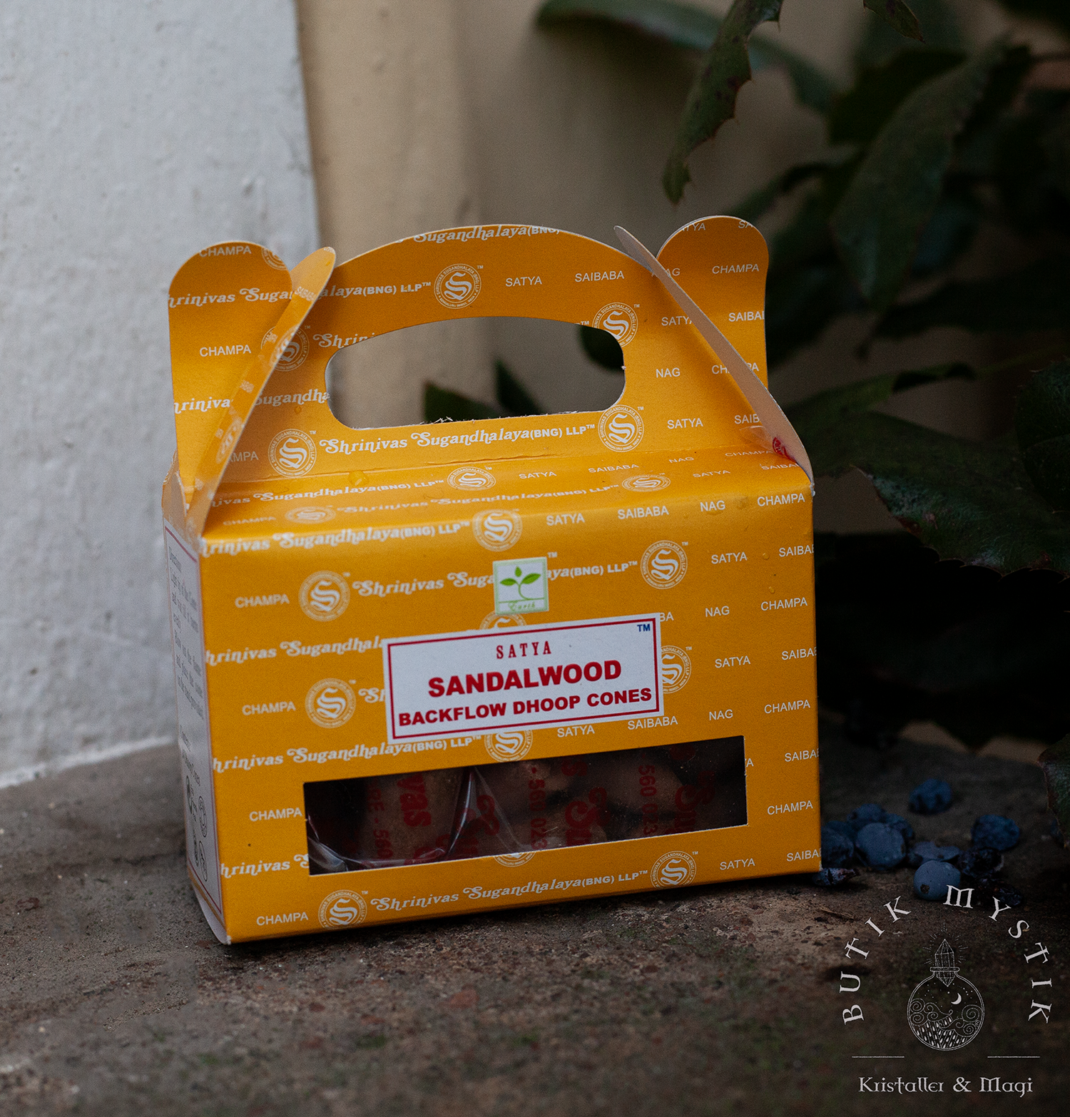 Sandalwood, eller sandelträ, är en doft som ofta beskrivs som varm, mjuk och träig. När det kommer till Satya's backflow rökelsekoner med sandelträsdoft, kan man förvänta sig en arom som är både lugnande och jordnära. Doften har en söt och krämig karaktär, med en subtil kryddighet som ger djup och komplexitet.