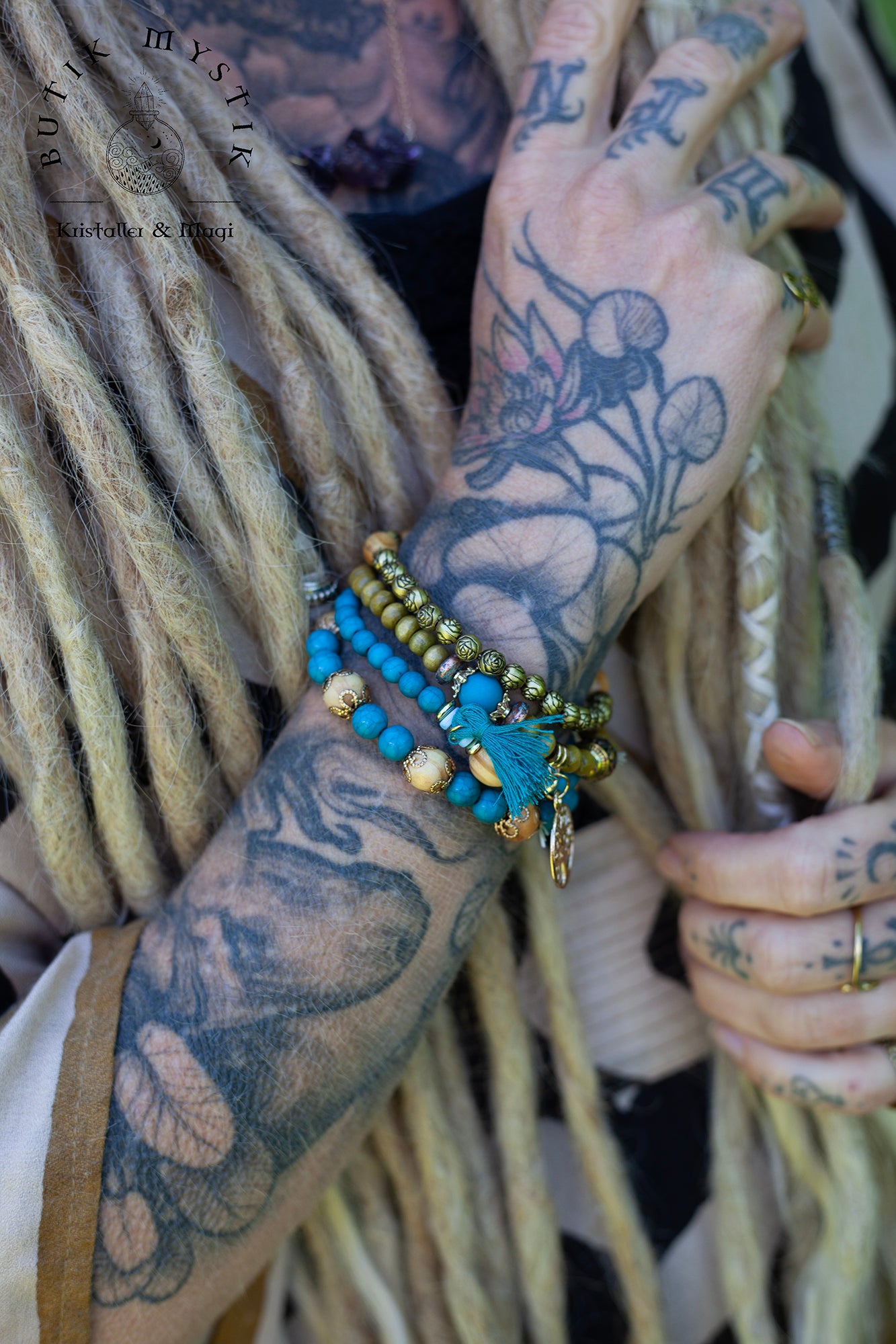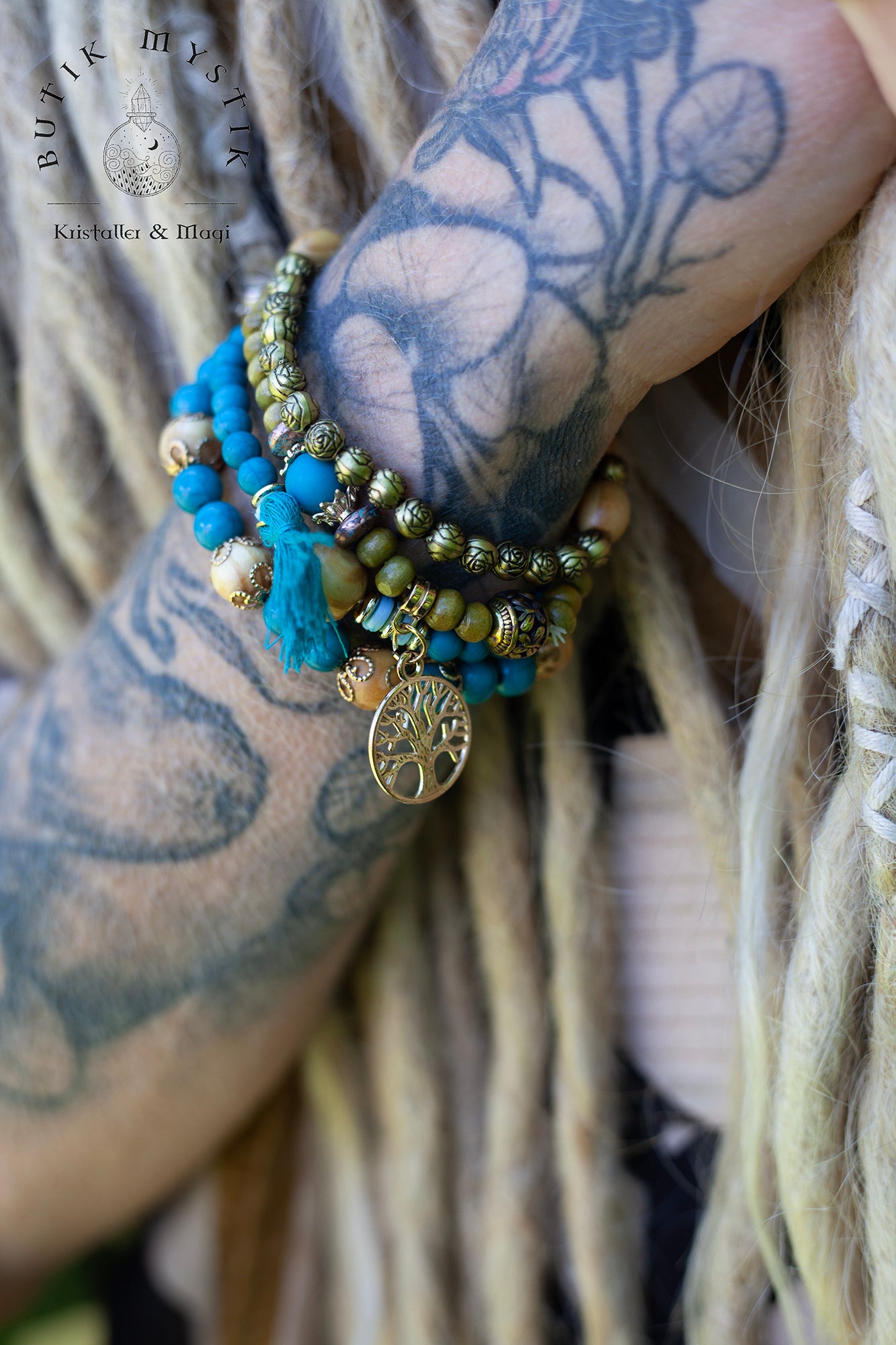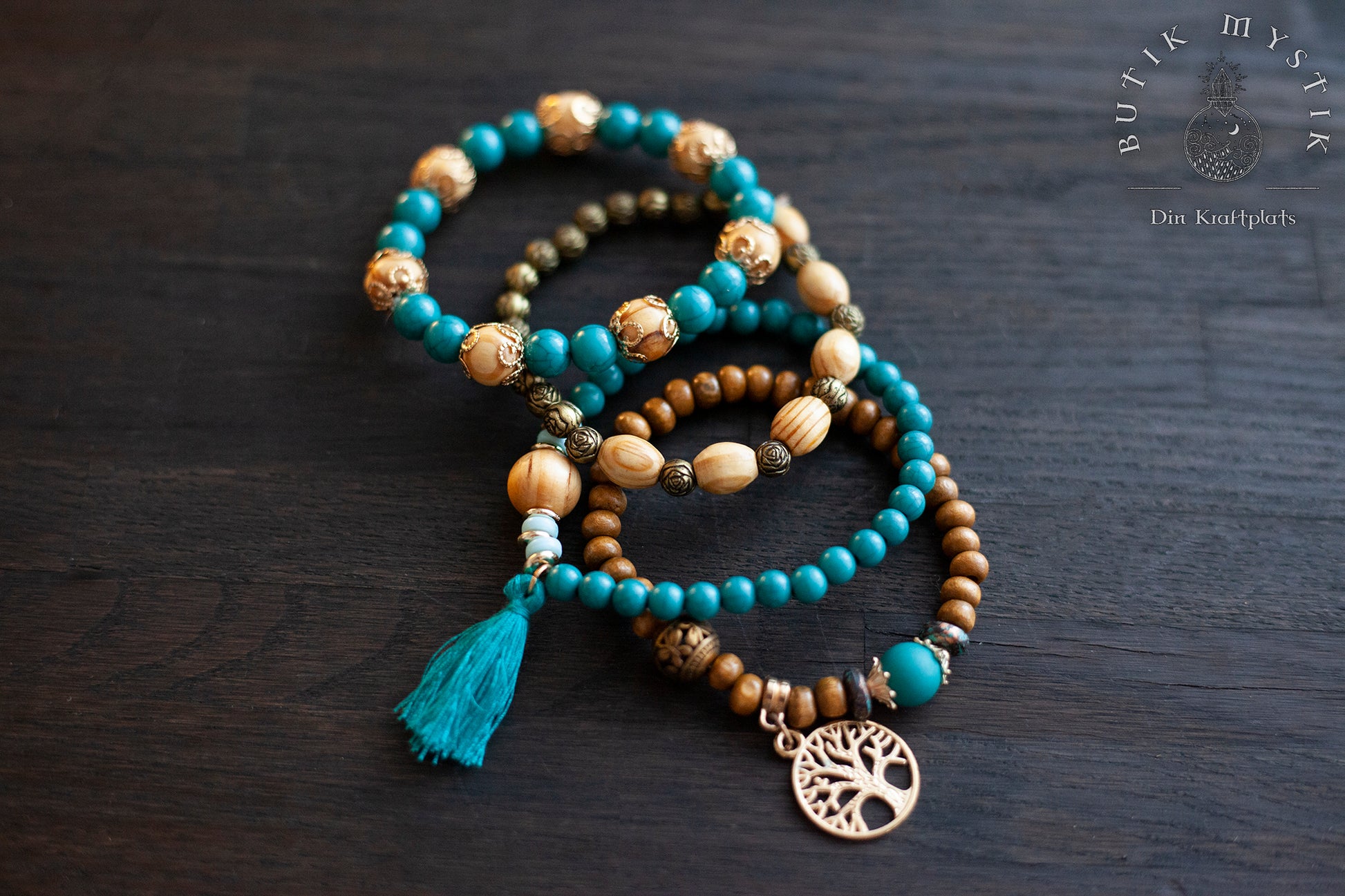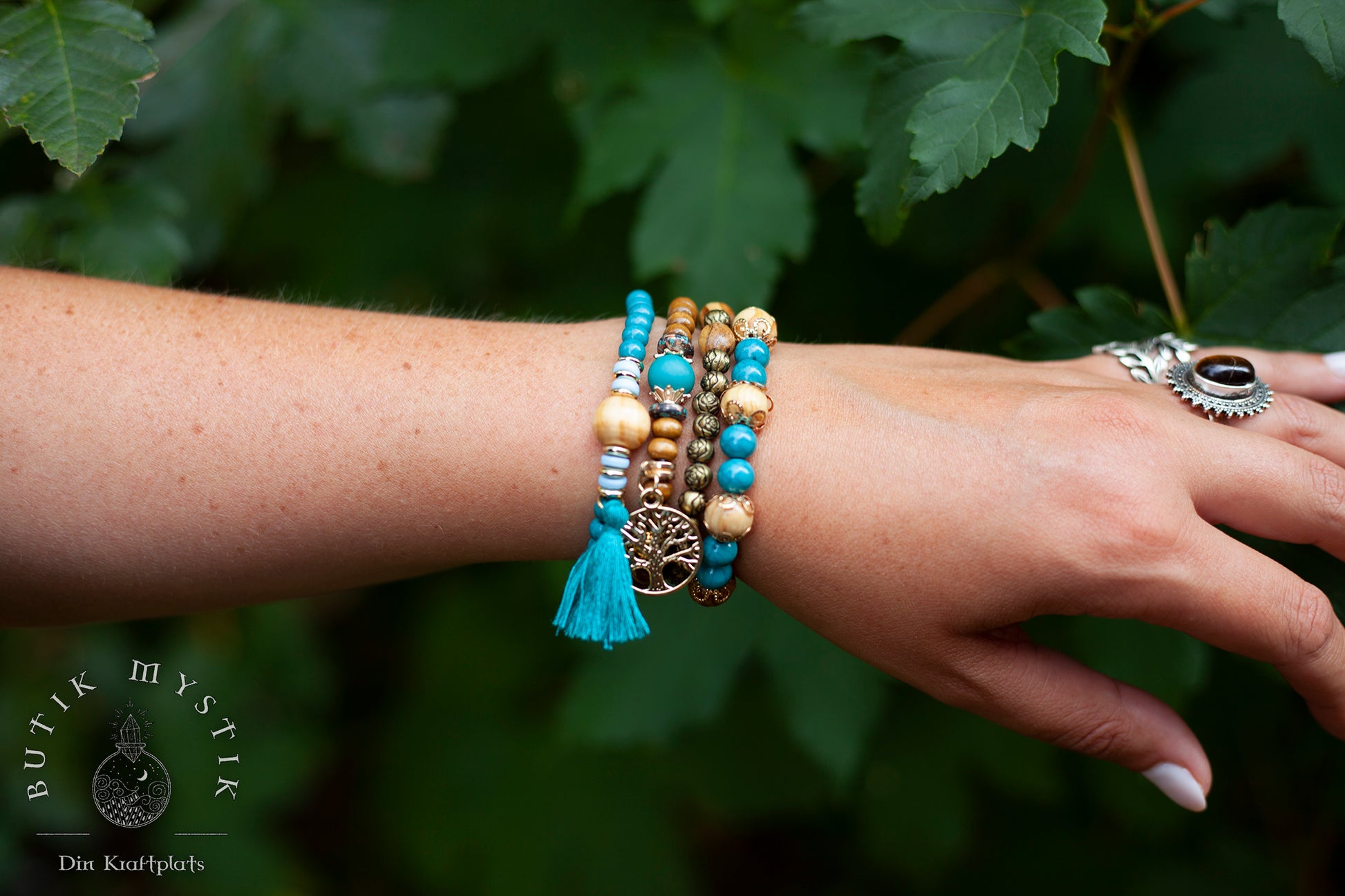 Elastiskt armband med trä och mässingpärlor, samt berlock med träd. Kommer i ett set av 4 olika armband.