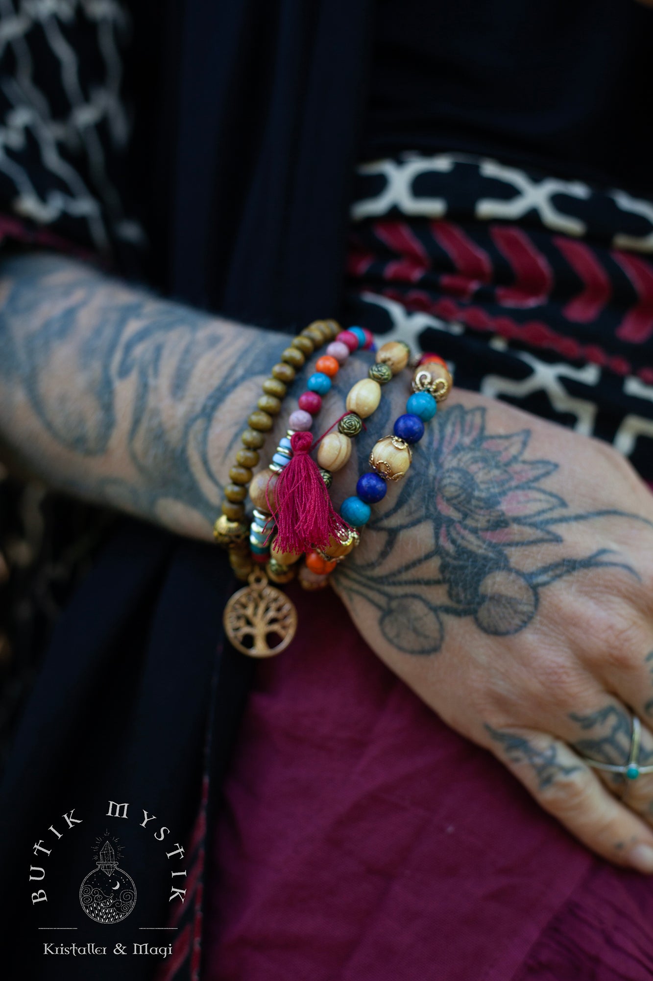 Elastiskt armband med trä och mässingpärlor, samt berlock med träd. Kommer i ett set av 4 olika armband.