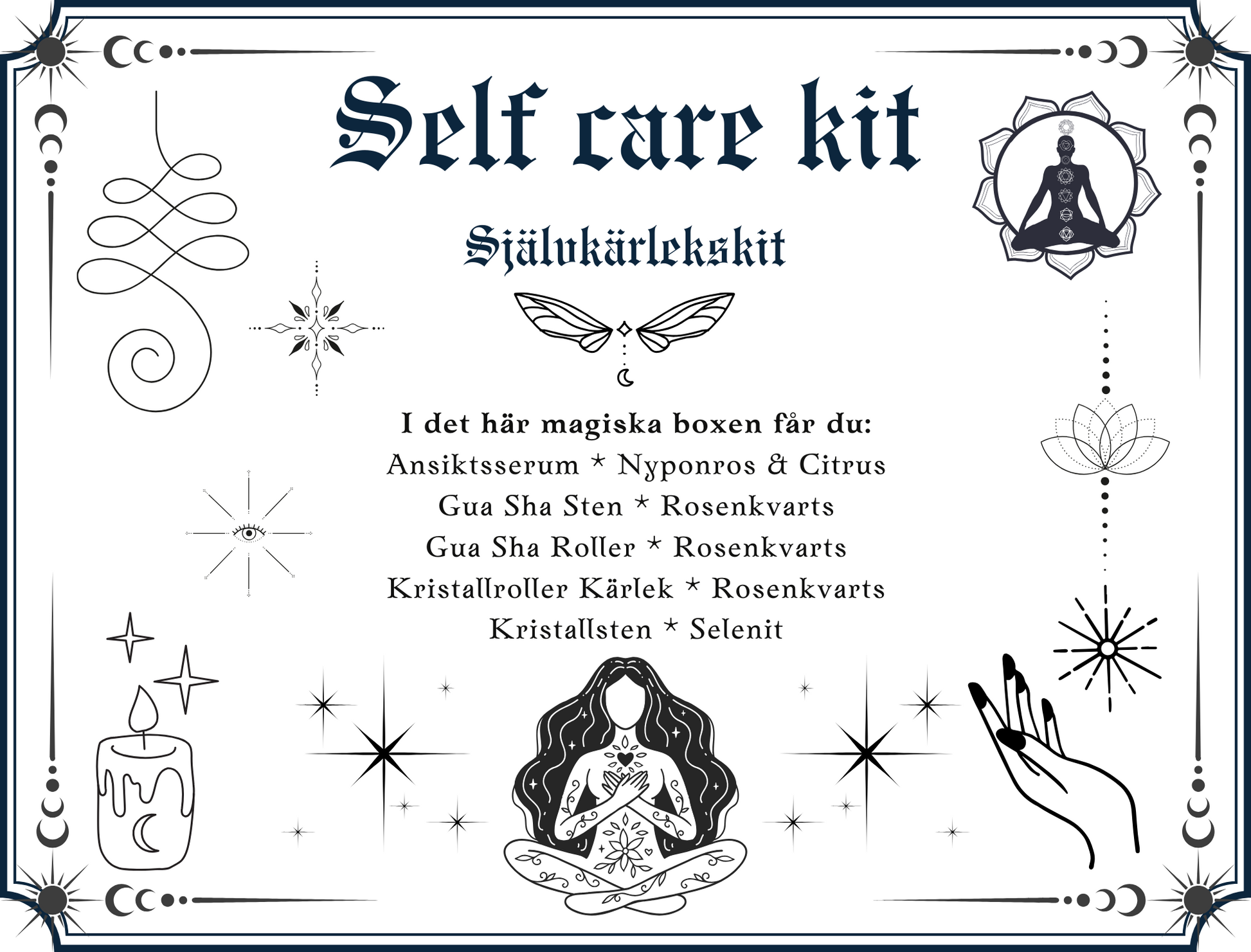 Den här självkärlekskit är ett perfekt sätt att unna dig själv eller ge bort till någon du tycker om. Skapa tid för återhämtning, självkärlek och harmoni med dessa magiska produkter.