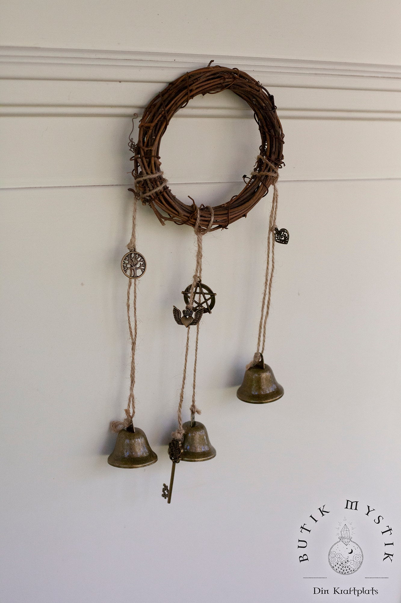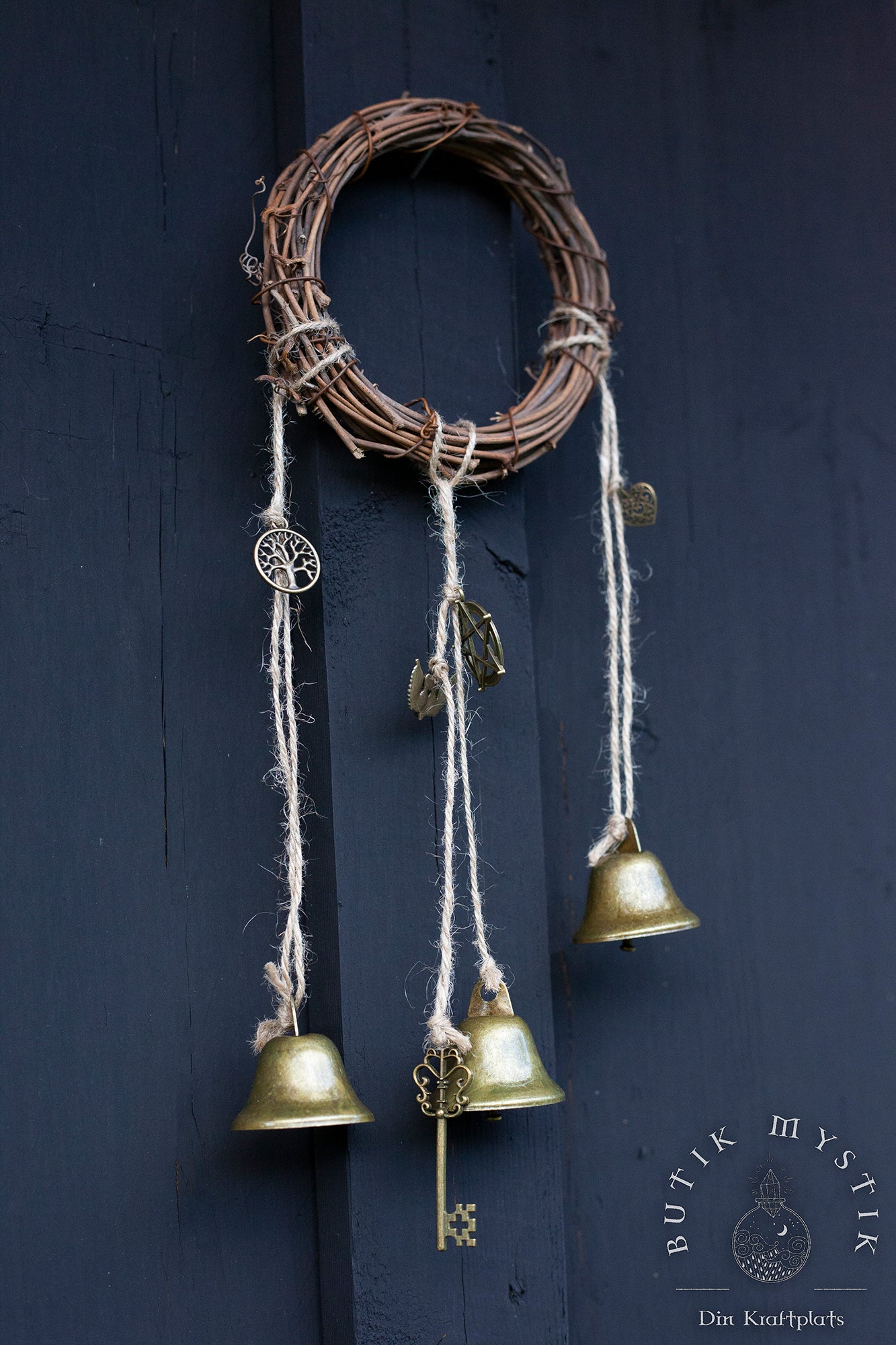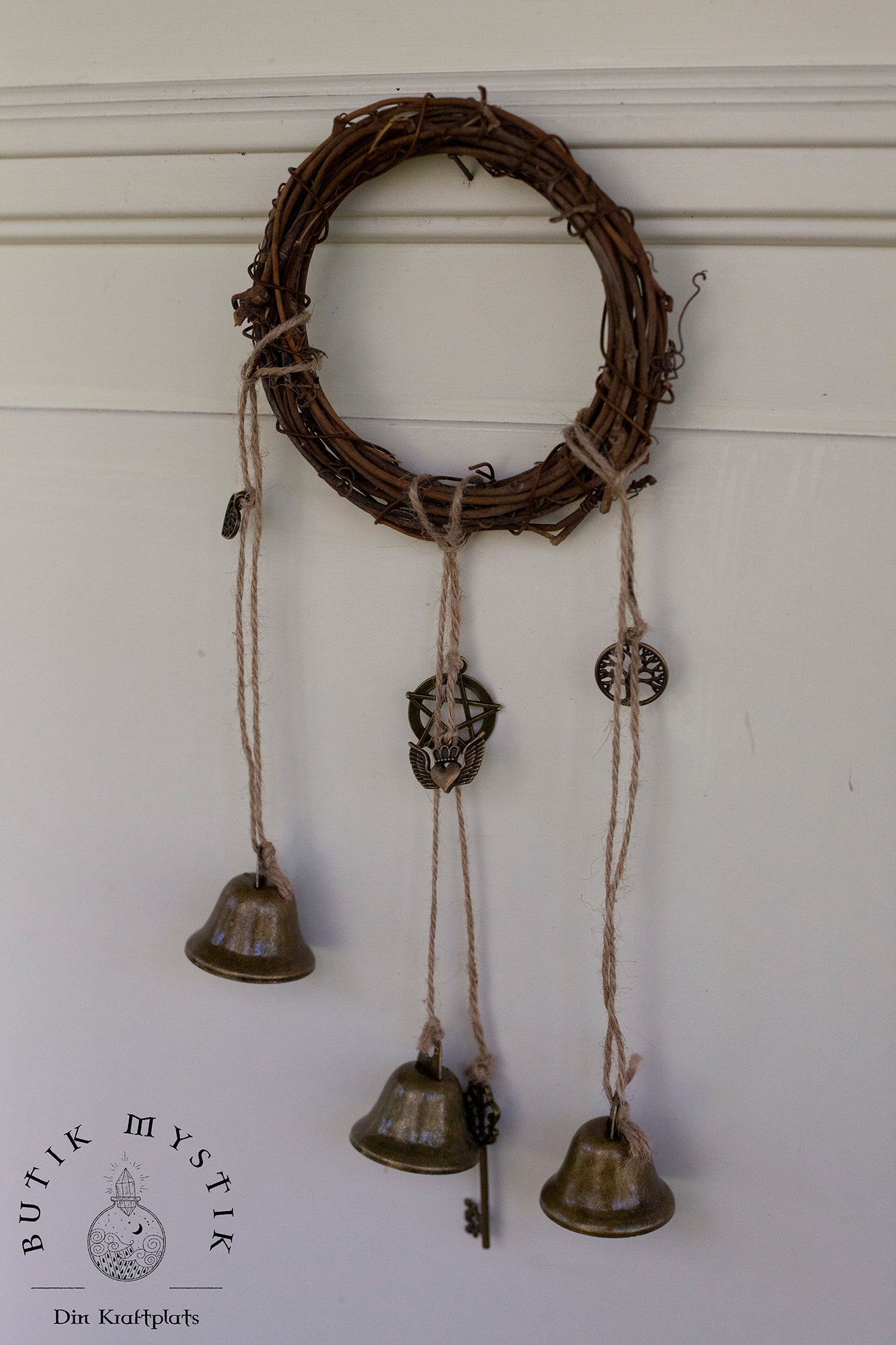 Superläcker dörrkrans i trä dekorerad med bjällror, pentagram, nycklar och andra symboler i mässing.