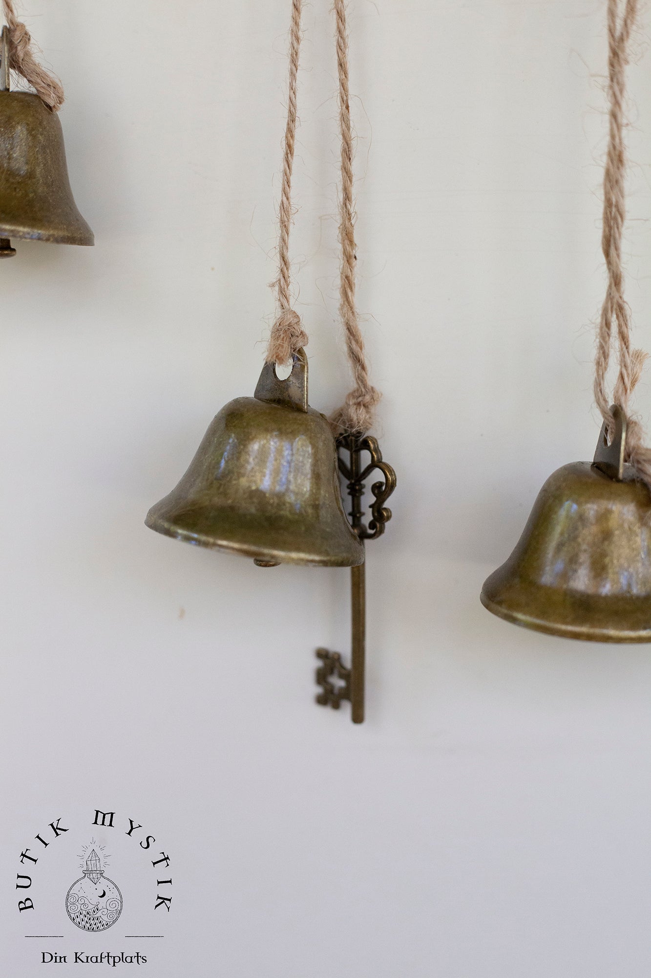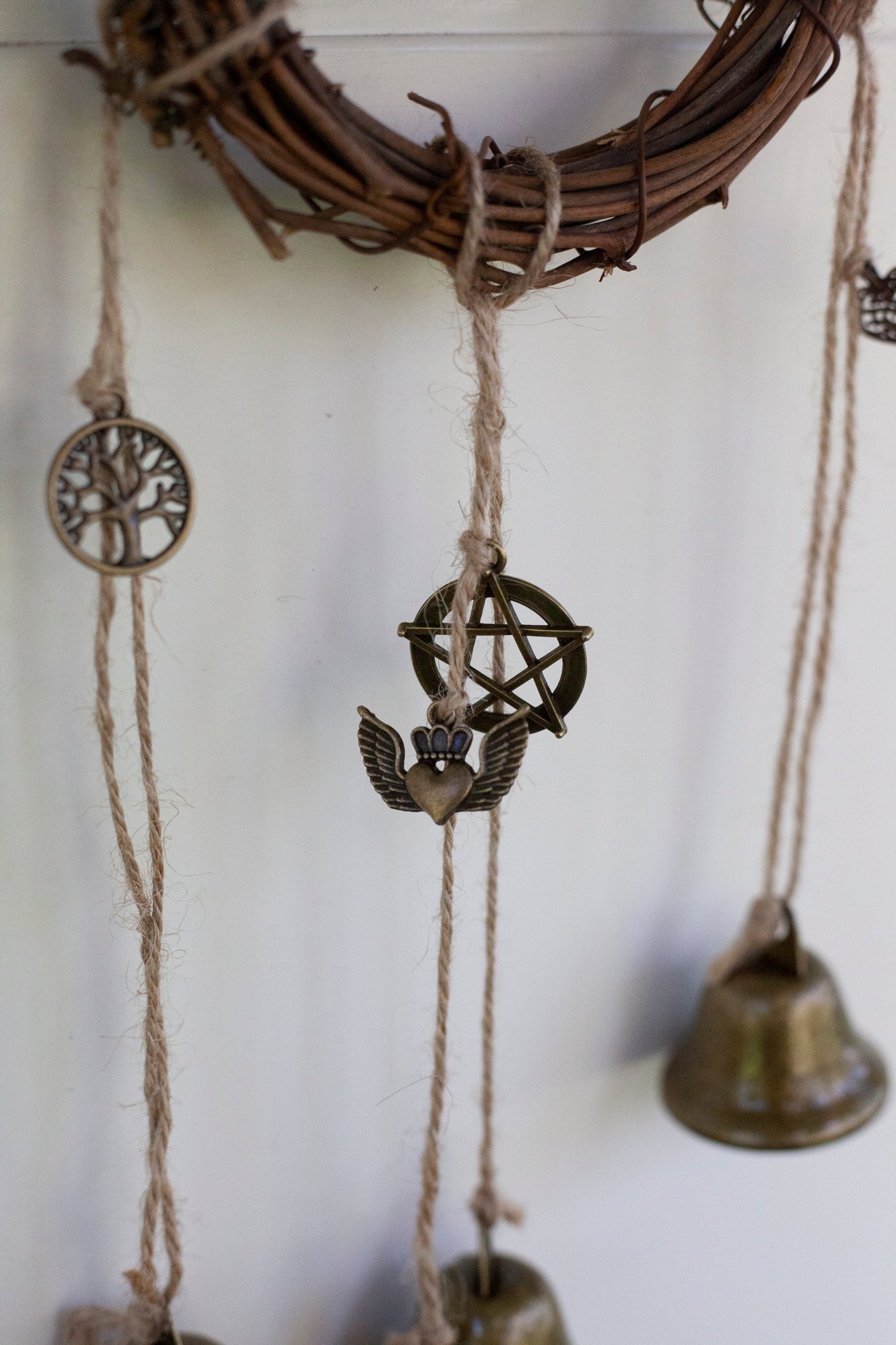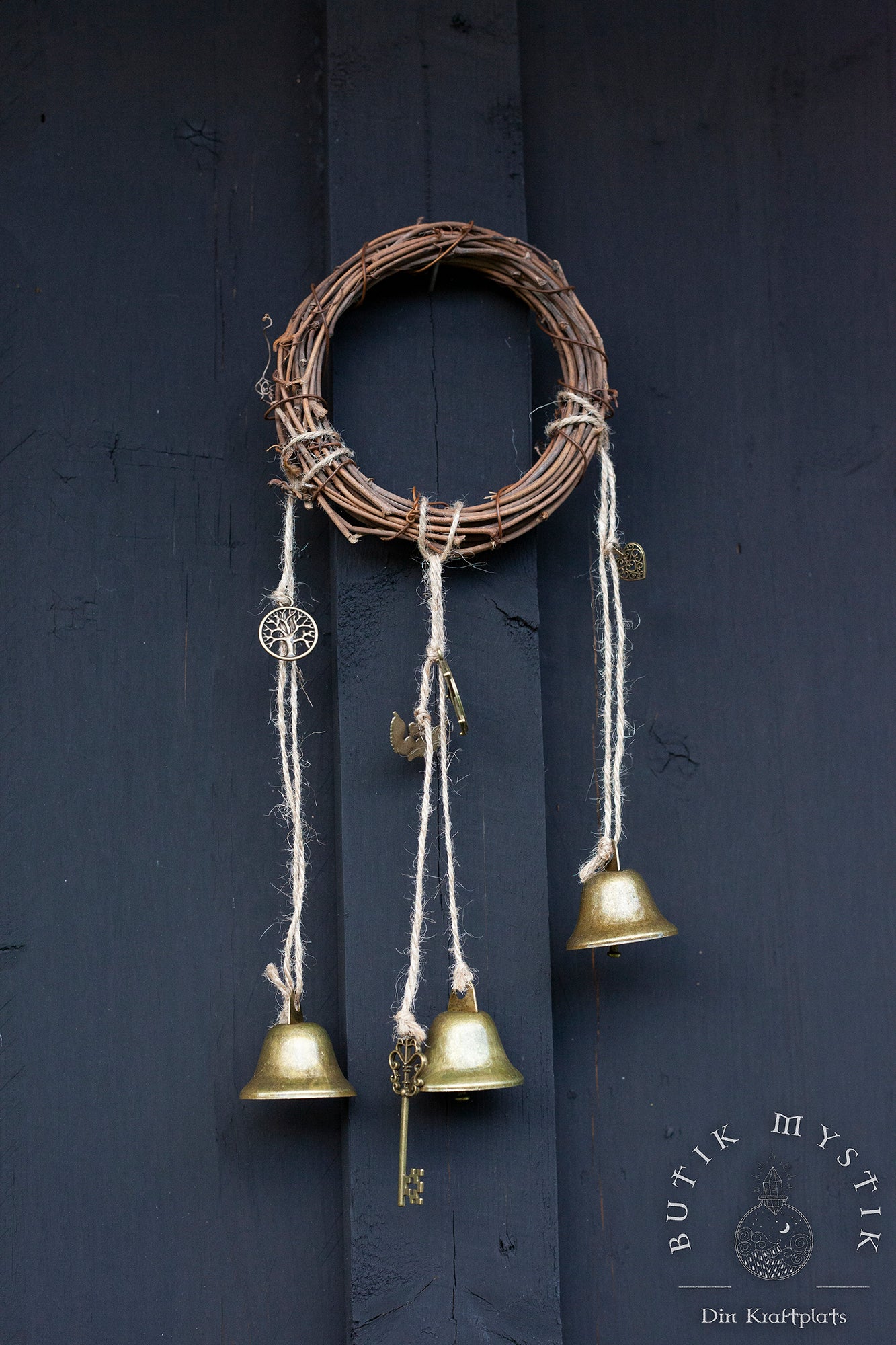 Superläcker dörrkrans i trä dekorerad med bjällror, pentagram, nycklar och andra symboler i mässing.