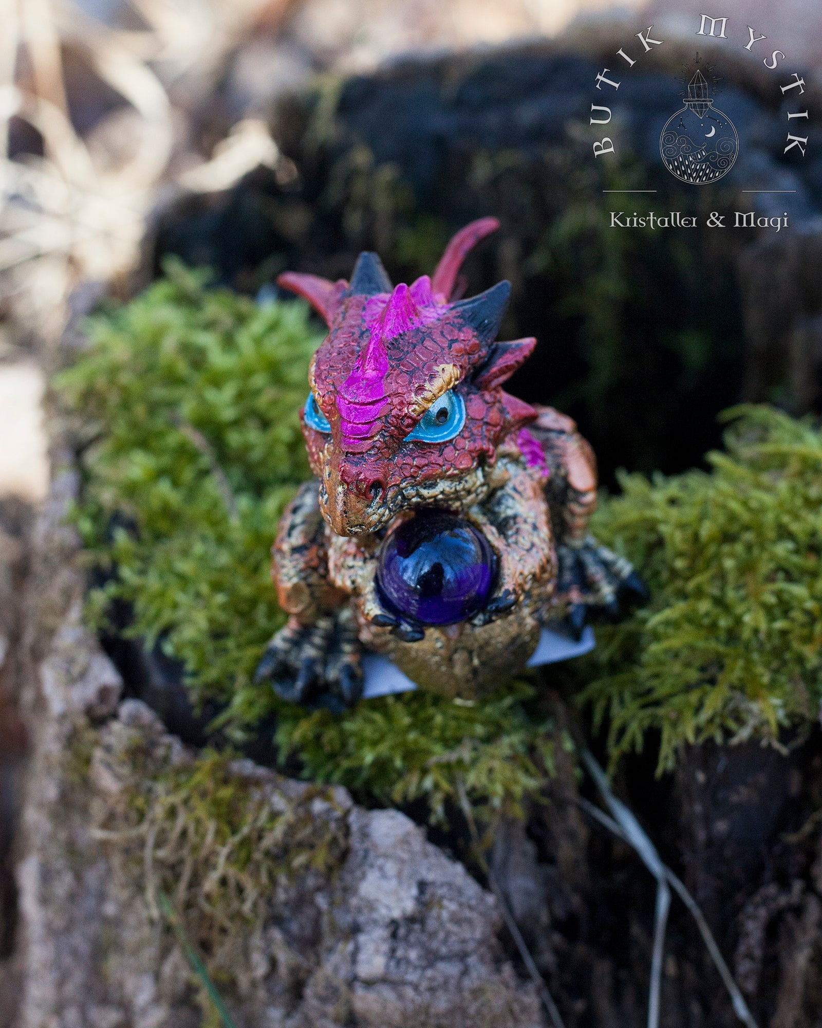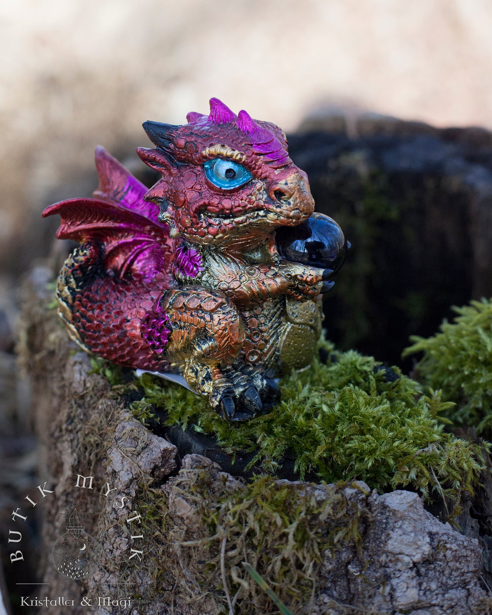 Denna lilla drake, med sina gnistrande ögon och fjäll som skimrar i ljuset, håller varsamt en kristallkula som verkar innehålla en värld av magi.