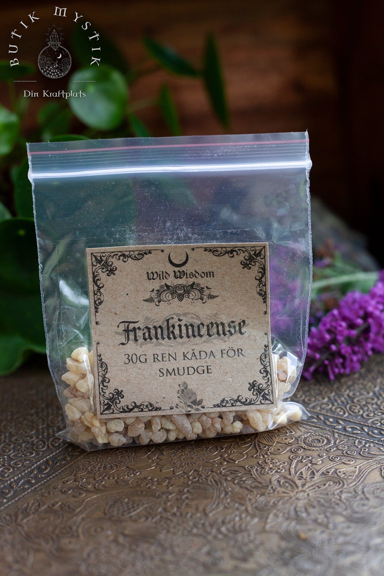 Frankincense är en renande kåda från Boswellia-trädet med antiinflammatoriska och lugnande egenskaper. Bränn den för att rena chakran och skapa balans. Använd den för meditation, shamanskt arbete och energirensning i hemmet eller på personer.