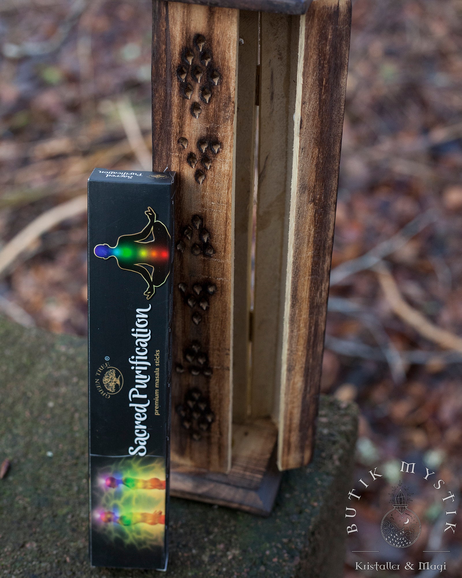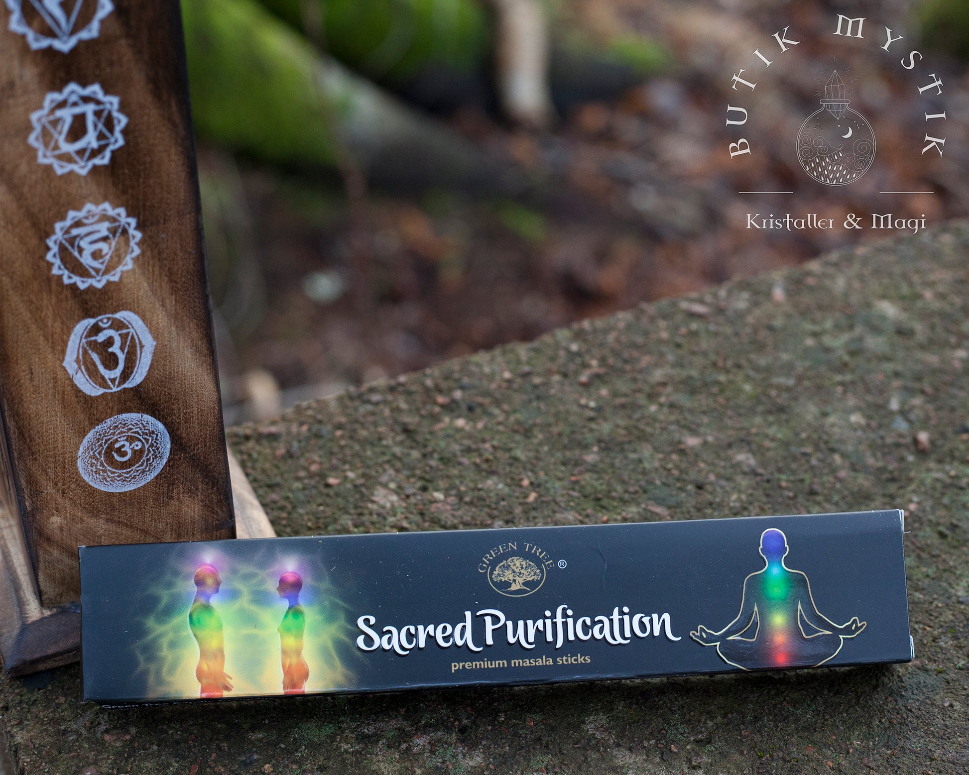 Sacred Purification som betyder Helig Rening, är en rökelse som är designad för att rena och balansera energier i rummet. Med sin rena och friska doft, kombinerar den naturliga ingredienser som främjar en känsla av renhet och andlig klarhet. Den används ofta för att skapa en helande atmosfär och fördjupa meditation eller andlig praktik. Sacred Purification hjälper till att rensa bort negativa energier och skapa en positiv, harmonisk miljö i hemmet eller vid meditationsstunder.