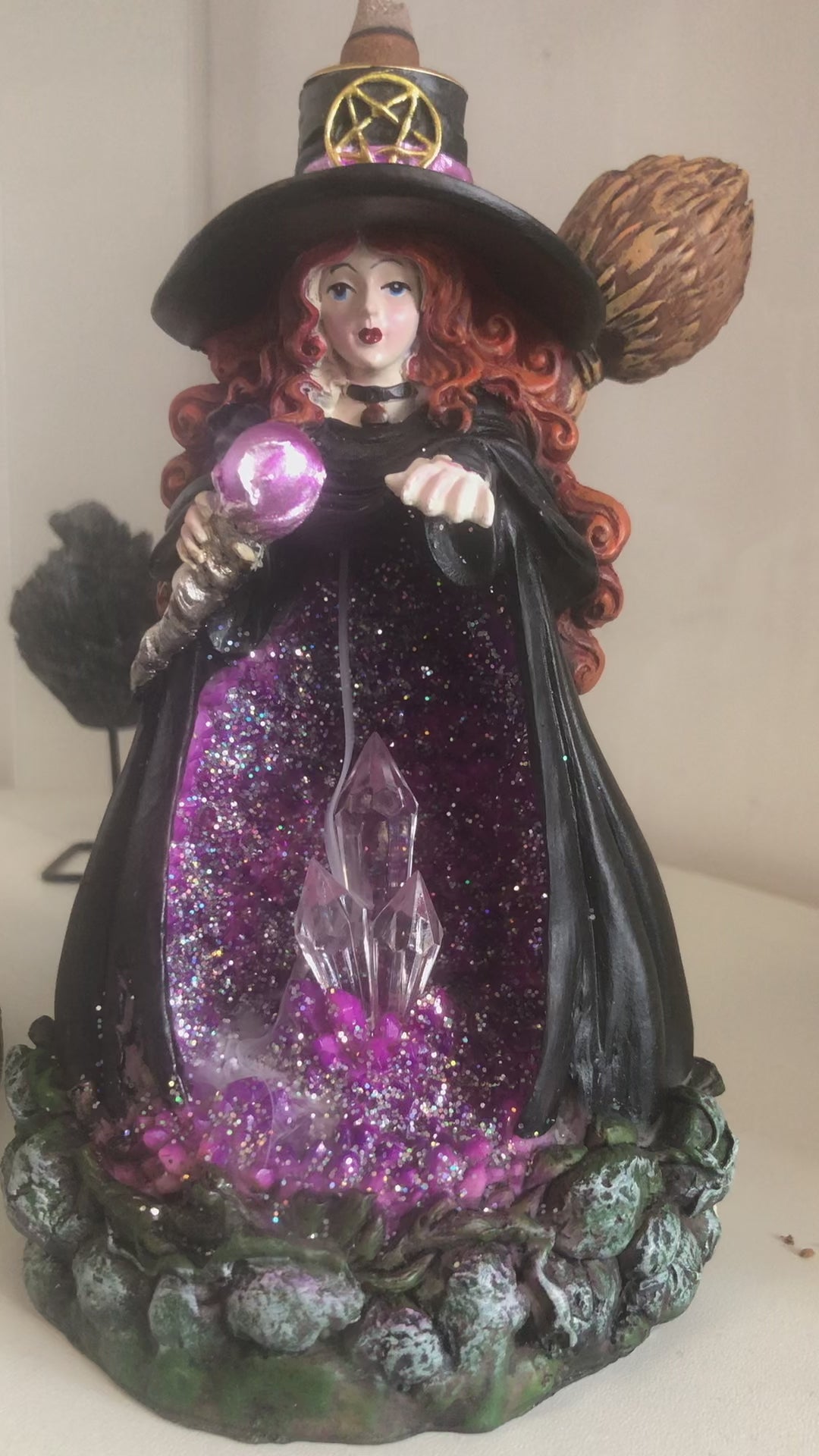 Backflowrökelse strömmar ner genom hatten på häxan och "rinner" ner in i brännaren som ett vattenfall.