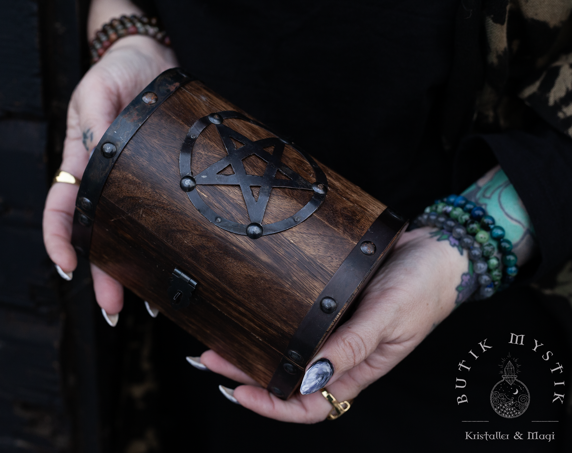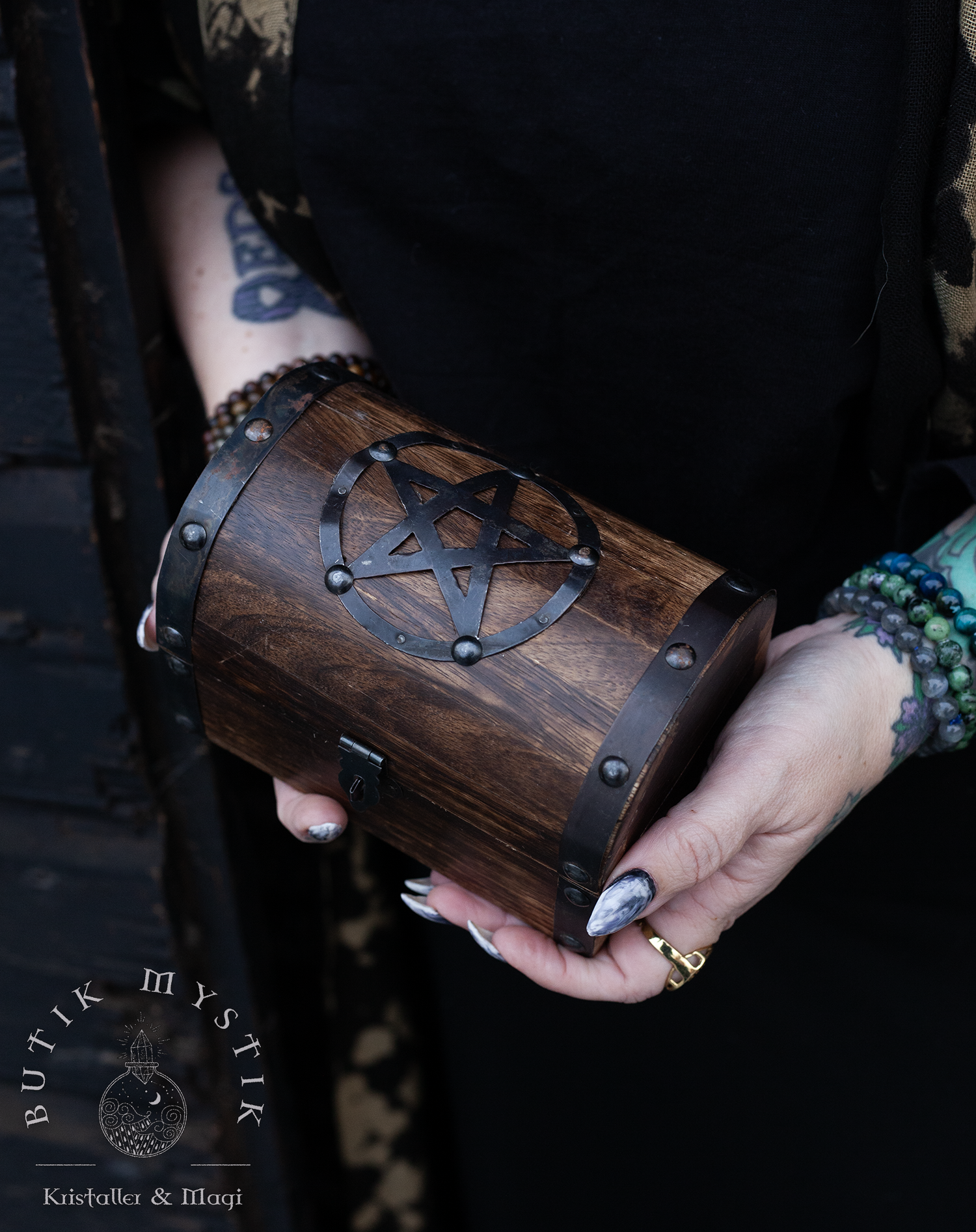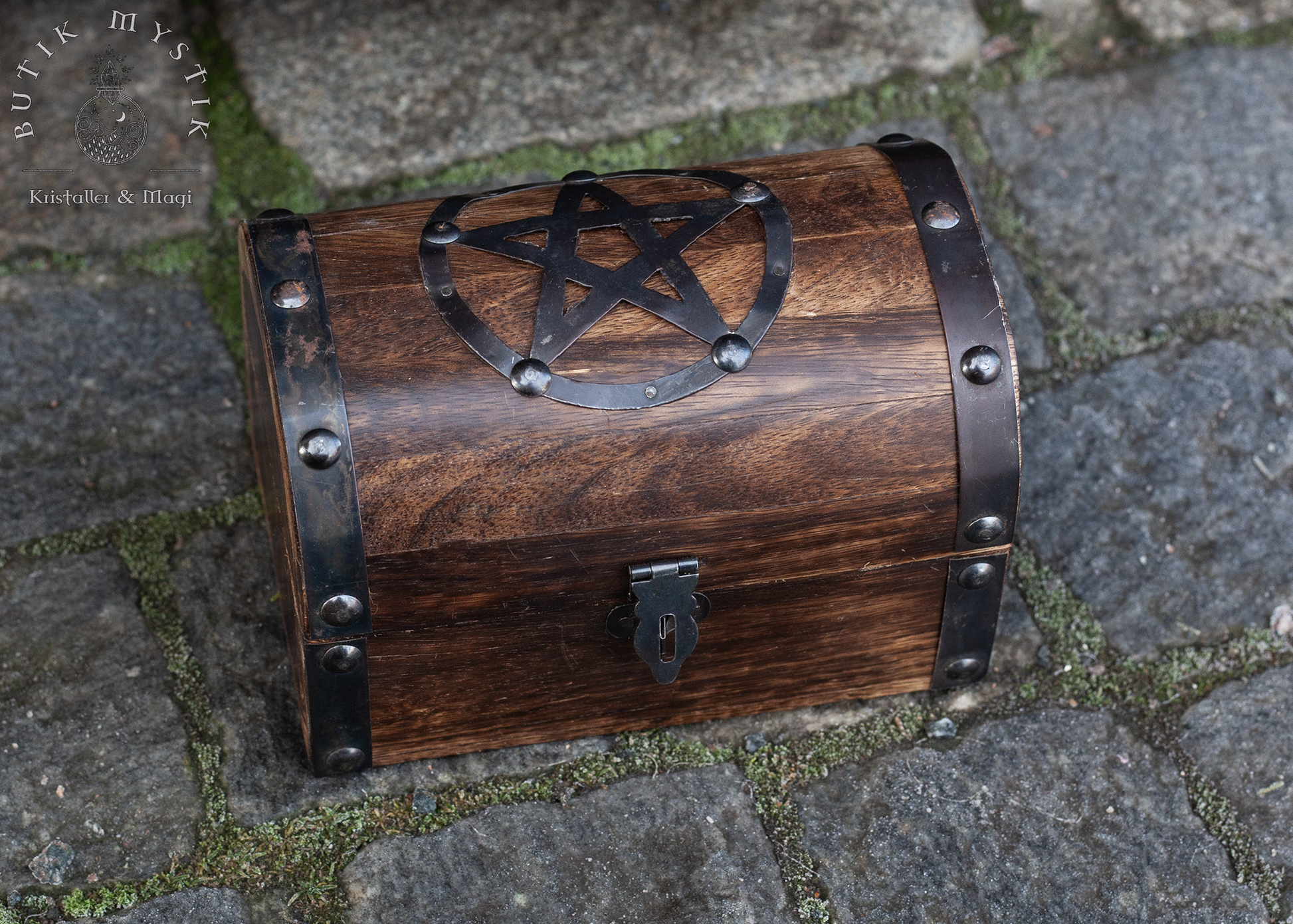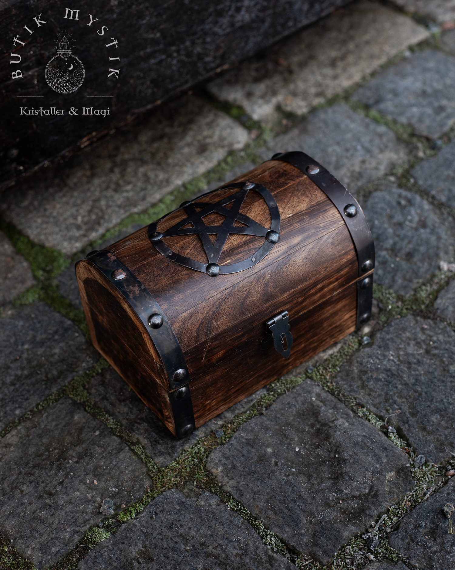 Den eleganta trä-kistan, med metallbeslag, berättar historier om svunna tider, och den robusta konstruktionen vittnar om hantverksskicklighet. På kistans lock pryder ett intrikat pentagram, som ger en mystisk aura till hela föremålet. Pentagram symboliserar balans mellan de fyra elementen och skydd mot det onda.