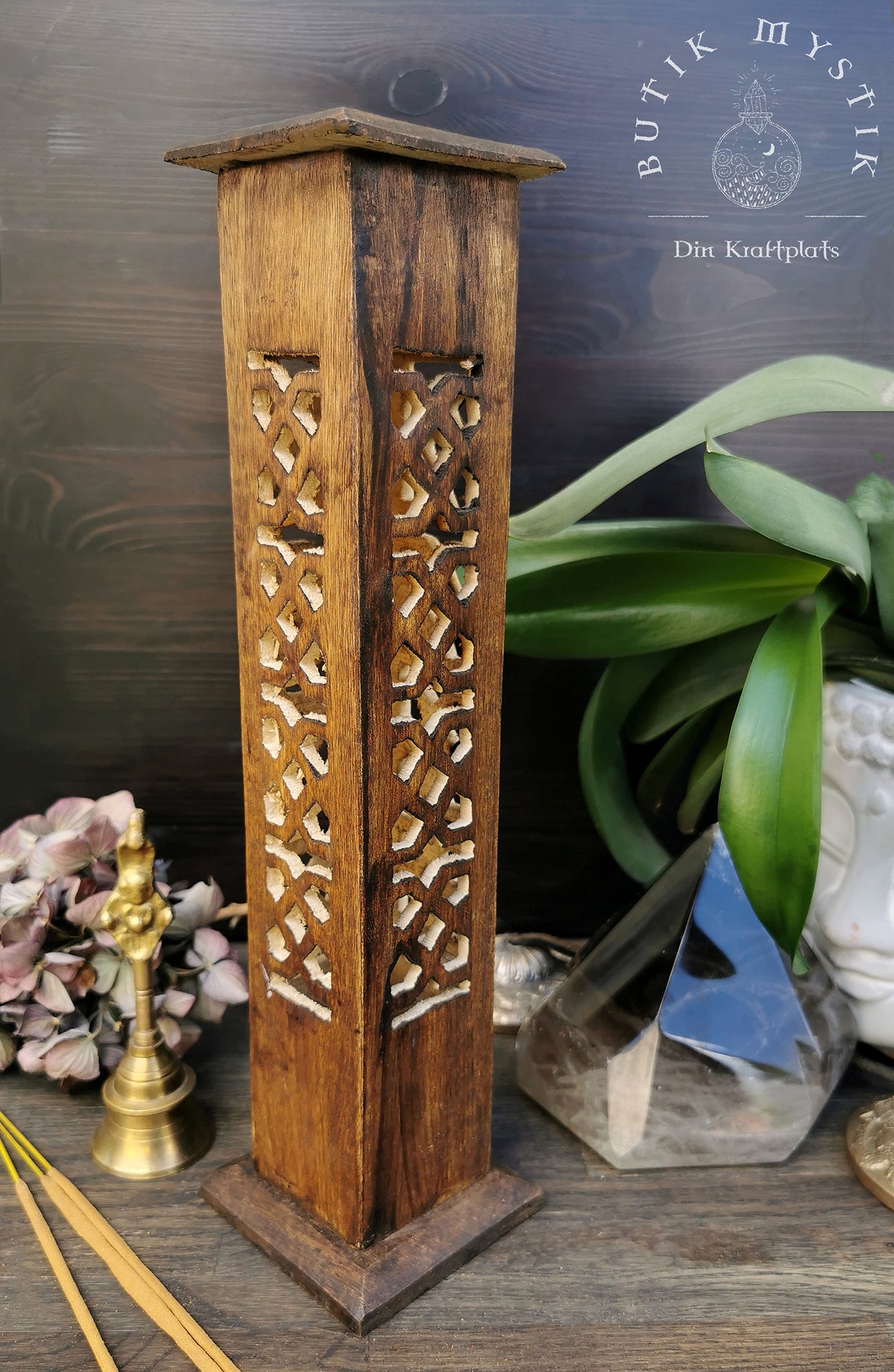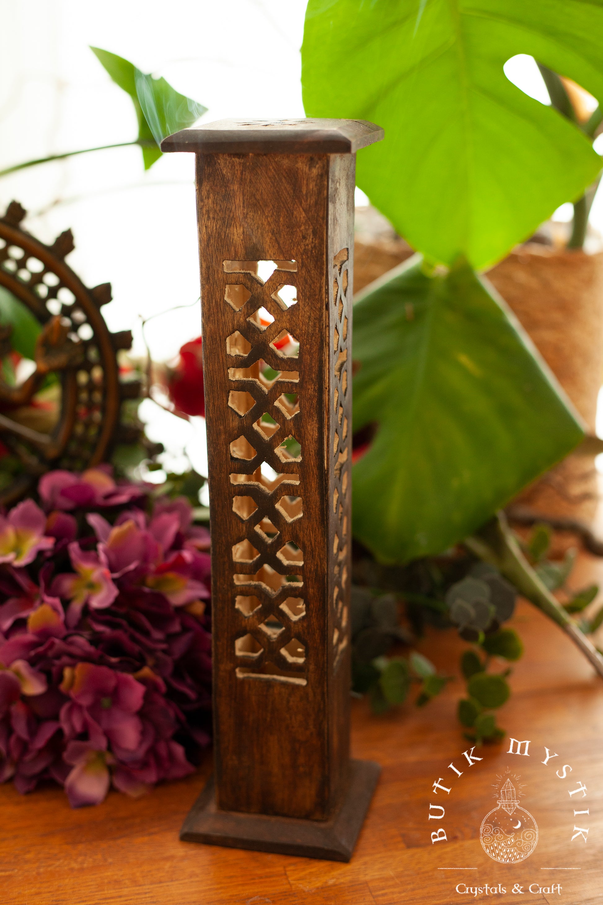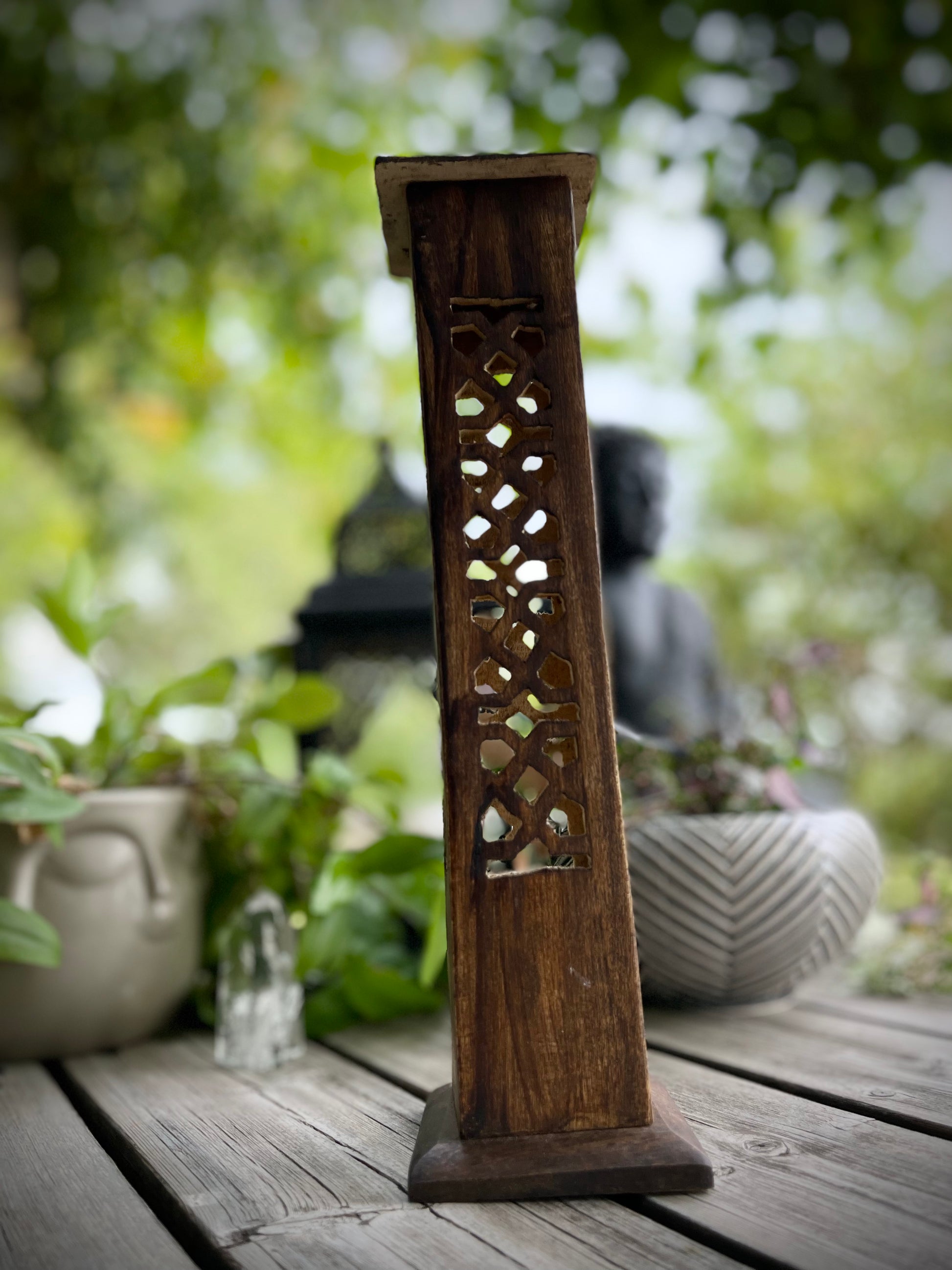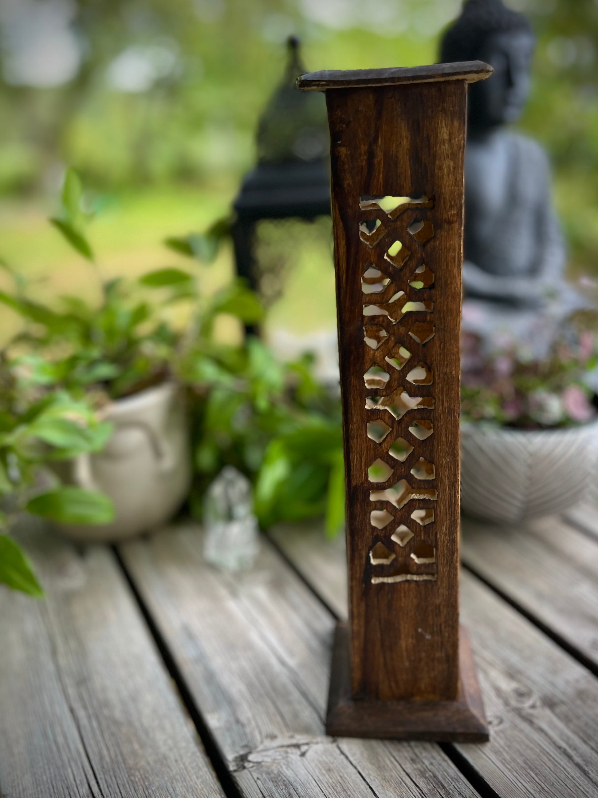 Denna rökelsebrännare är handsnidad i Indien. Den snidade utskärningar får röken sippra ut vackert. Var och en av de fyra sidorna är huggen i en vacker design. Trätornet kan bränna fyra rökelsepinnar åt gången samt en rökelsekon. Mycket lätt att rengöra.