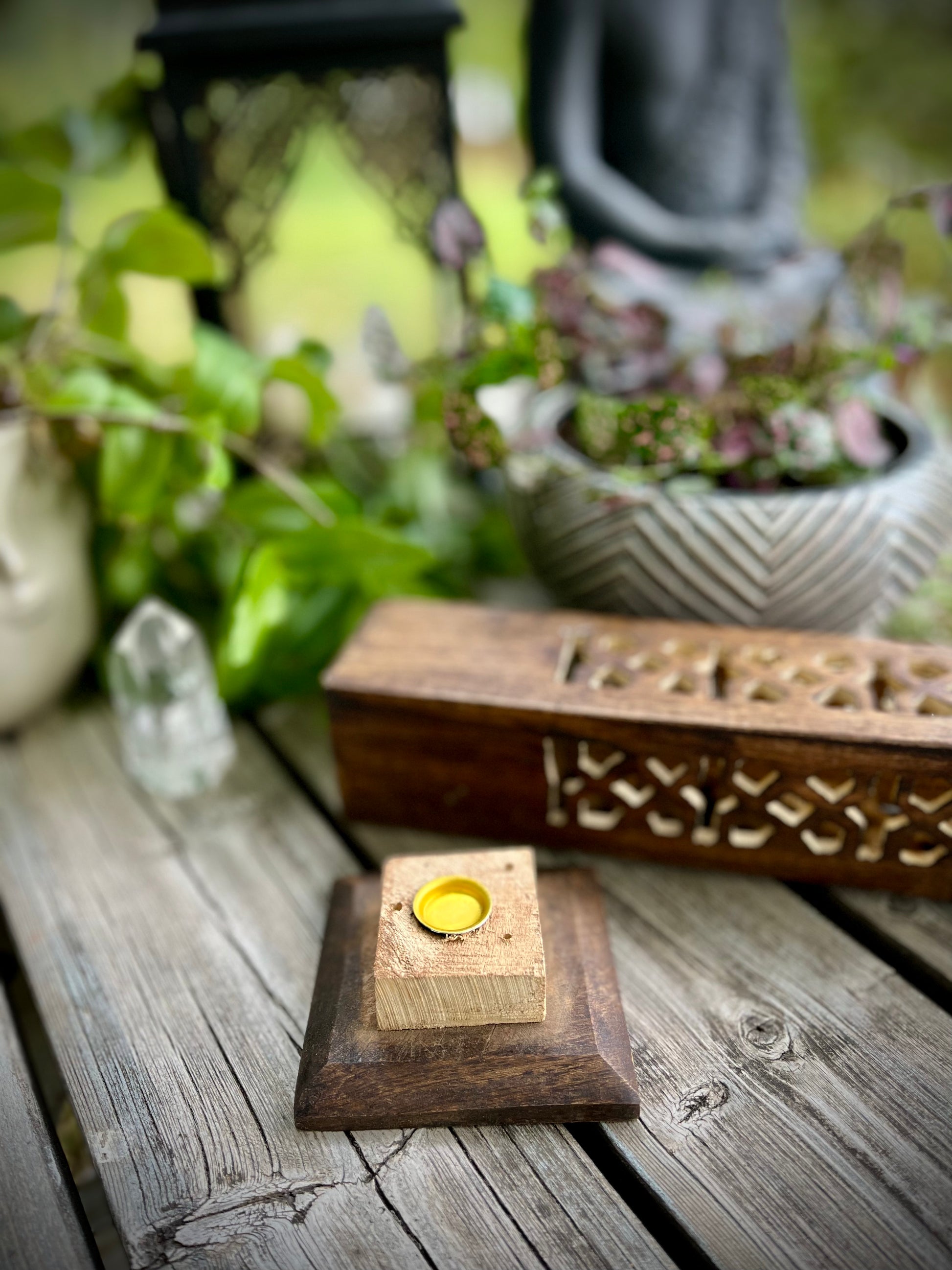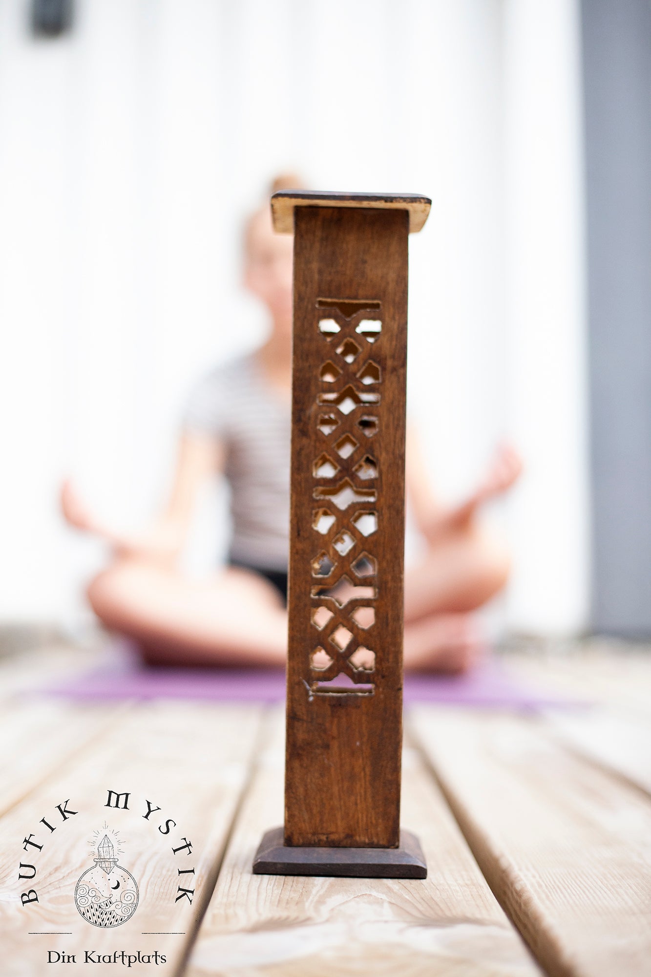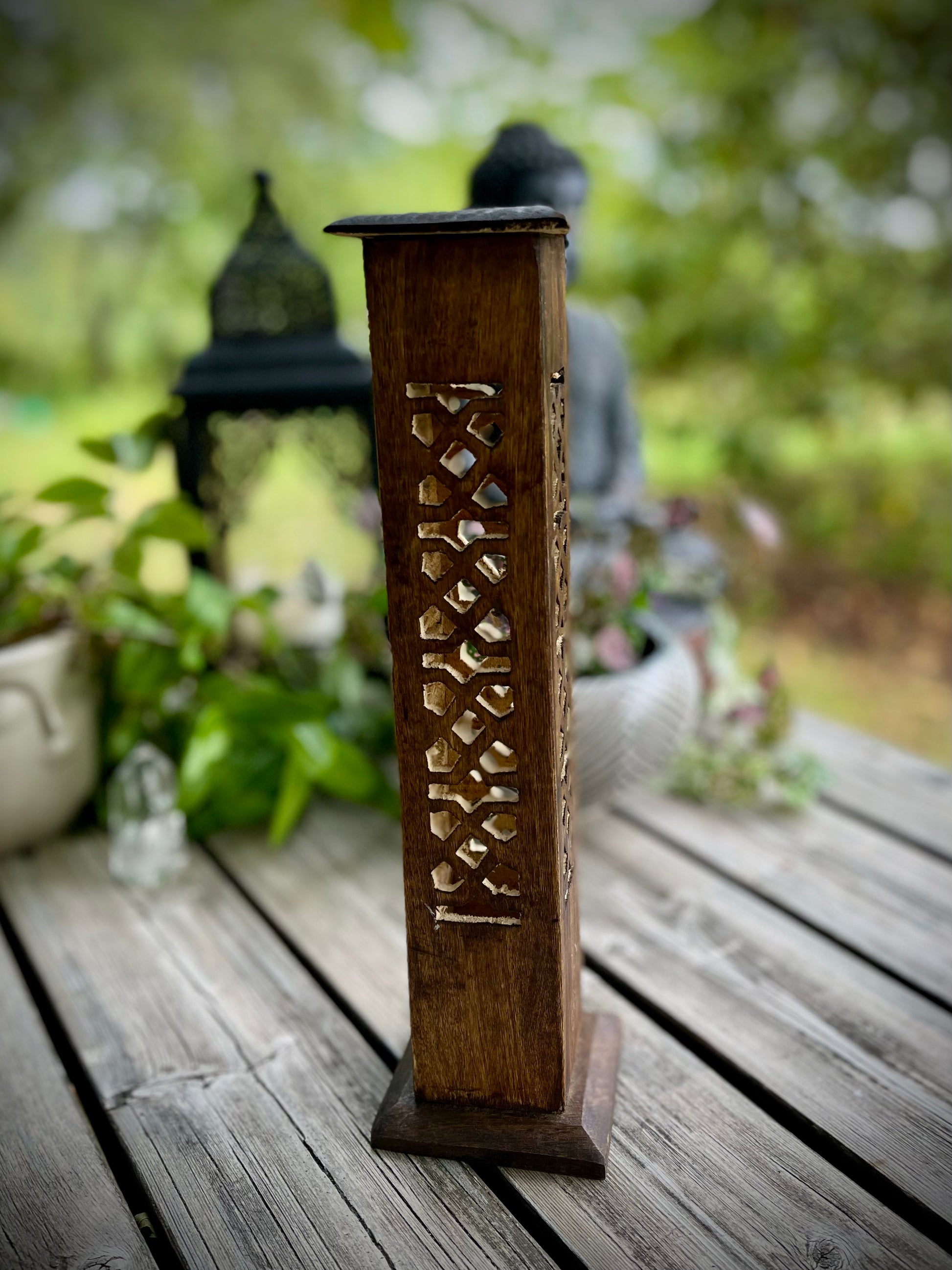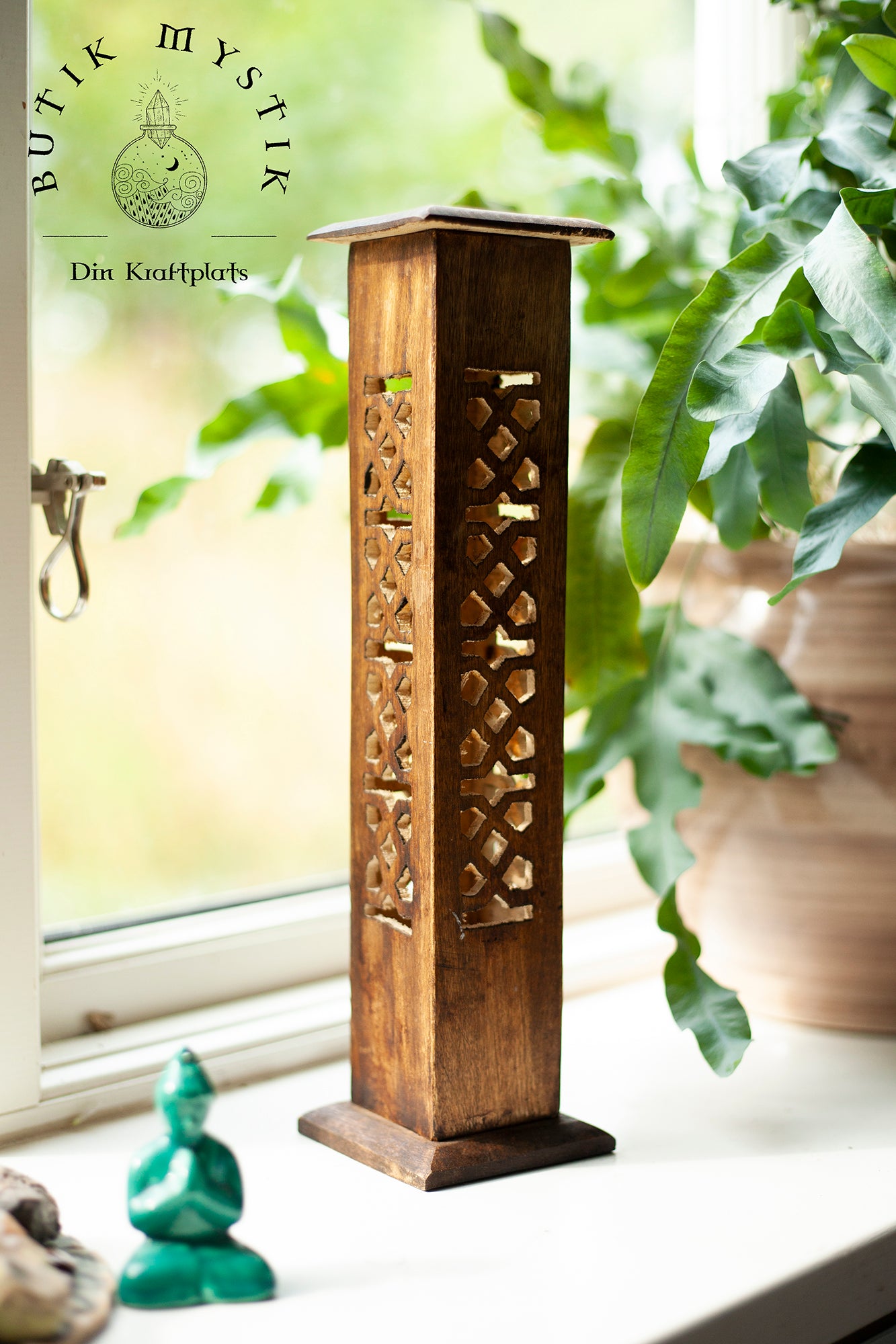 Denna rökelsebrännare är handsnidad i Indien. Den snidade utskärningar får röken sippra ut vackert. Var och en av de fyra sidorna är huggen i en vacker design. Trätornet kan bränna fyra rökelsepinnar åt gången samt en rökelsekon. Mycket lätt att rengöra.