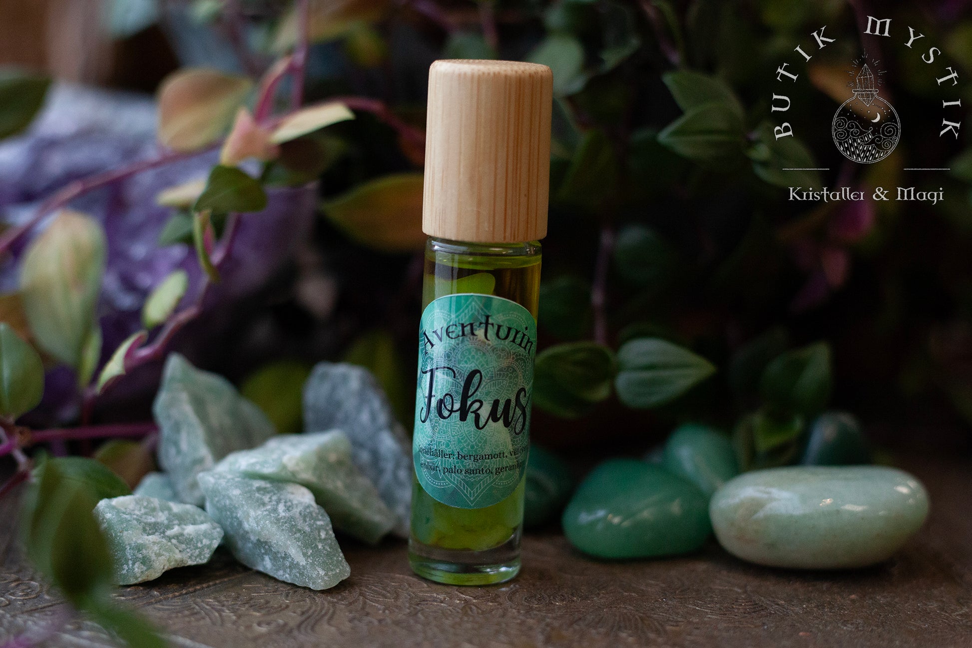 Kristallroller med grön aventurin och eteriska oljor, en blandning av stenar och oljor för att öka din fokus och motivation.
