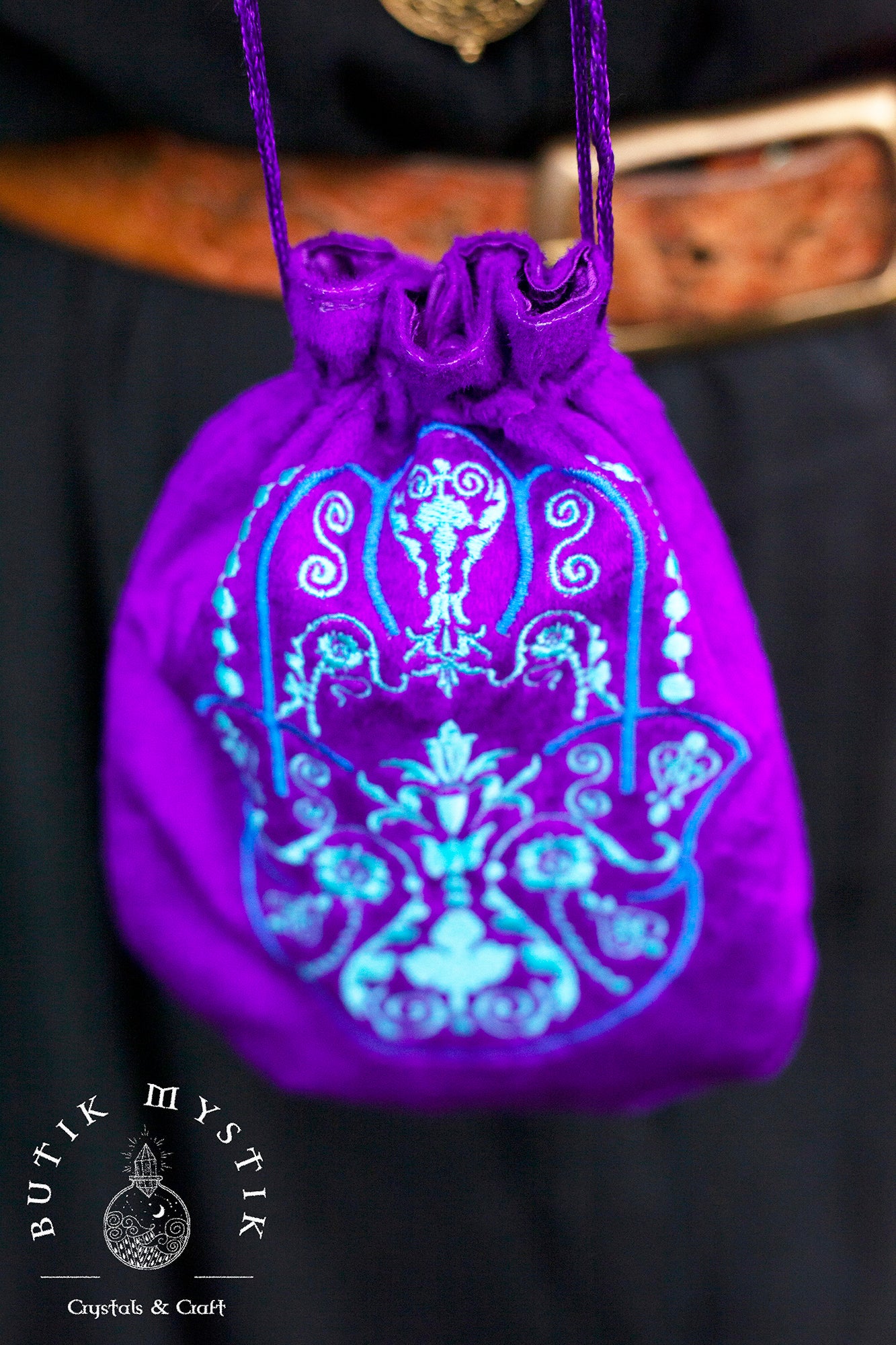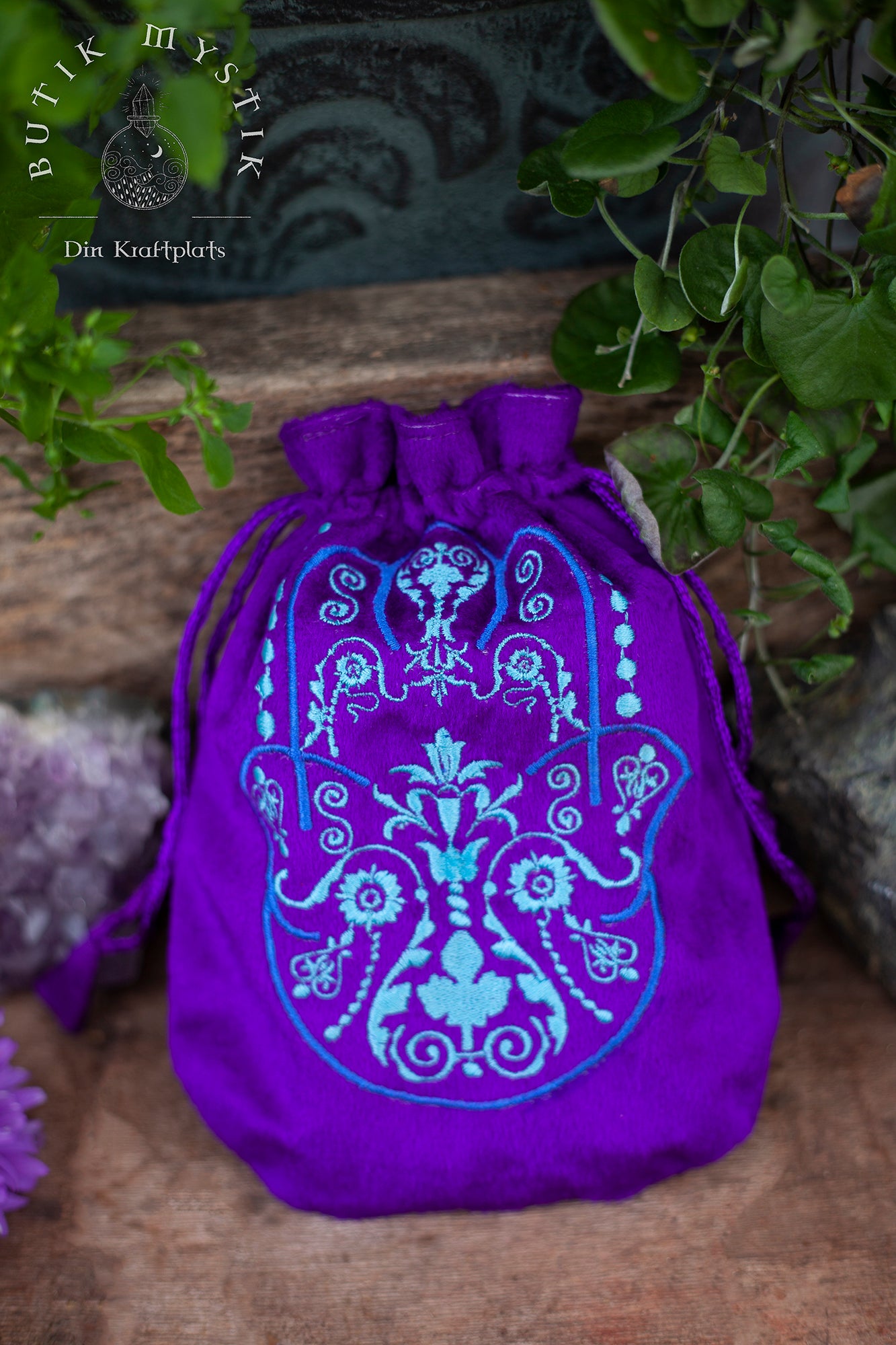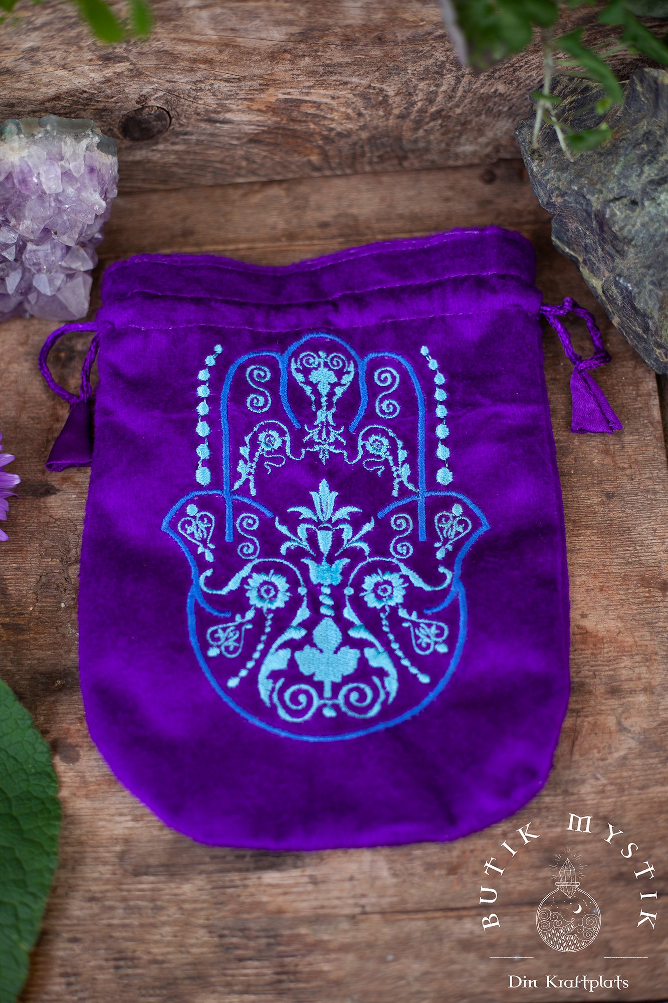 Lila Tarotkortspåse i sammet - Broderad med Fatimas hand