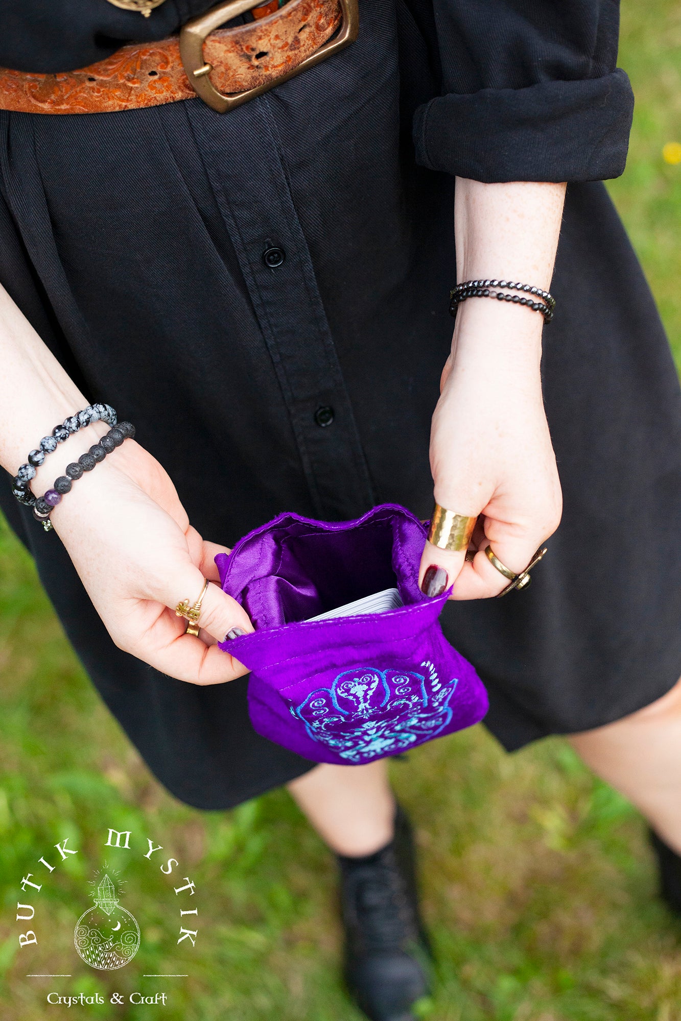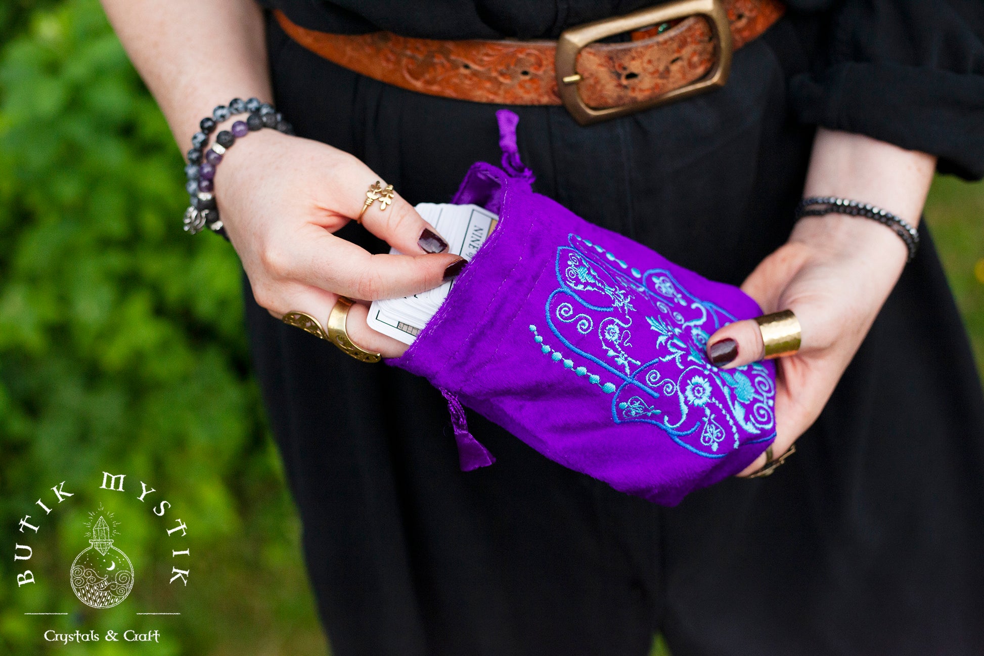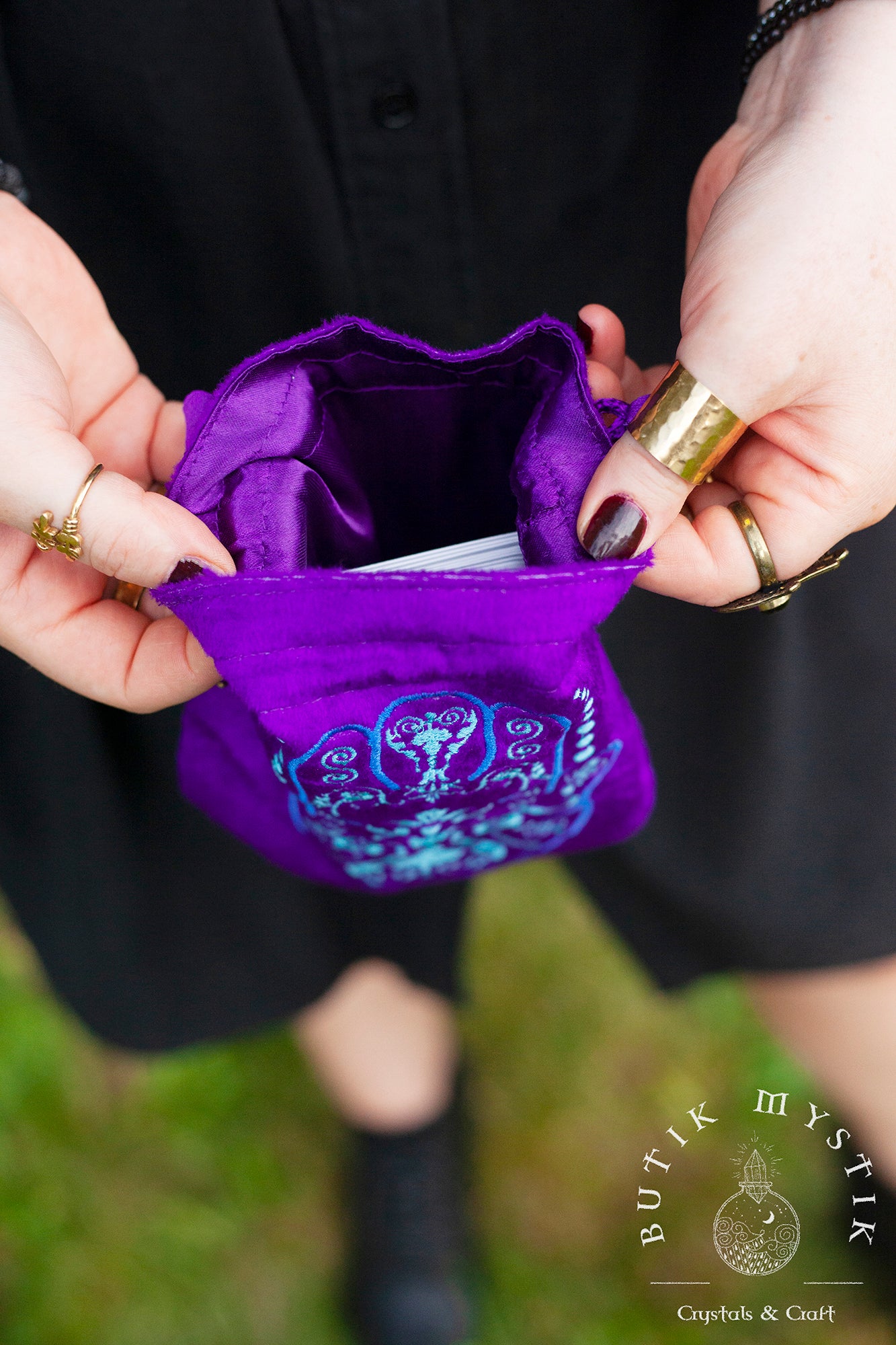 Lila Tarotkortspåse i sammet - Broderad med Fatimas hand
