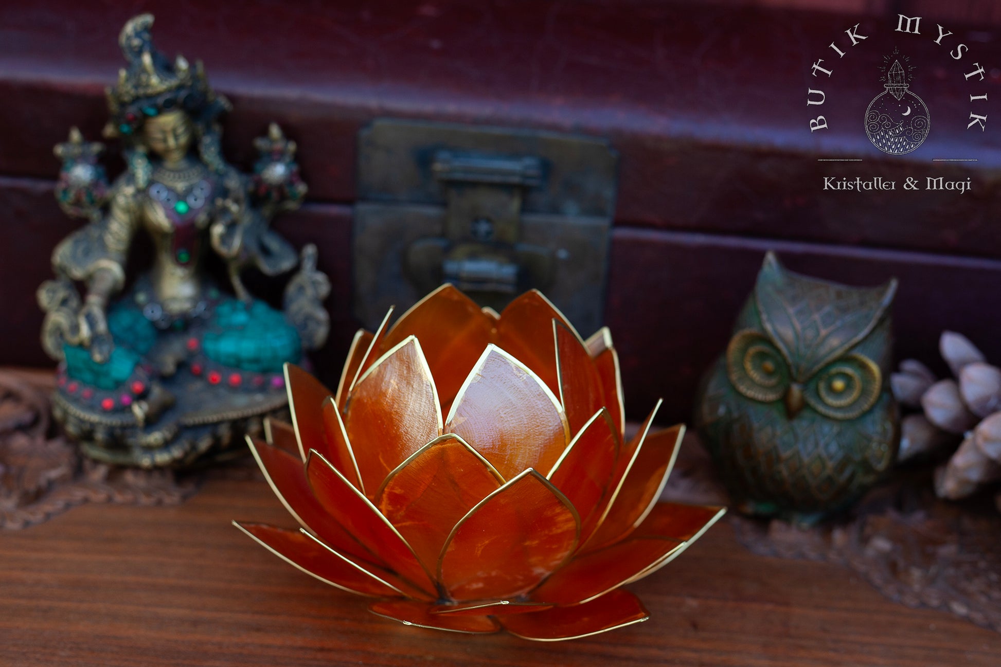 Hantverkare i Filippinerna tillverkar vår värmeljushållare för hand i en tidskrävande process som kräver skörd, blötläggning, mjukning, skärning och böjning av varje skal. Delarna arrangeras sedan konstfullt i en handmålad guldmetallram för att skapa en vit lotusblomma, som är en symbol för kärlek och hängivenhet i många sydasiatiska länder.