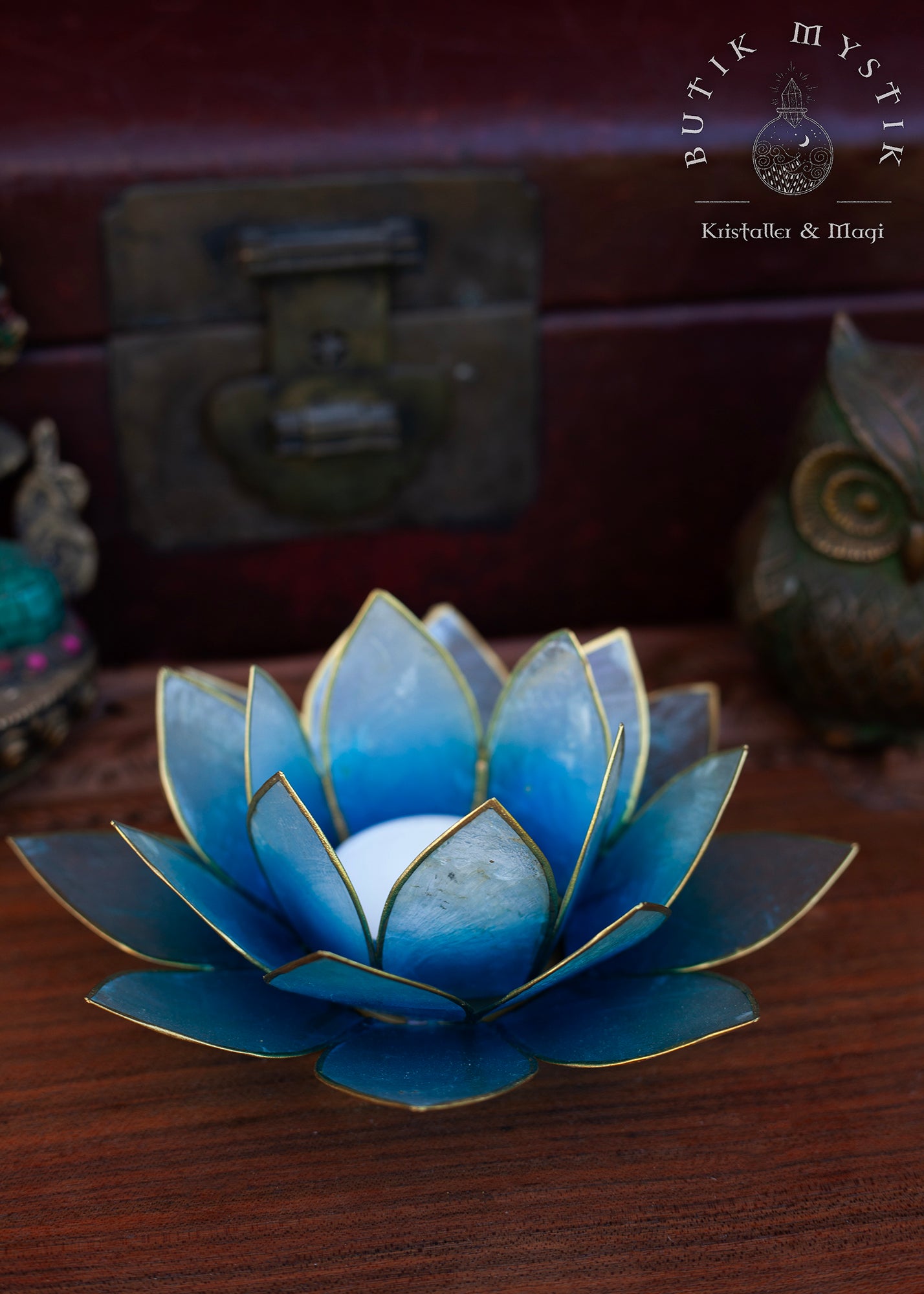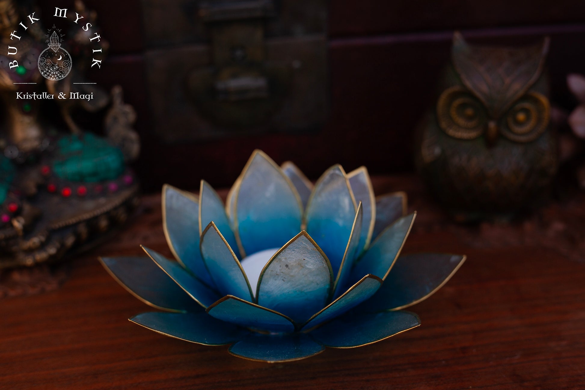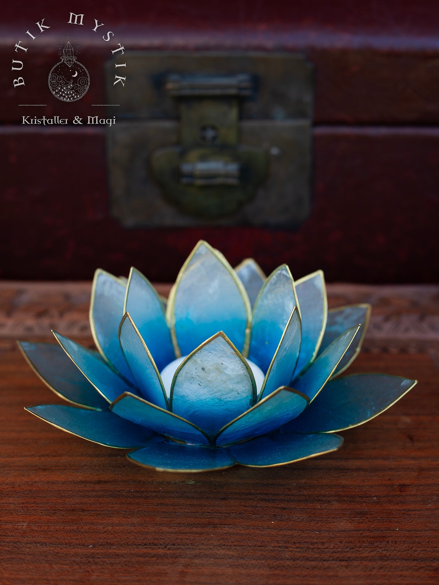 Hantverkare i Filippinerna tillverkar vår värmeljushållare för hand i en tidskrävande process som kräver skörd, blötläggning, mjukning, skärning och böjning av varje skal. Delarna arrangeras sedan konstfullt i en handmålad guldmetallram för att skapa en vit lotusblomma, som är en symbol för kärlek och hängivenhet i många sydasiatiska länder.