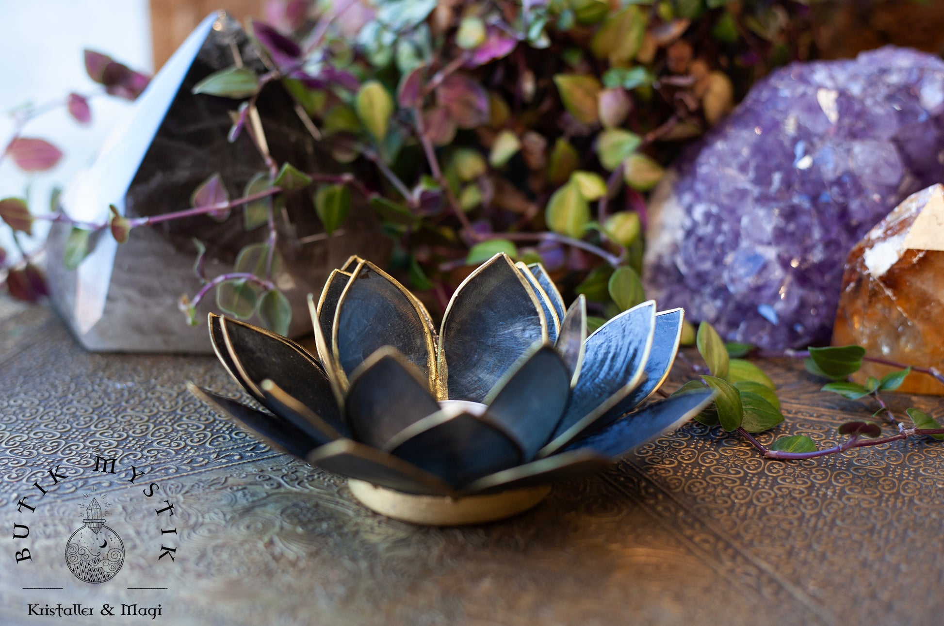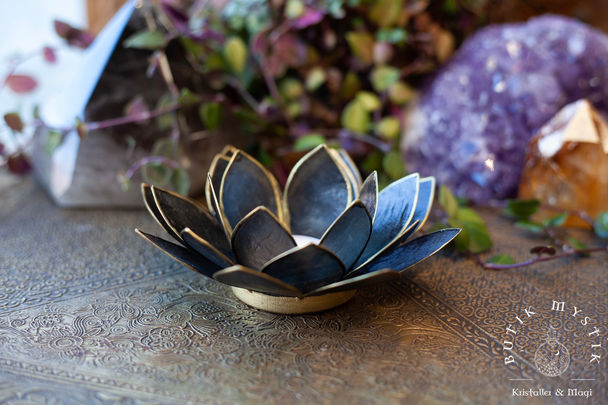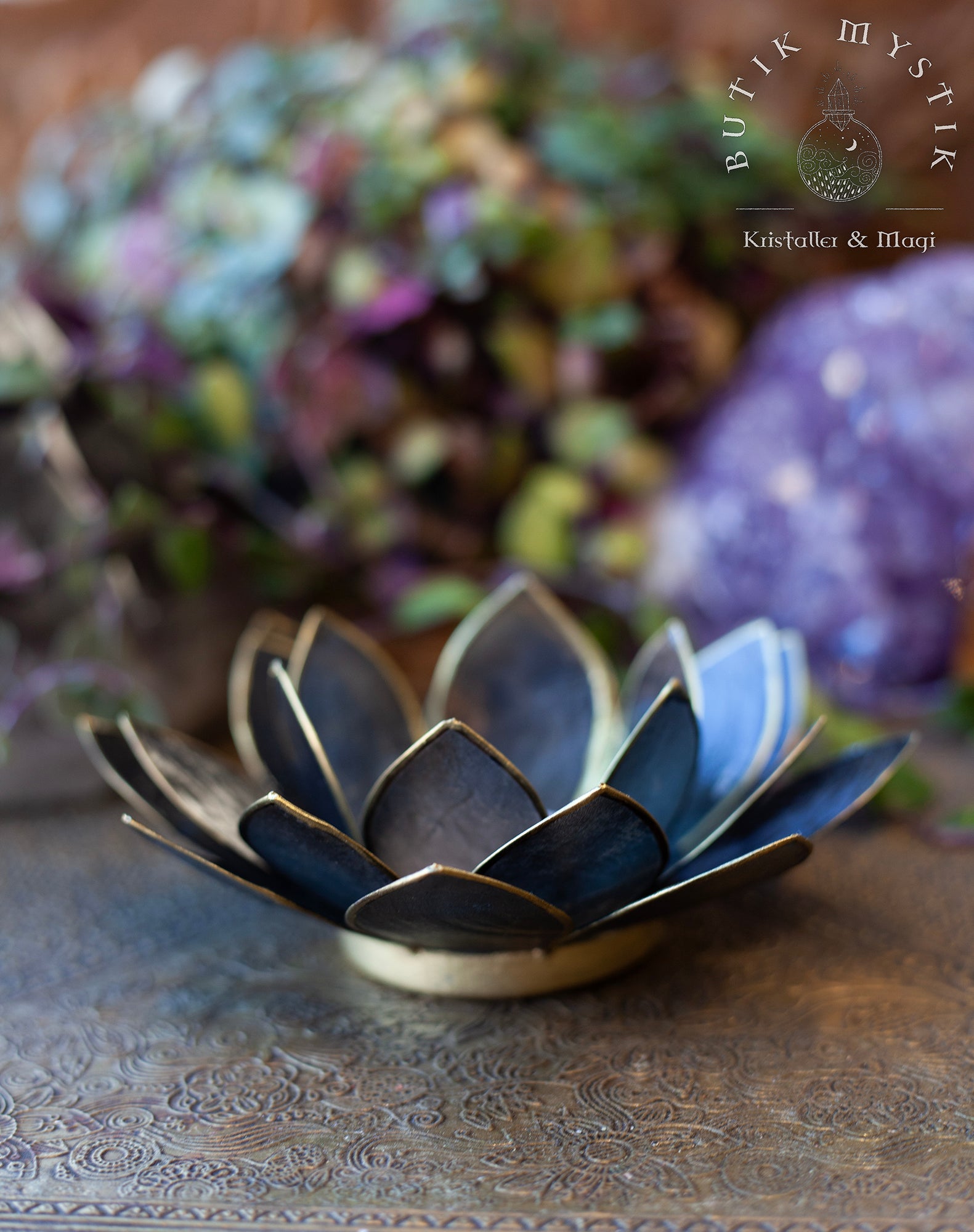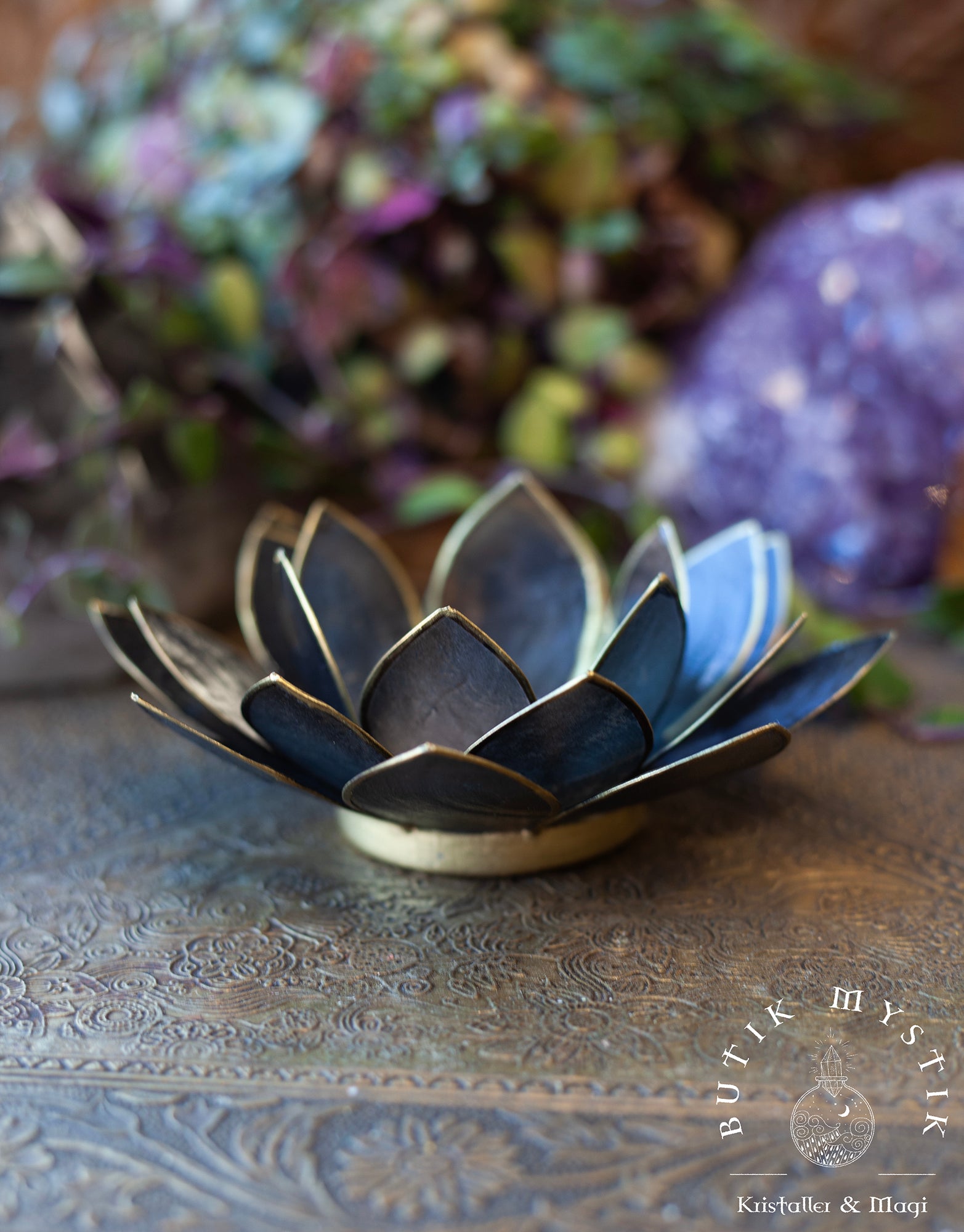 Hantverkare i Filippinerna tillverkar vår värmeljushållare för hand i en tidskrävande process som kräver skörd, blötläggning, mjukning, skärning och böjning av varje skal. Delarna arrangeras sedan konstfullt i en handmålad guldmetallram för att skapa en vit lotusblomma, som är en symbol för kärlek och hängivenhet i många sydasiatiska länder.