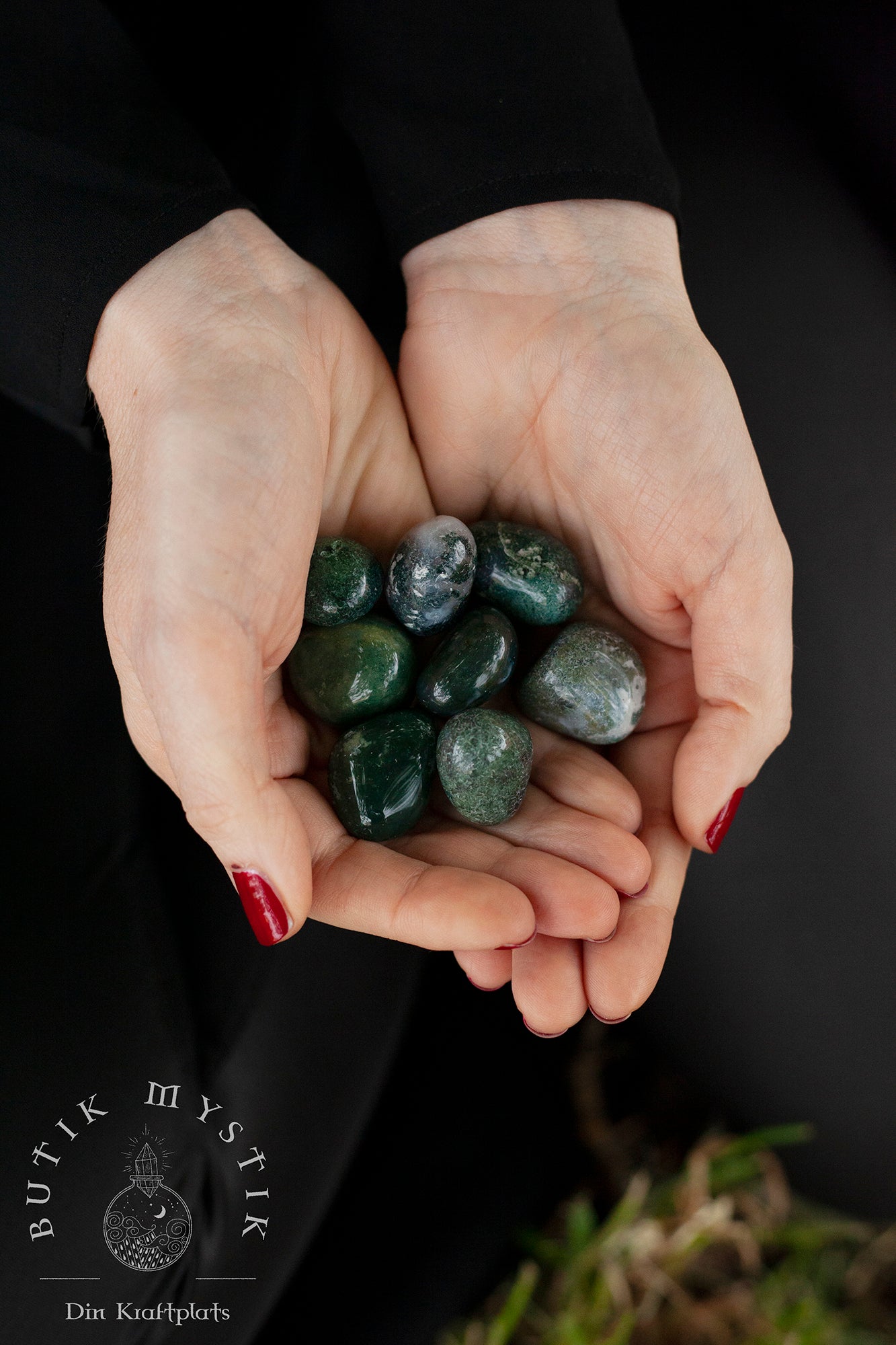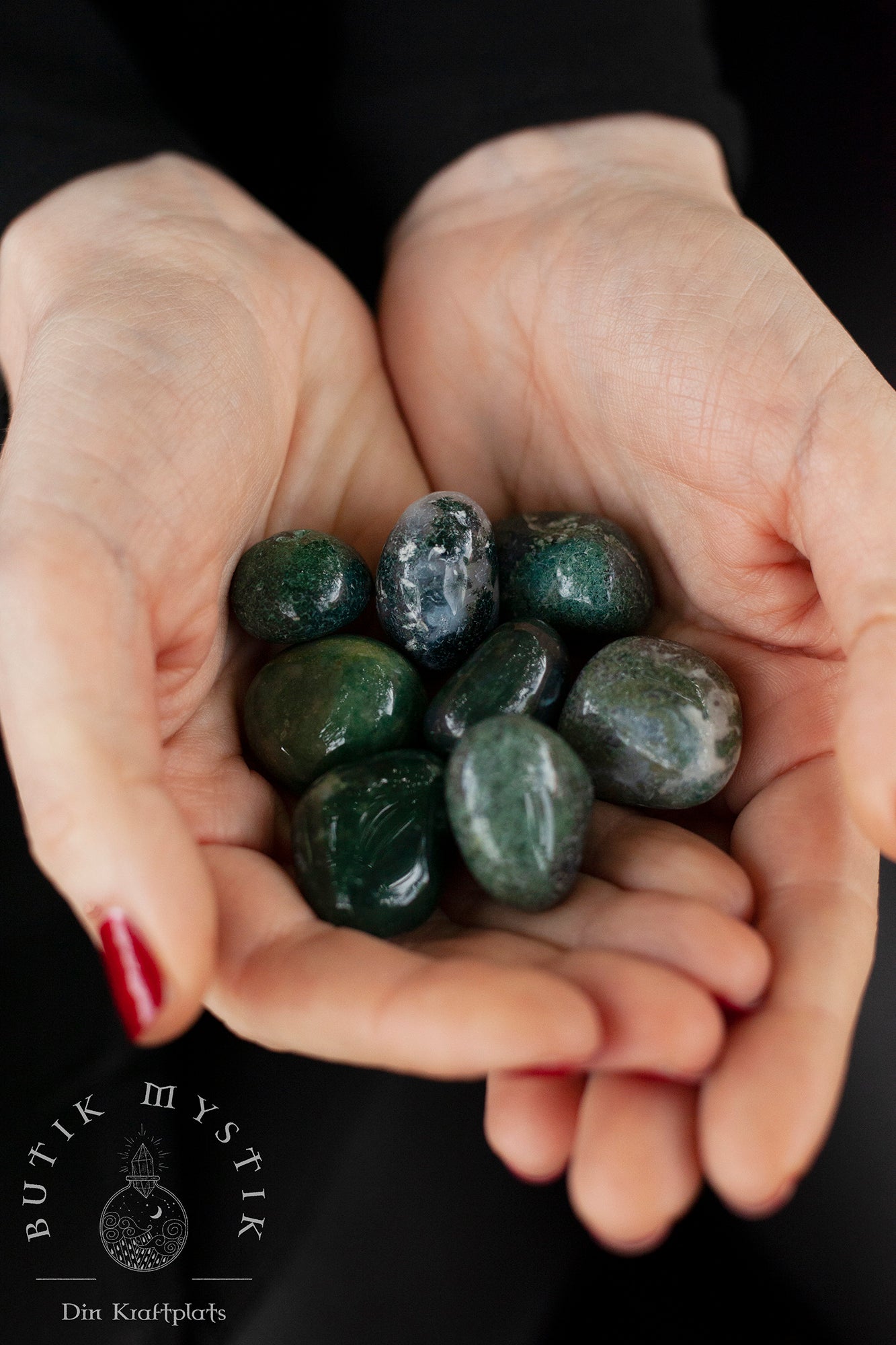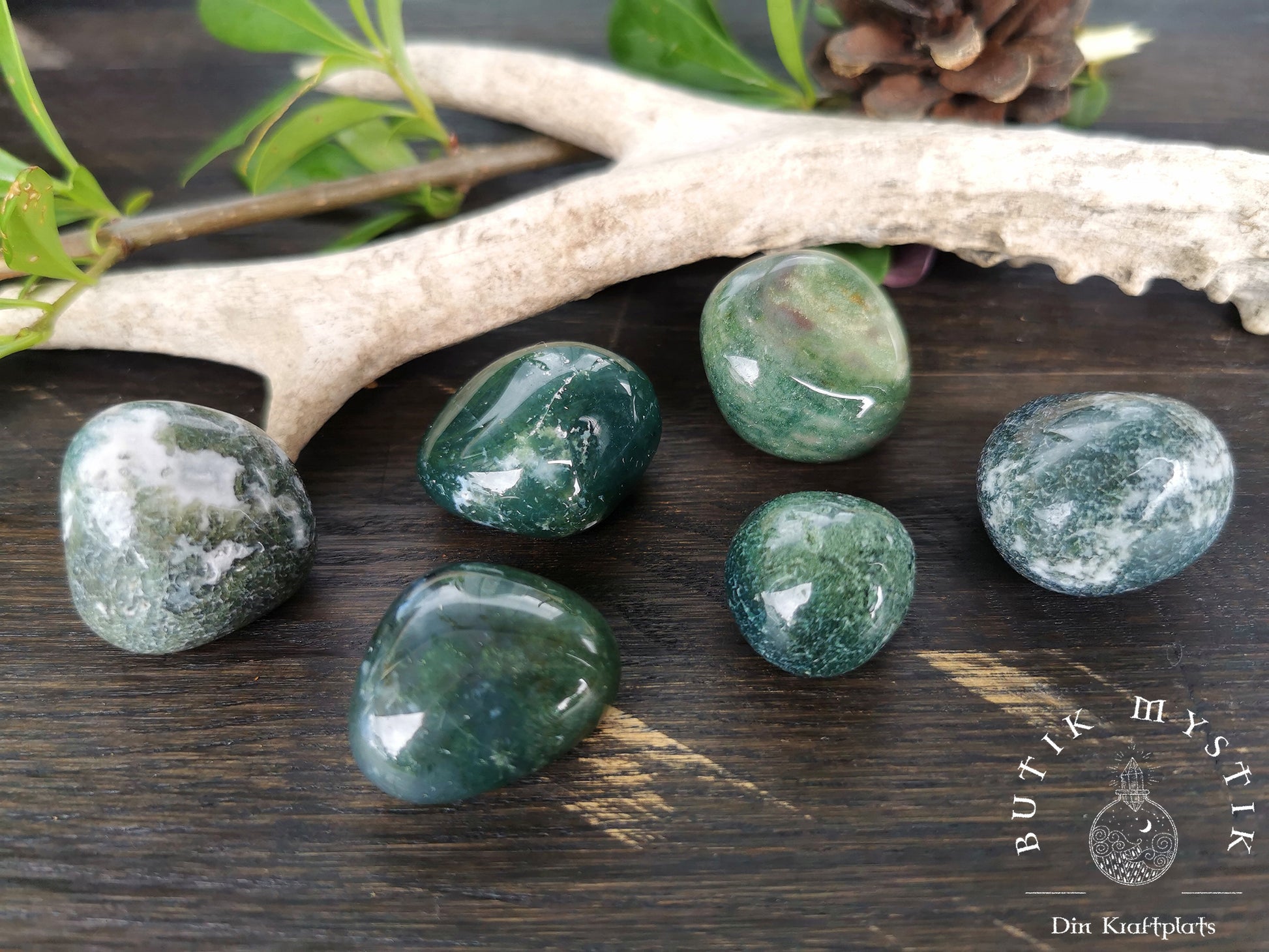 Mossagat är en magisk sten, dess nyanser tar dig tillbaka till naturen oavsett hur långt borta du är. Med den här stenen i närheten andas du in djupt doften av tallar, solljus genom skuggade träd och det svalkande ljudet av vatten som rinner över sten. Det är inte konstigt att Mossagat sägs kunna läka ditt hjärta på ett ögonblick, kan hjälpa dig att hålla dig rotad till världen under dina fötter och hålla dig öppen och redo för de cykliska förändringar som kommer din väg.