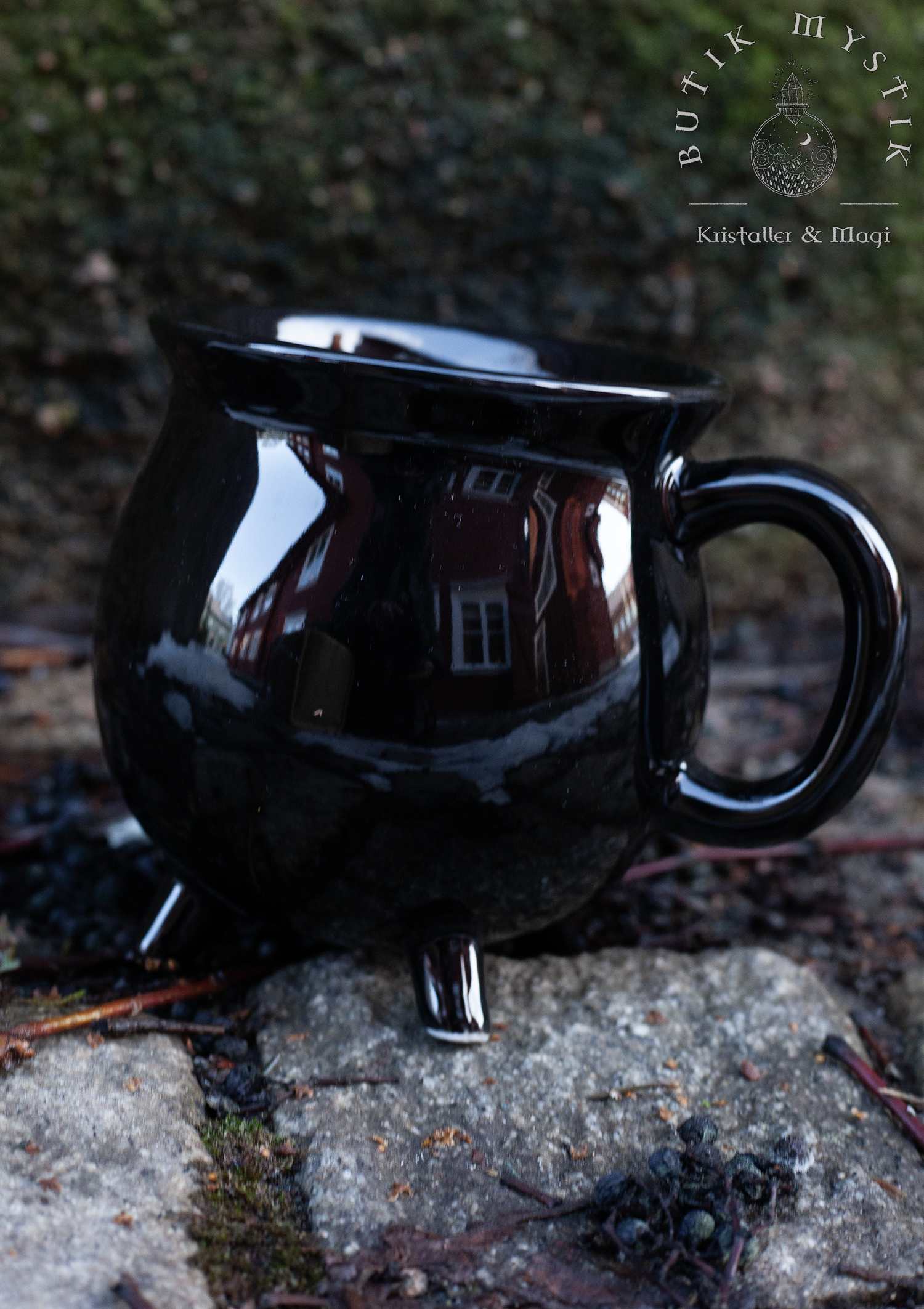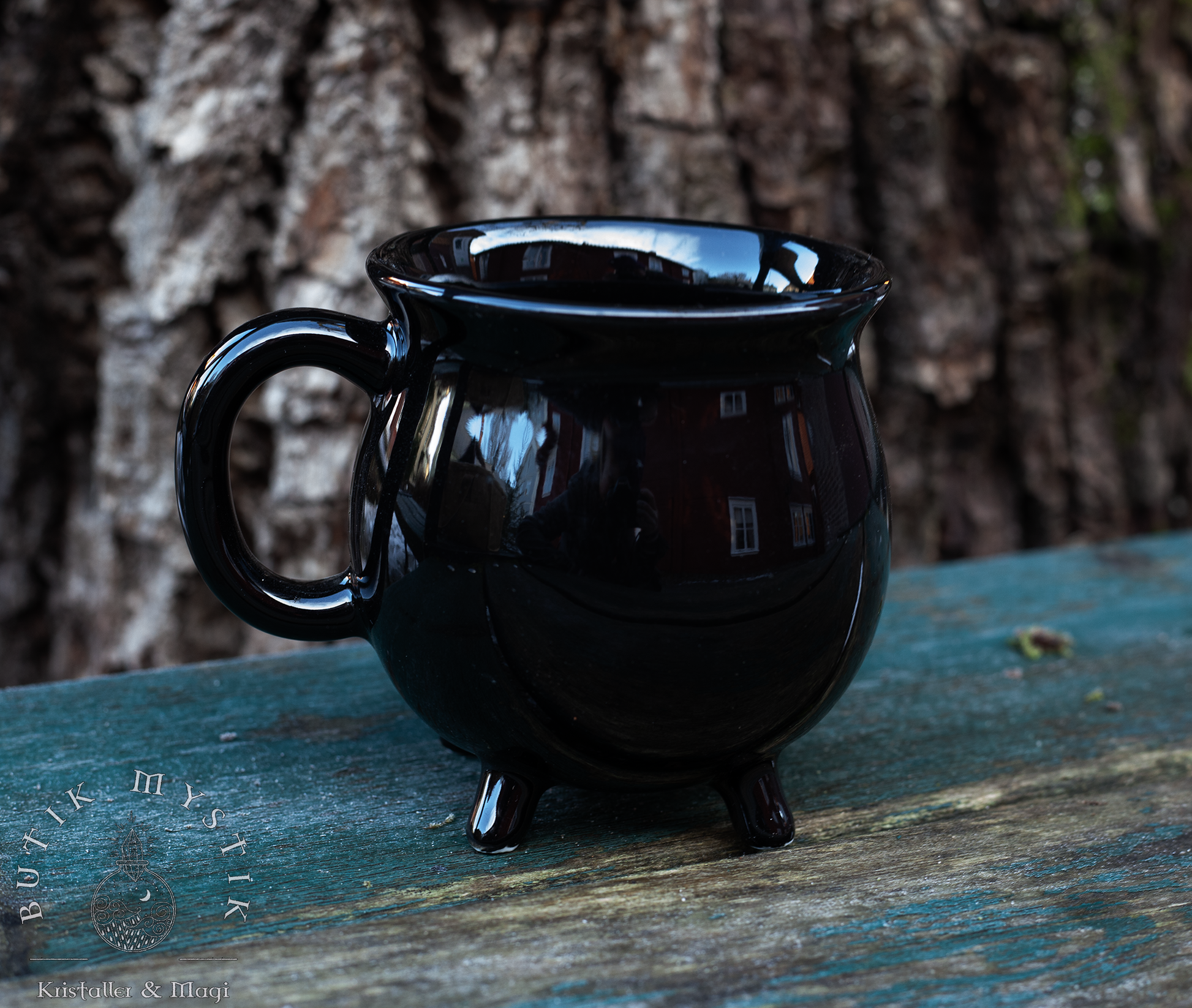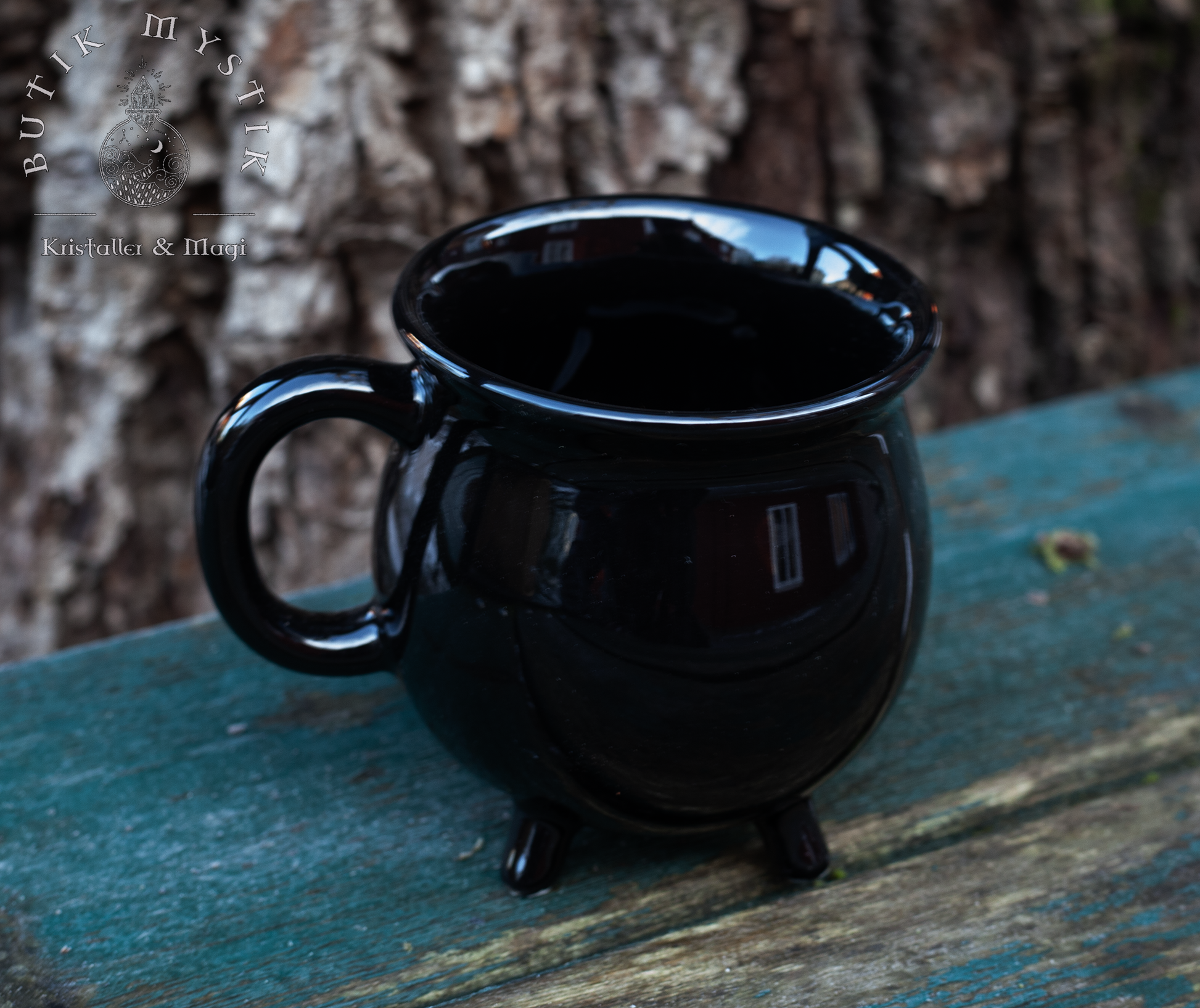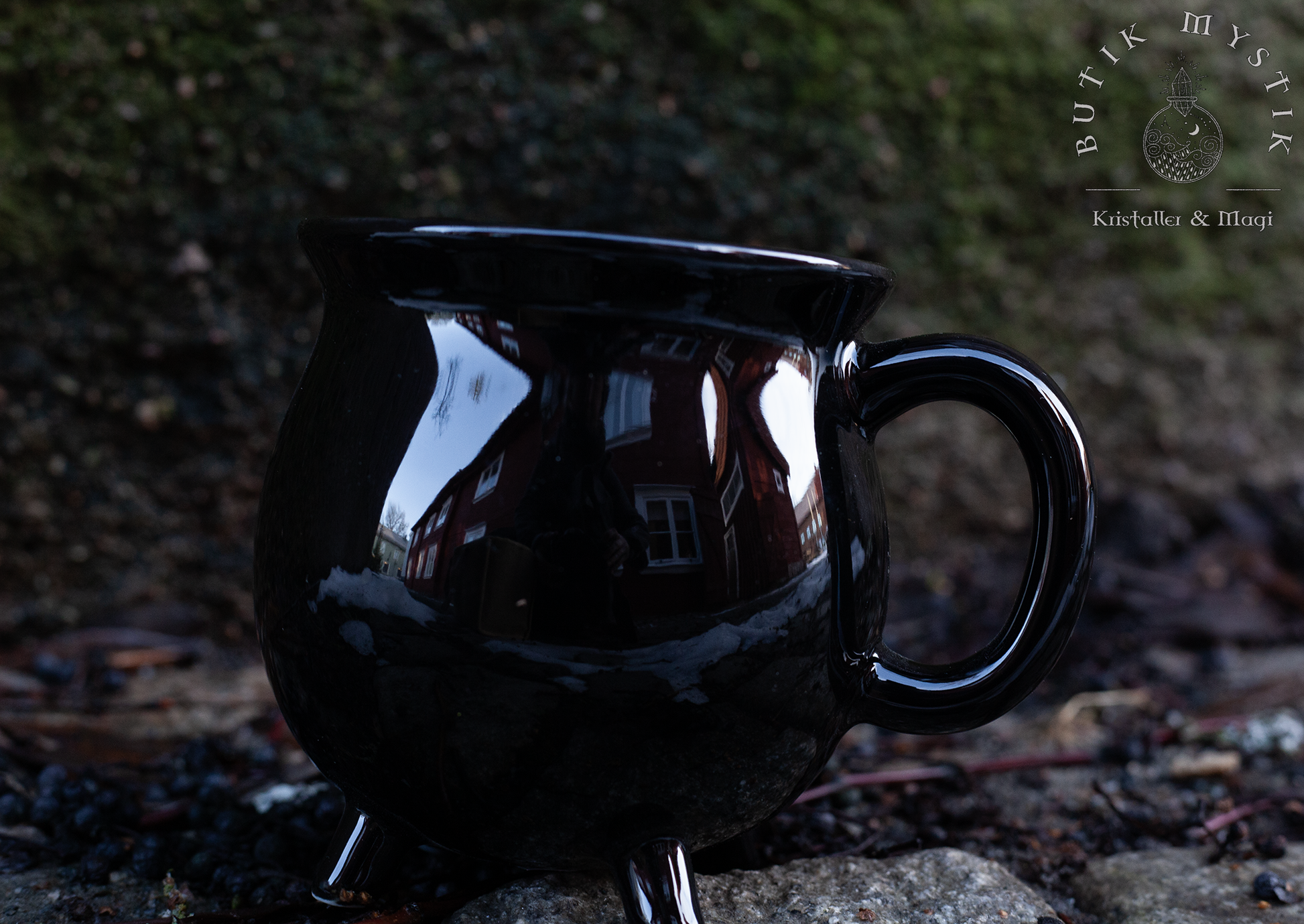Den svarta häxkitteln står på köksbänken, en mystisk mugg som fångar ögat med sin djupa, mörka glans. Den har en rundad form som påminner om en kittel som används för att brygga magiska elixir. När man fyller den med varmt te eller kaffe, tycks ångan stiga som en förtrollande dimma, och man kan nästan föreställa sig hur häxan i sagan viskar sina hemligheter medan drycken puttrar.