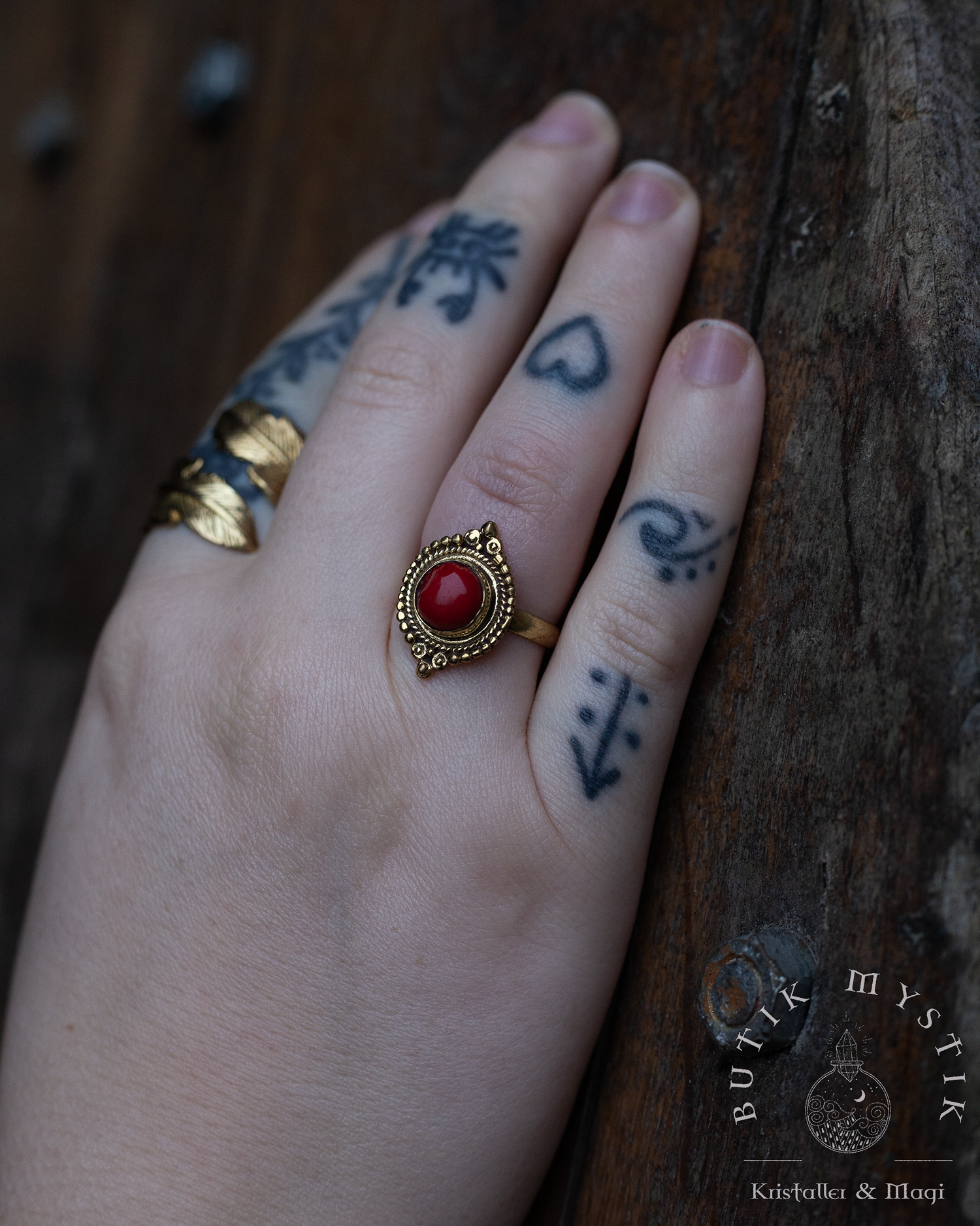 En bohemisk söt liten ring i mässing med en röd howlit.