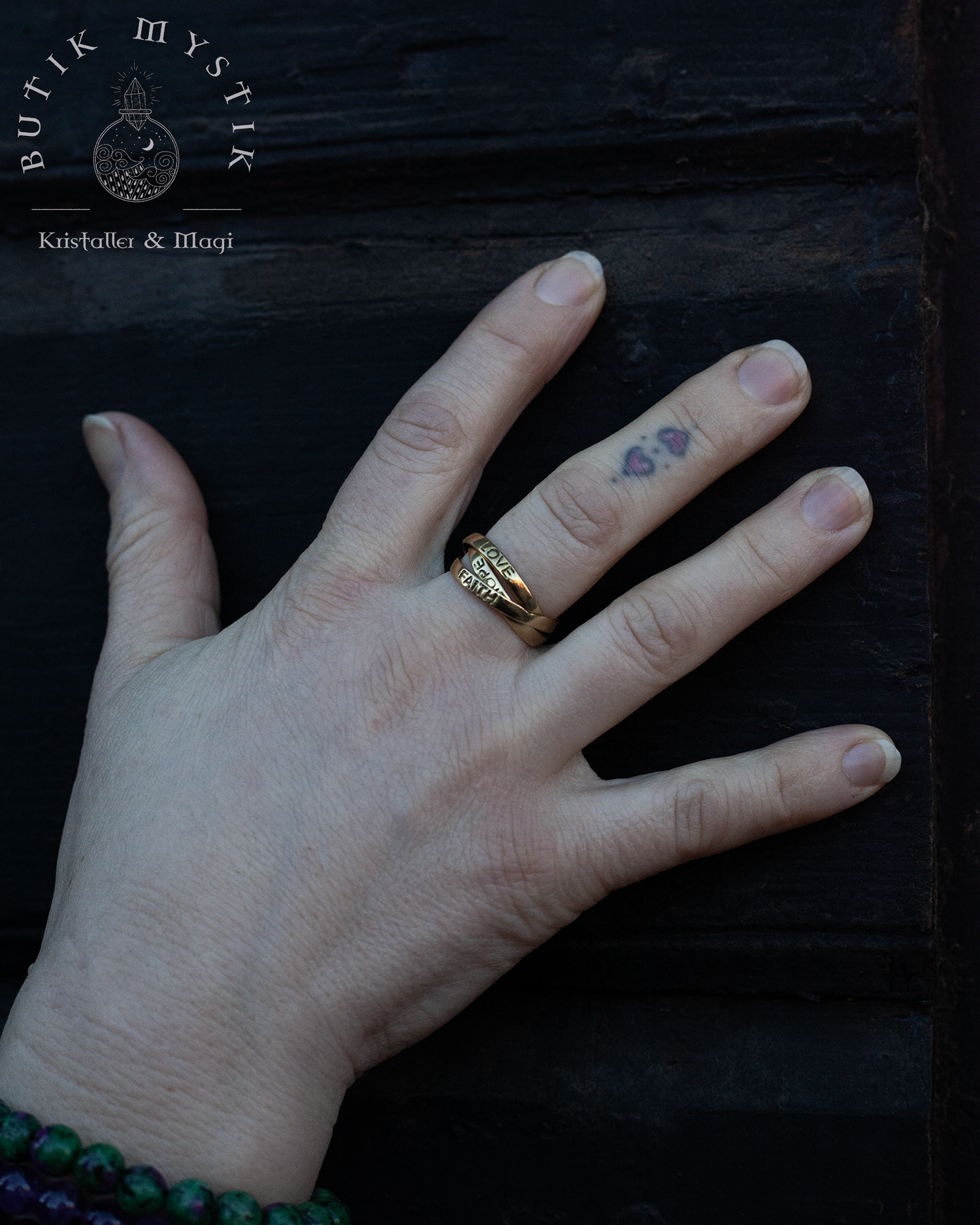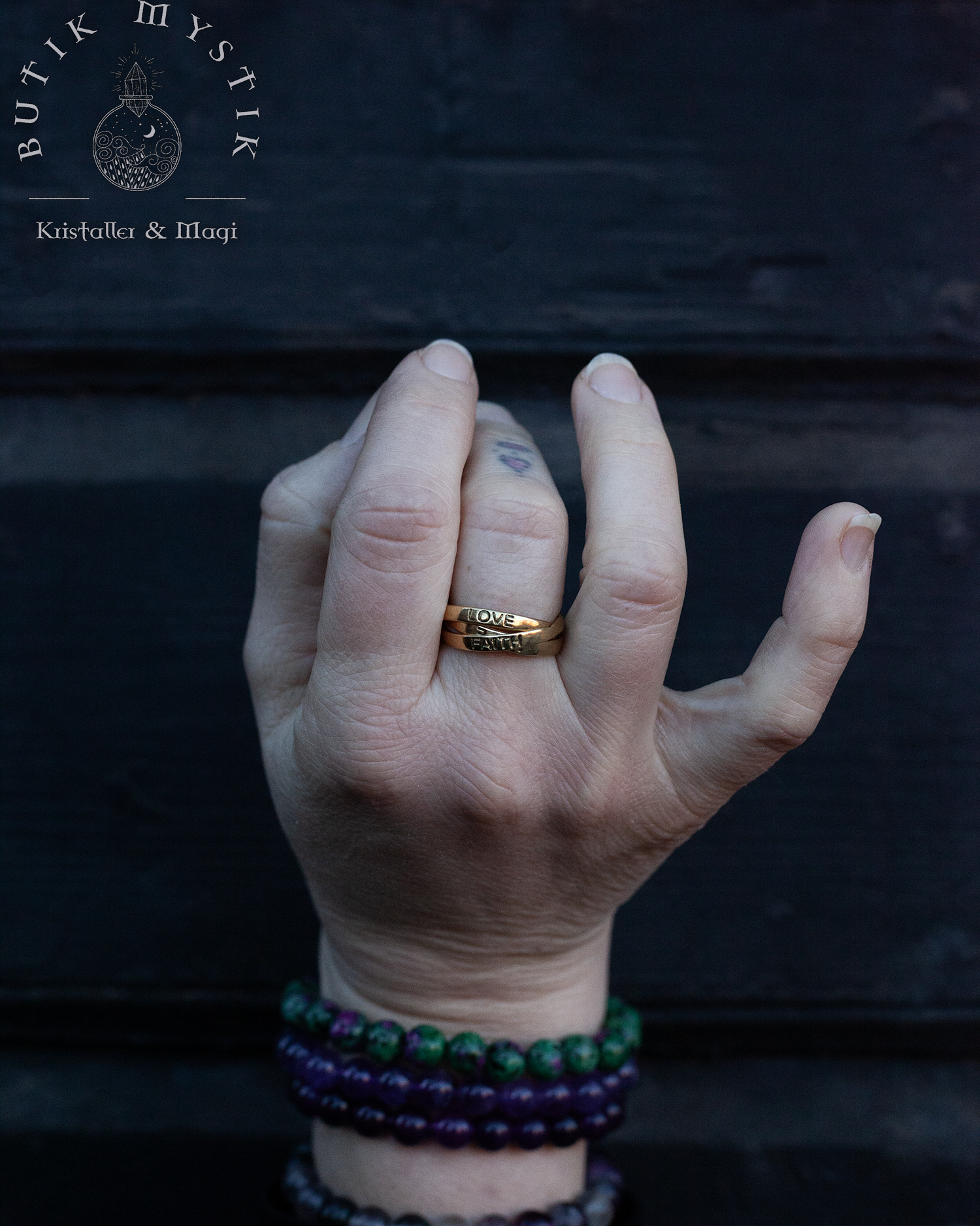 Vacker mässingsring med texten "Kärlek, hopp och tro".