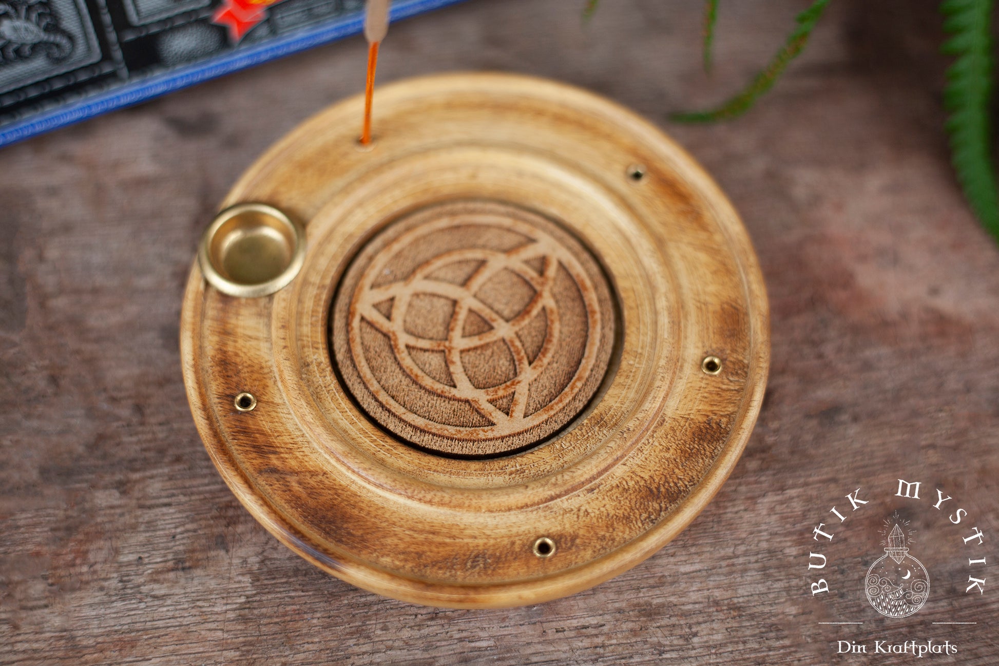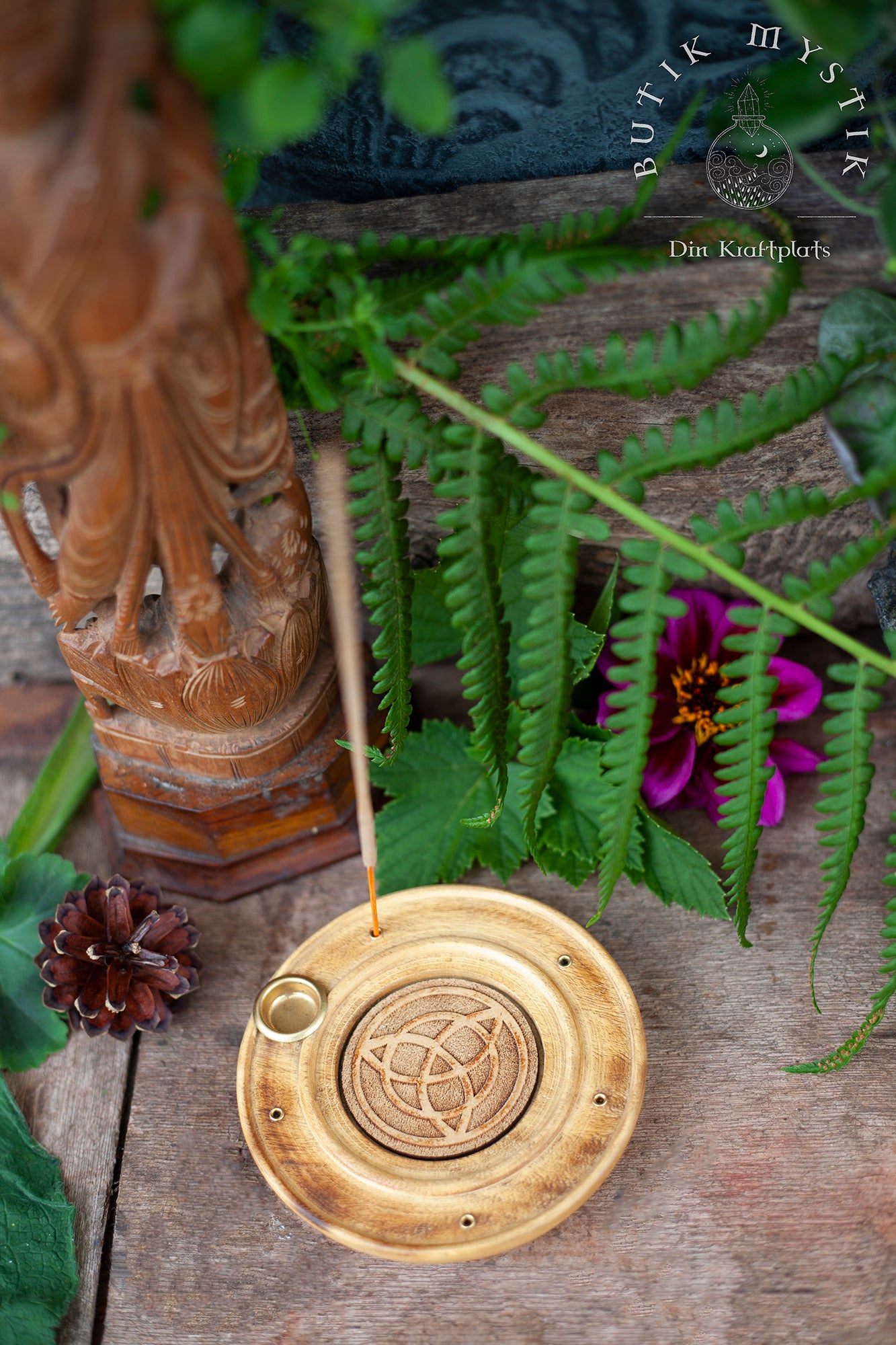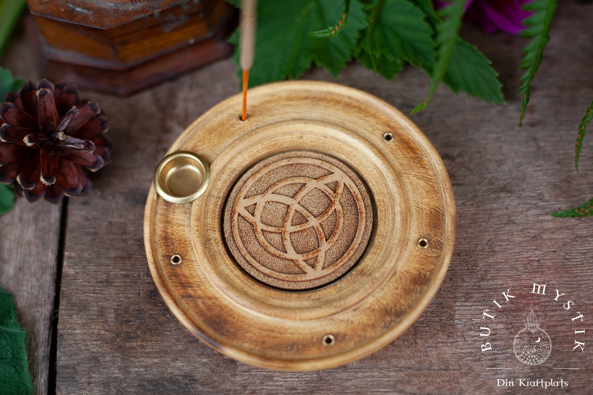 Rökelsehållare för rökelsepinnar och koner, utsmyckad med graverad dekoration av treenigheten. Lämplig för att bränna rökelsekoner och tunna rökelsepinnar, som indisk och japansk rökelse.
