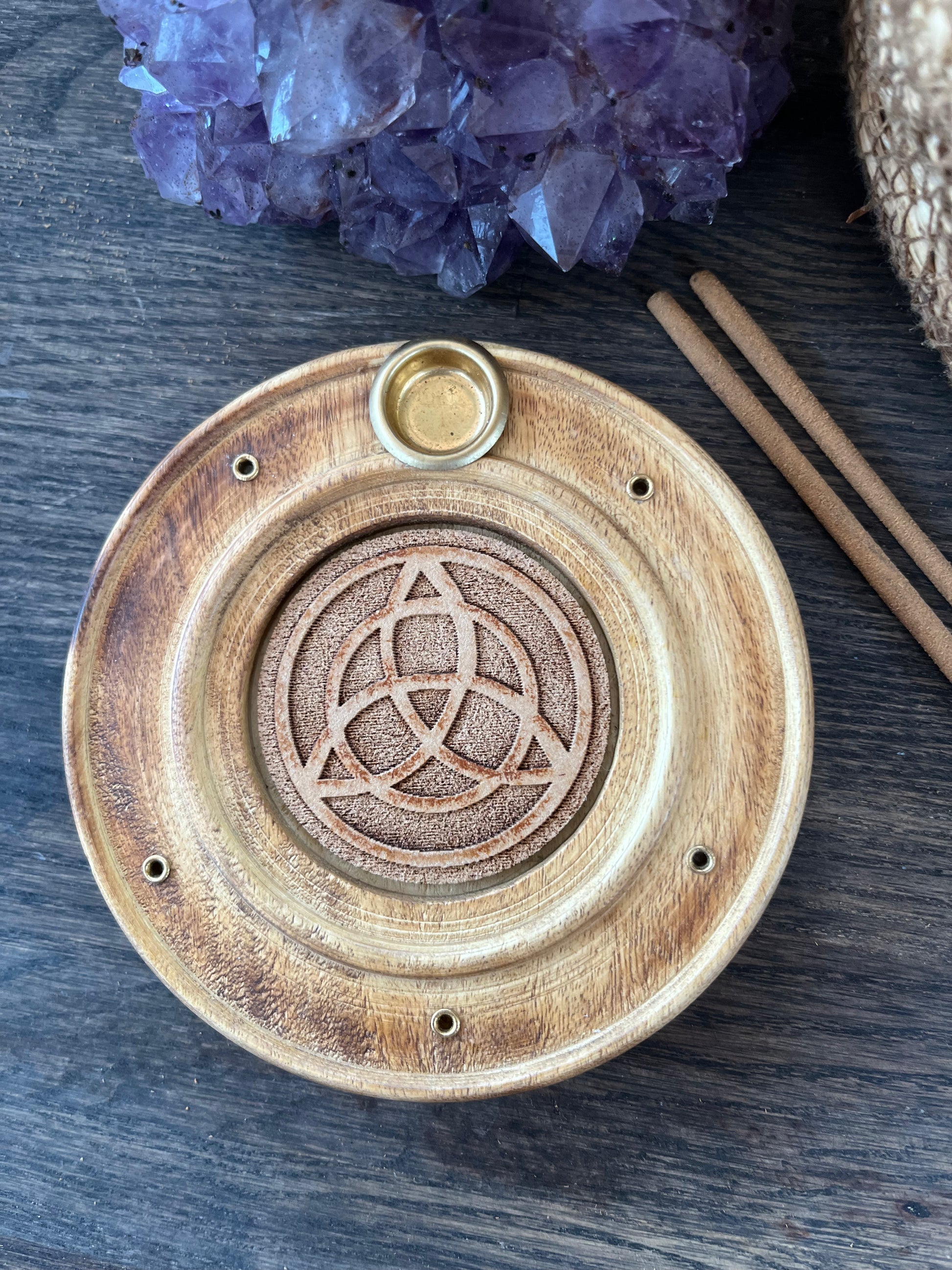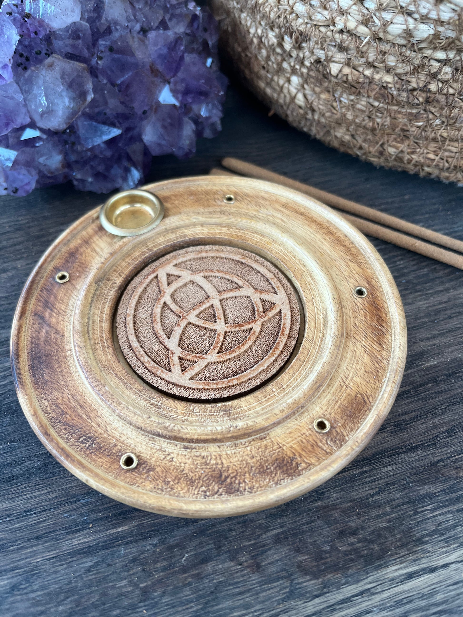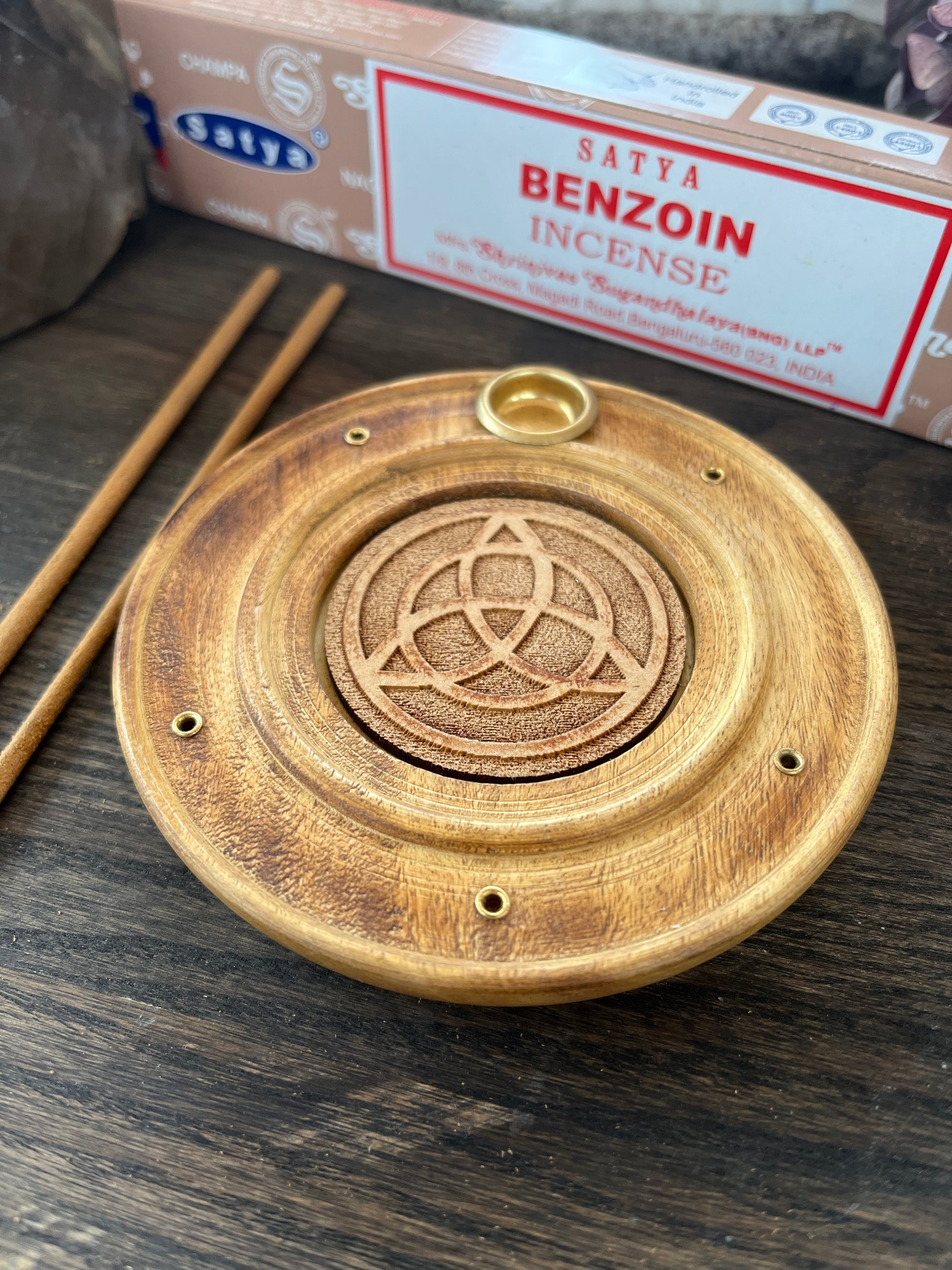 Rökelsehållare för rökelsepinnar och koner, utsmyckad med graverad dekoration av treenigheten. Lämplig för att bränna rökelsekoner och tunna rökelsepinnar, som indisk och japansk rökelse.