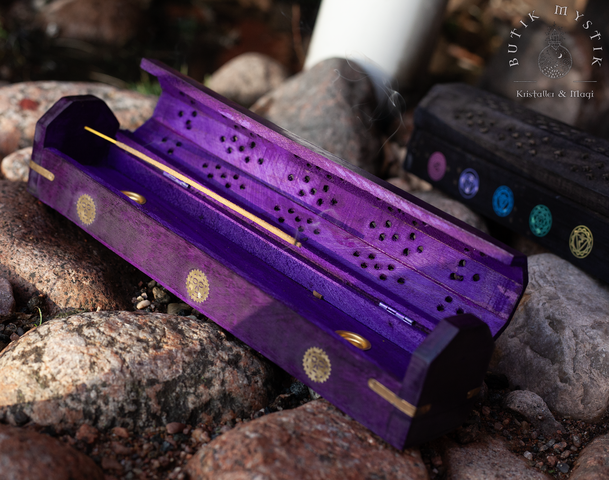 Trälådan kan bränna två rökelsepinnar åt gången samt två rökelsekoner. Mycket lätt att rengöra. Använd den i din meditation, yogaträning, vilken ceremoni som helst eller som vacker inredning i ditt hem.