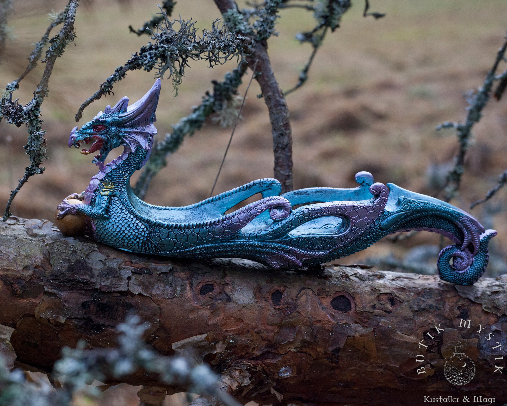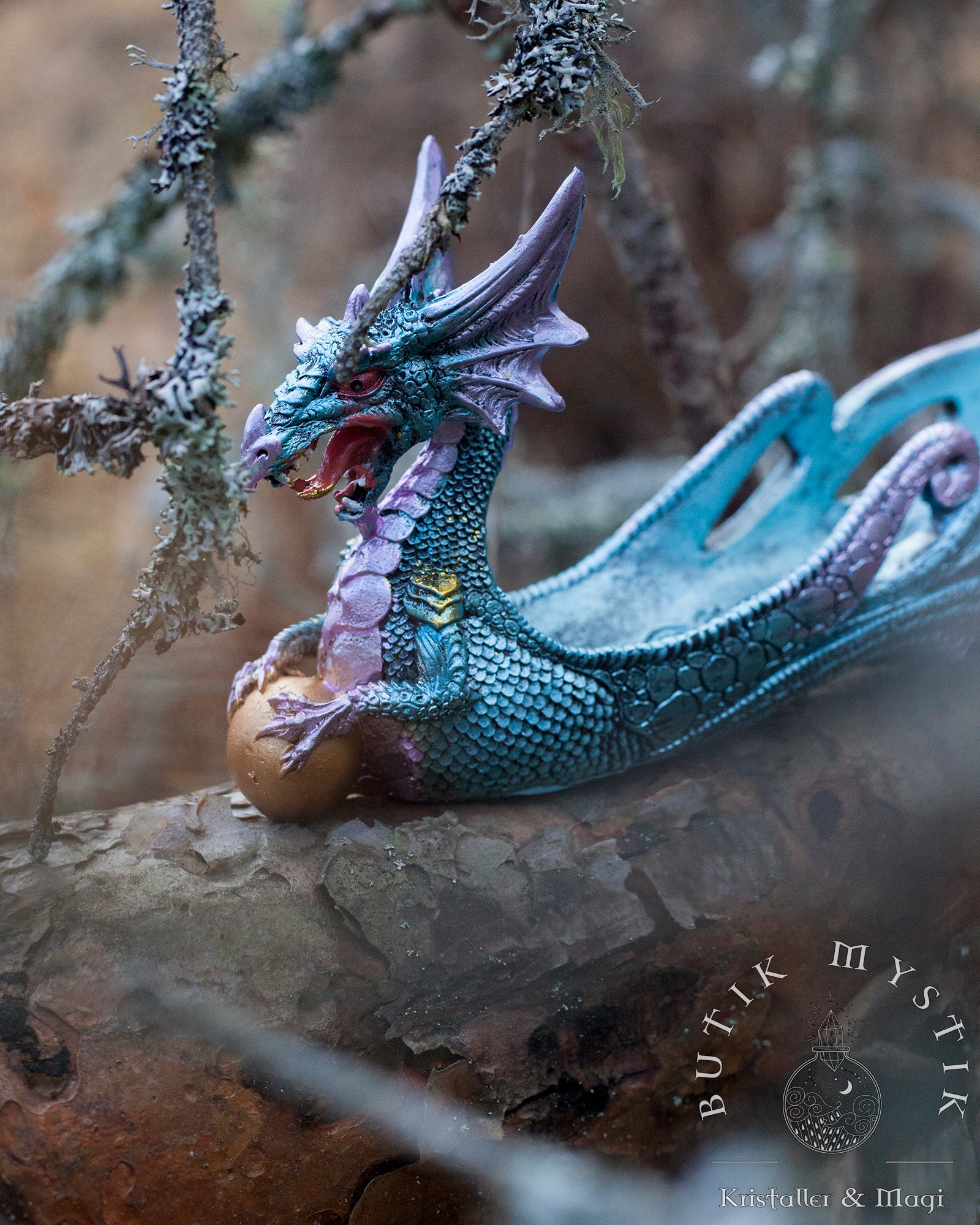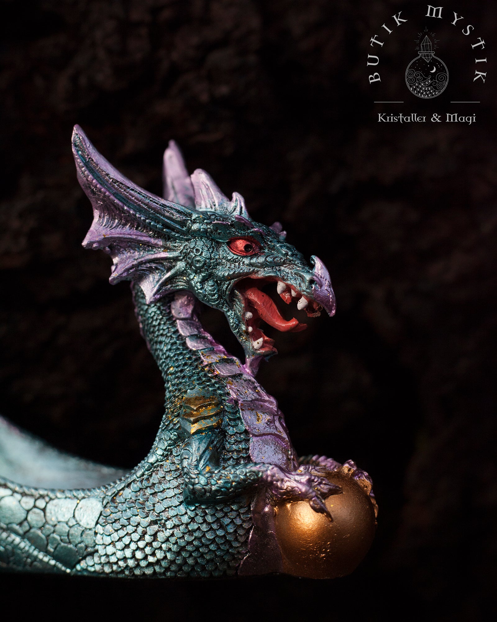 Drakens kropp är täckt i intrikata skalor som kurvor och vrids längs sin långa kropp, vilket ger den en känsla av rörelse och liv. Dess vassa klor är noggrant skulpterade, medan munnen är öppen, som om draken kallar fram rökelsens kraft.