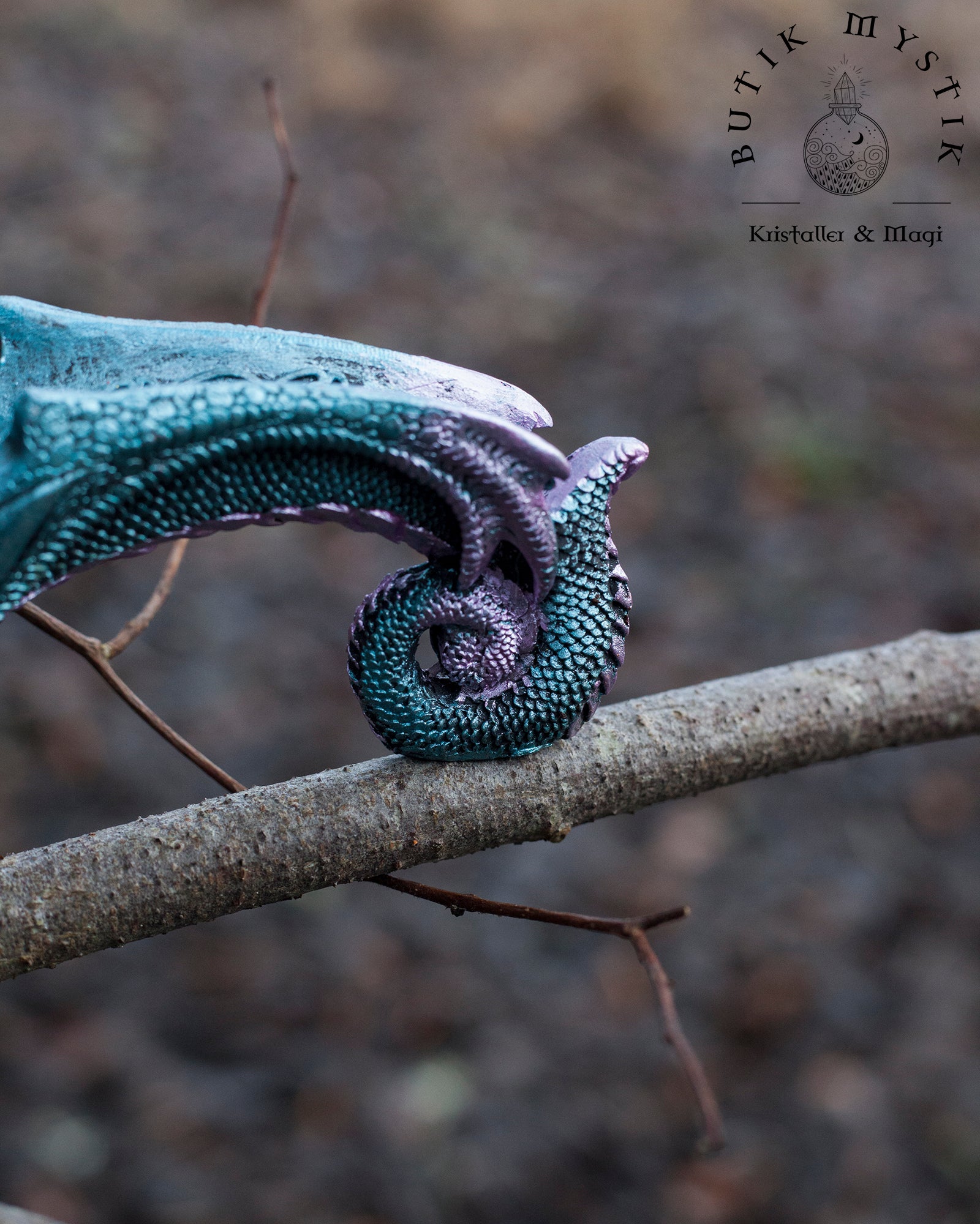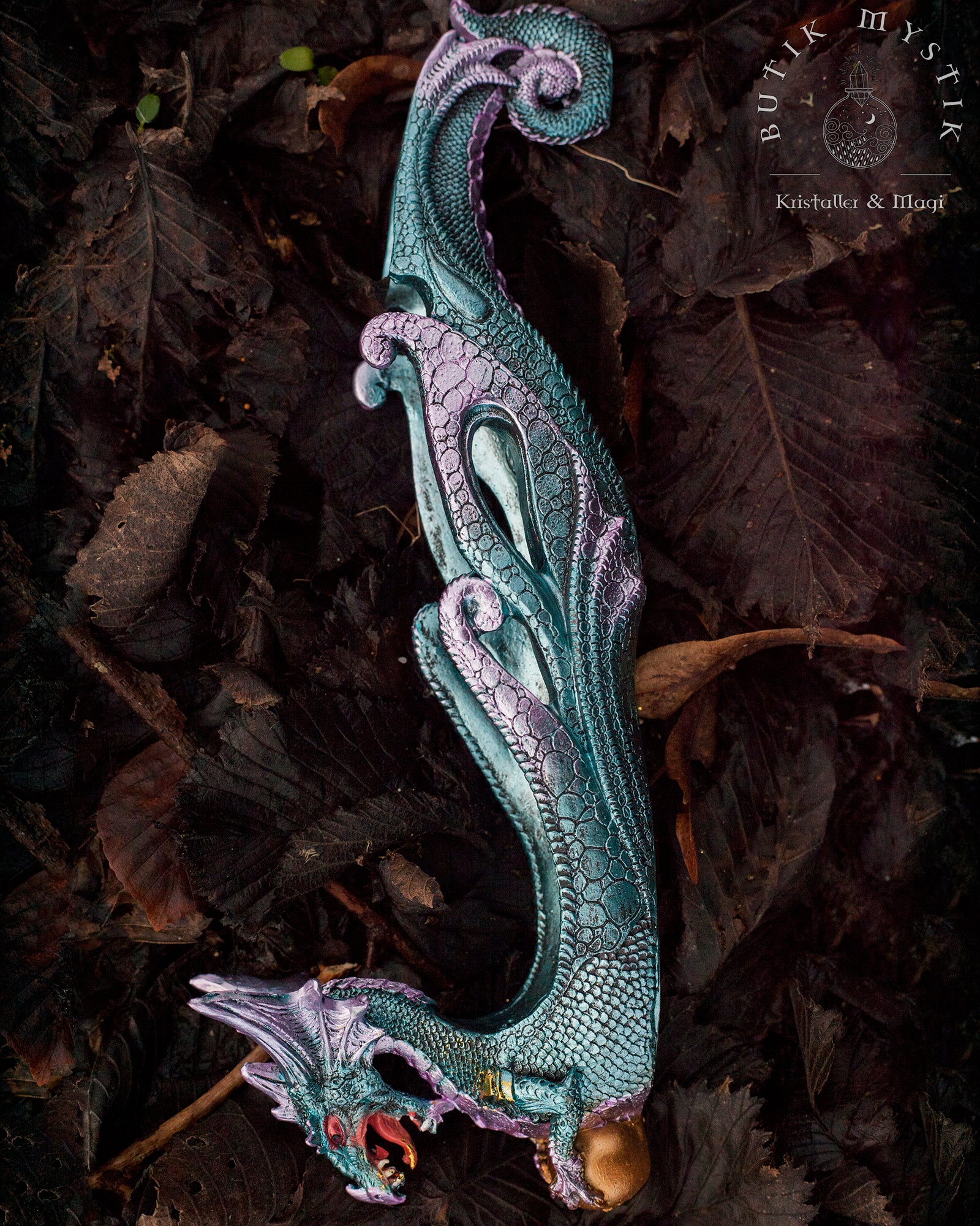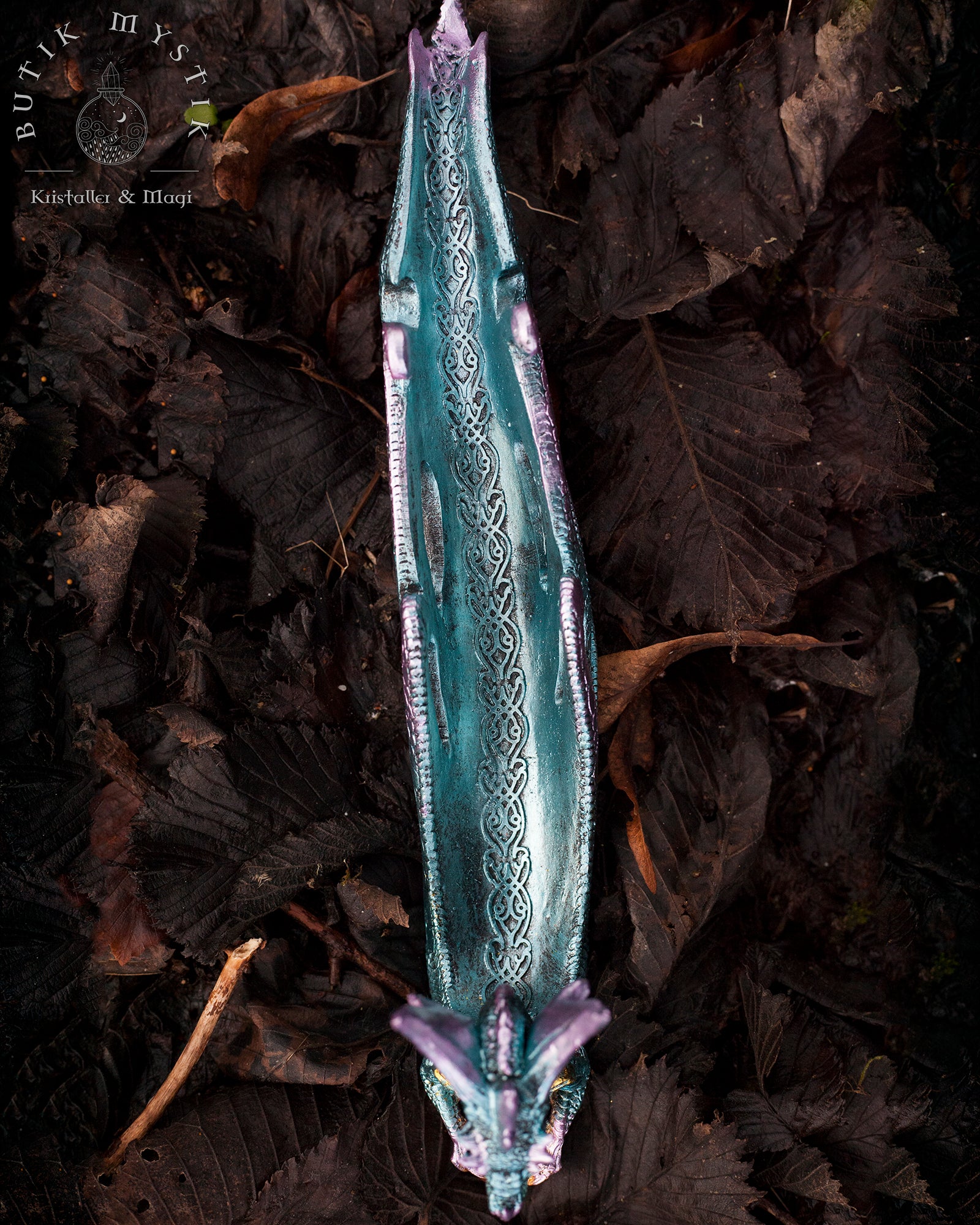 Drakens kropp är täckt i intrikata skalor som kurvor och vrids längs sin långa kropp, vilket ger den en känsla av rörelse och liv. Dess vassa klor är noggrant skulpterade, medan munnen är öppen, som om draken kallar fram rökelsens kraft.