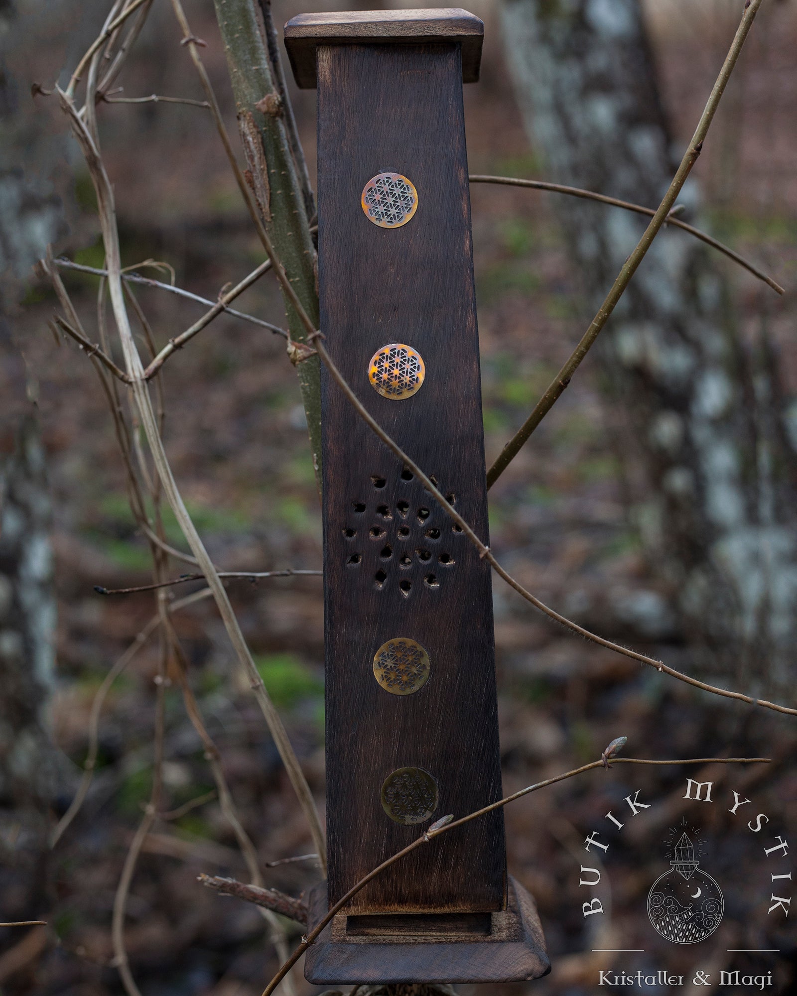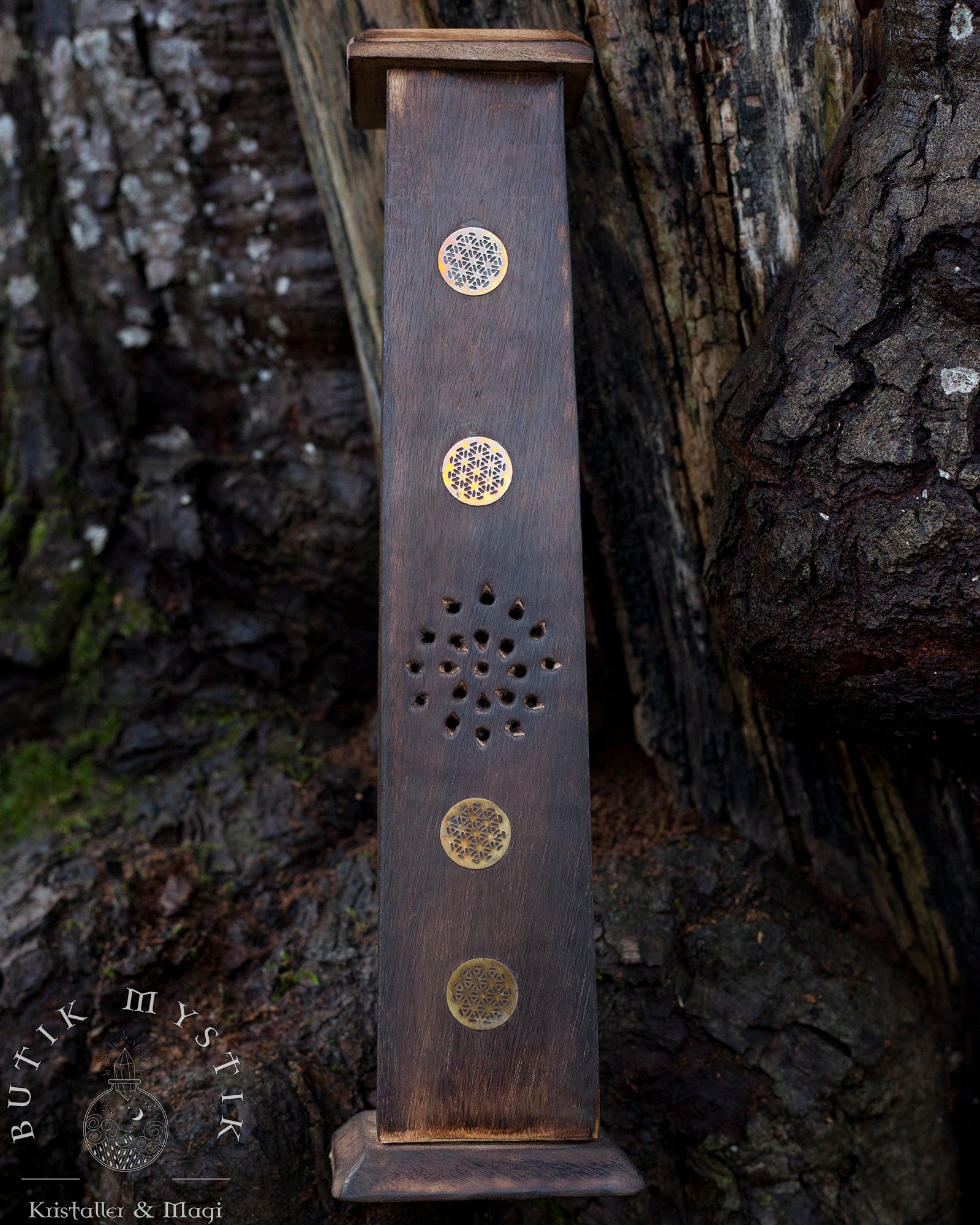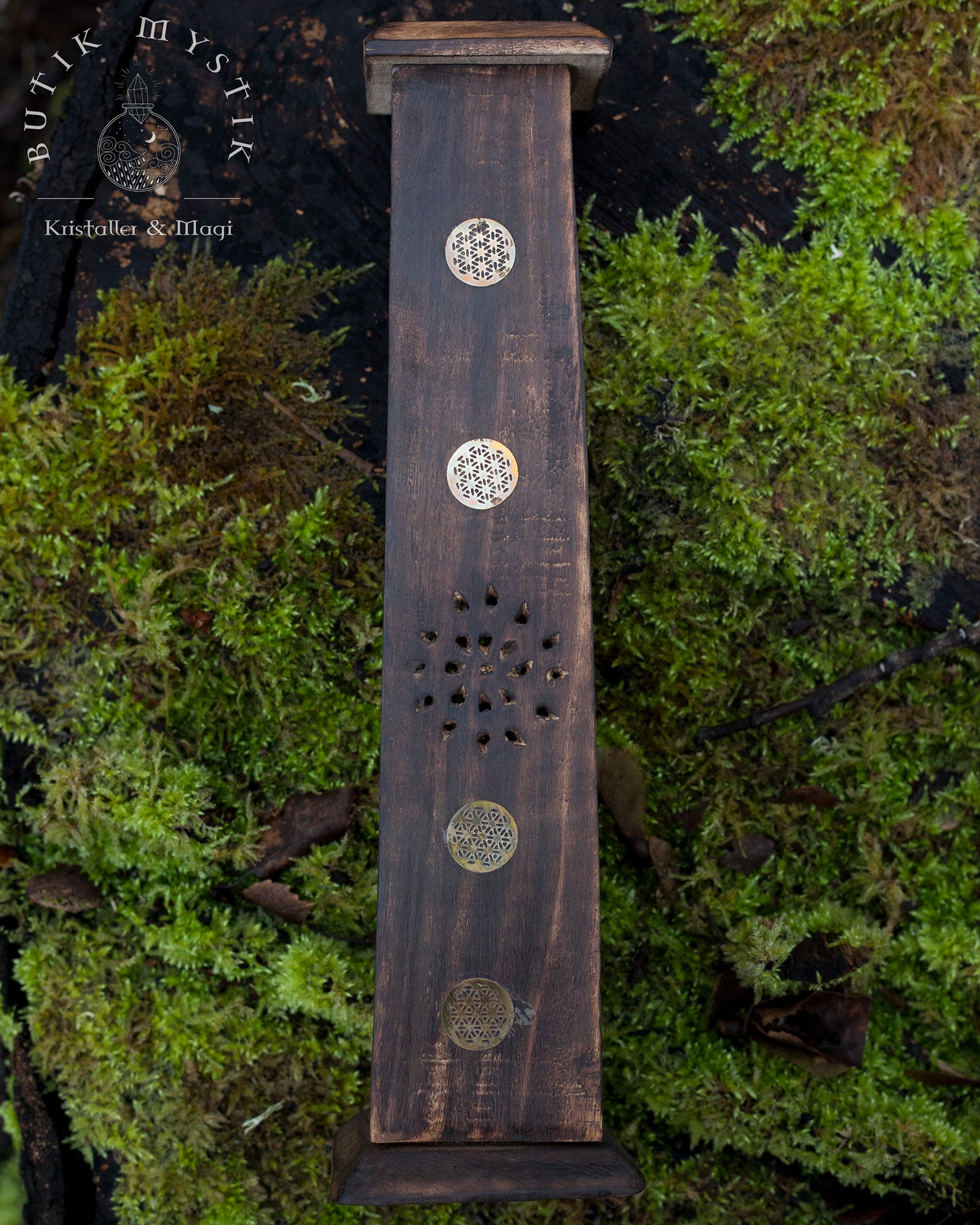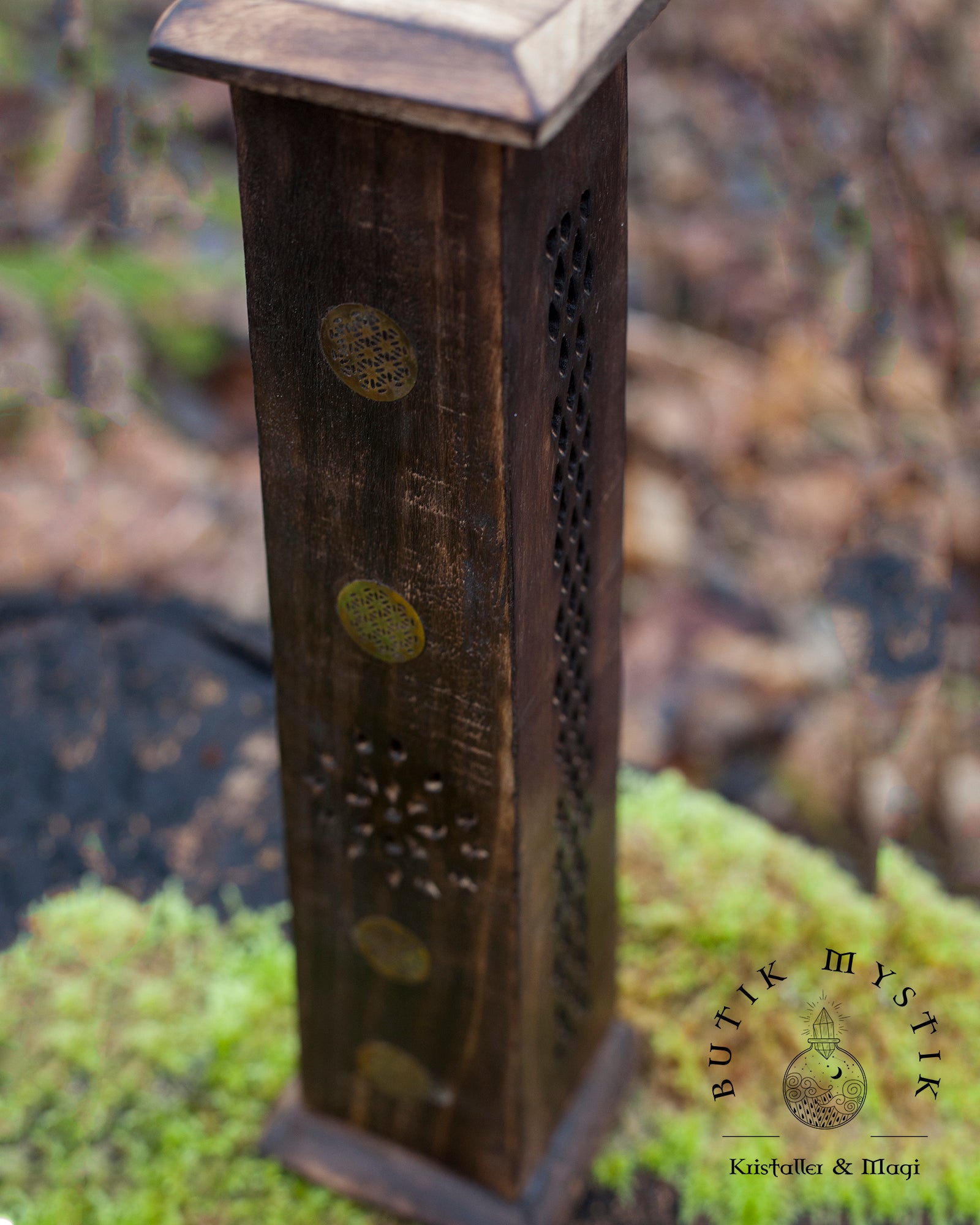 Denna rökelsebrännare är handsnidad i Indien. Den snidade blomman på toppen ger nio delikata utskärningar för röken att stiga upp genom. Var och en av de fyra sidorna är huggen i en vacker design. Trätornet kan bränna fyra rökelsepinnar åt gången samt en rökelsekon. Mycket lätt att rengöra.