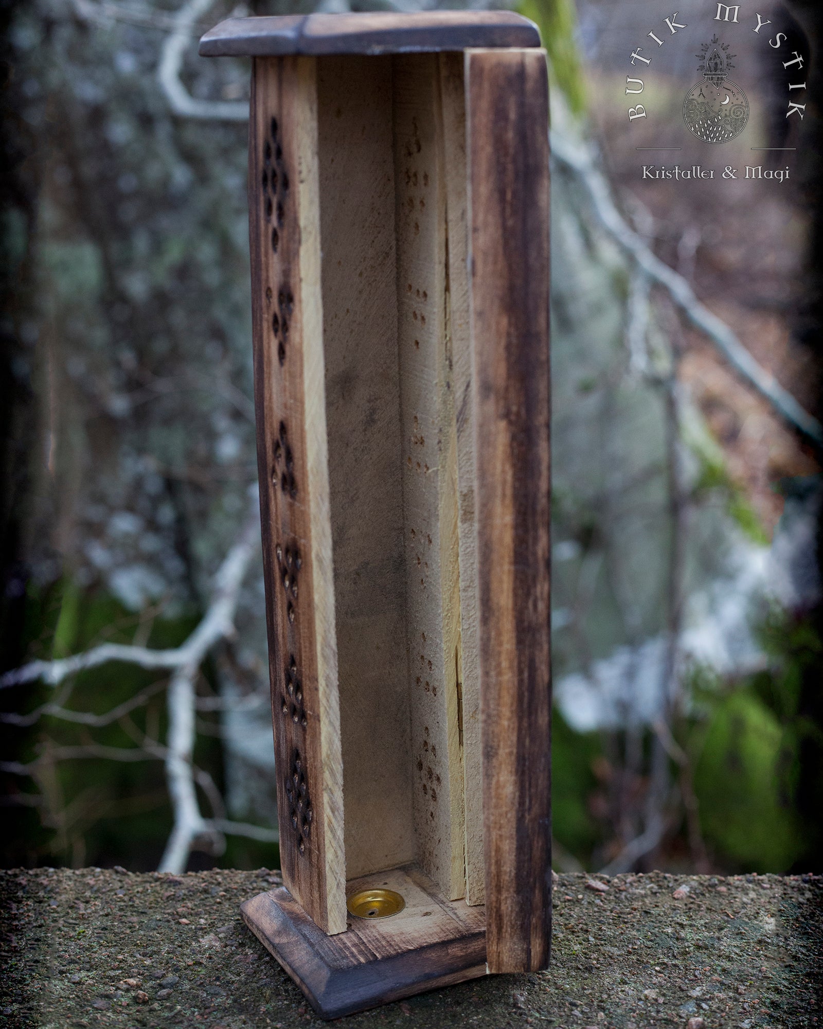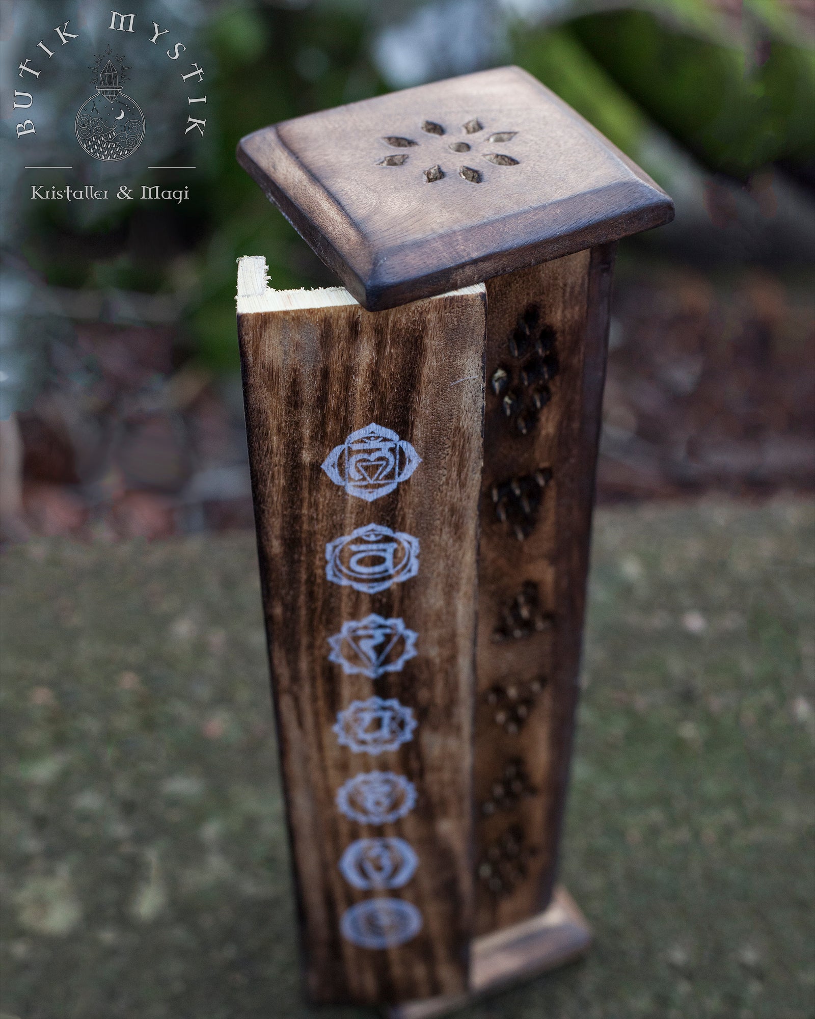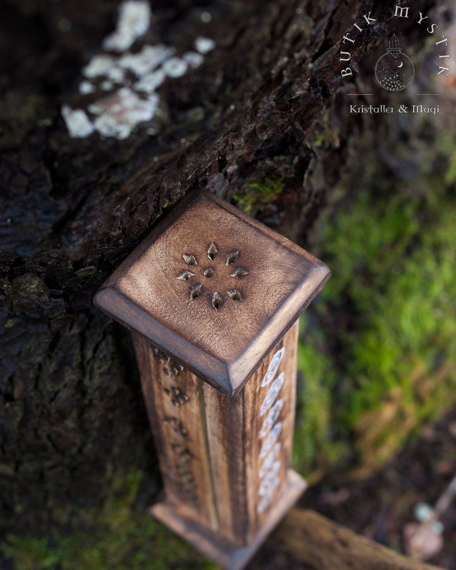 Denna rökelsebrännare är handsnidad i Indien. Den snidade blomman på toppen ger nio delikata utskärningar för röken att stiga upp genom. Var och en av de fyra sidorna är huggen i en vacker design. Trätornet kan bränna fyra rökelsepinnar åt gången samt en rökelsekon. Mycket lätt att rengöra.