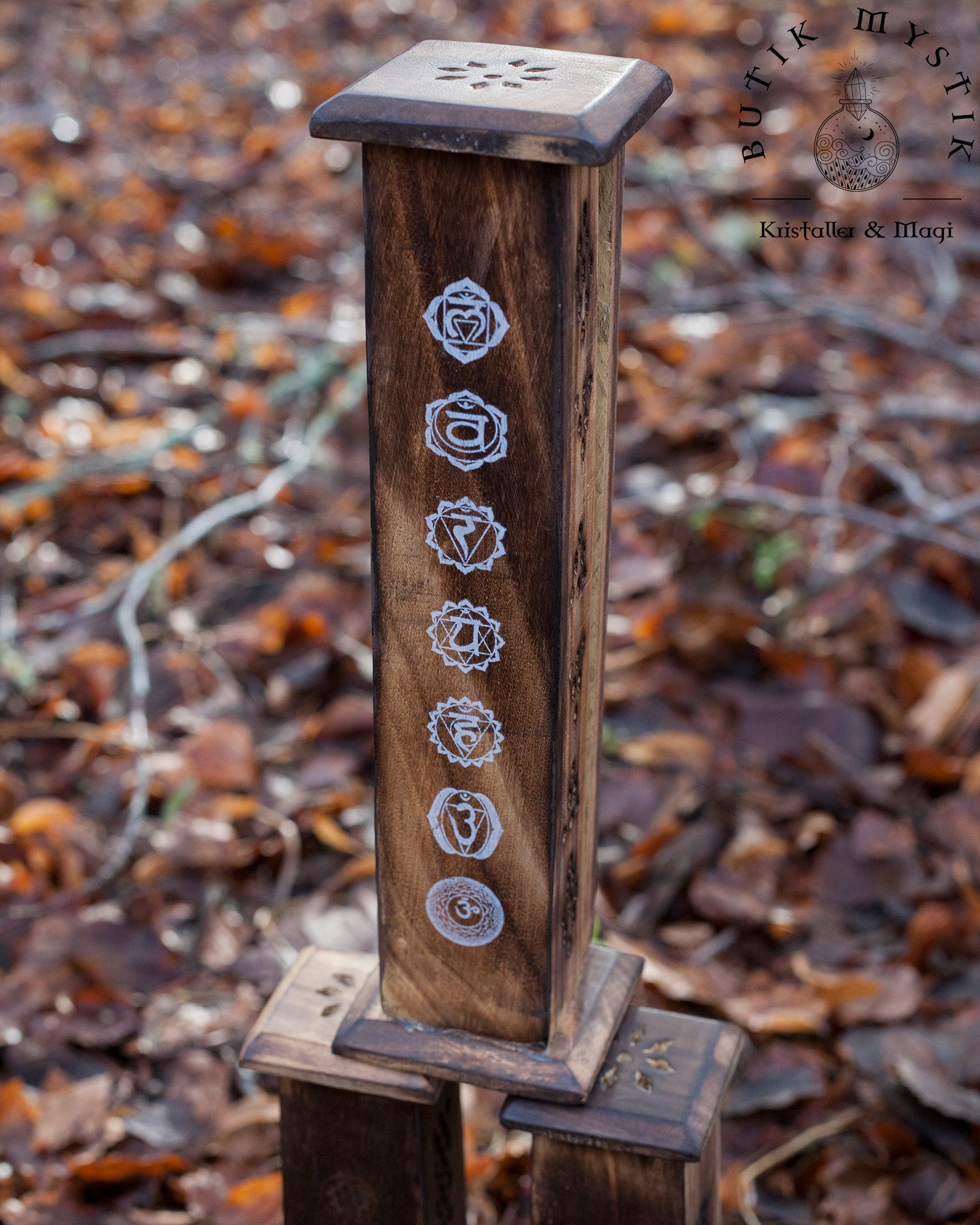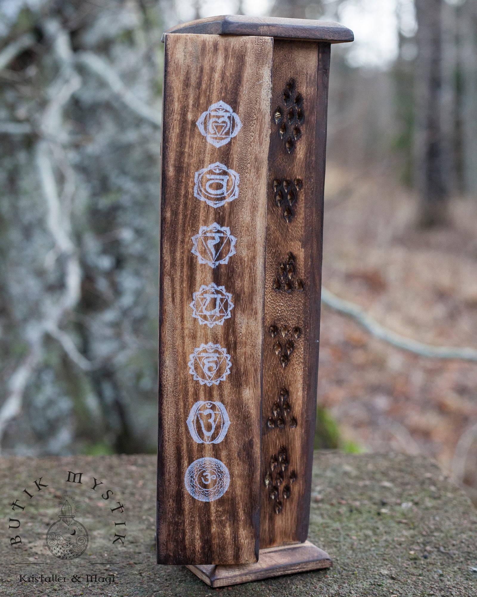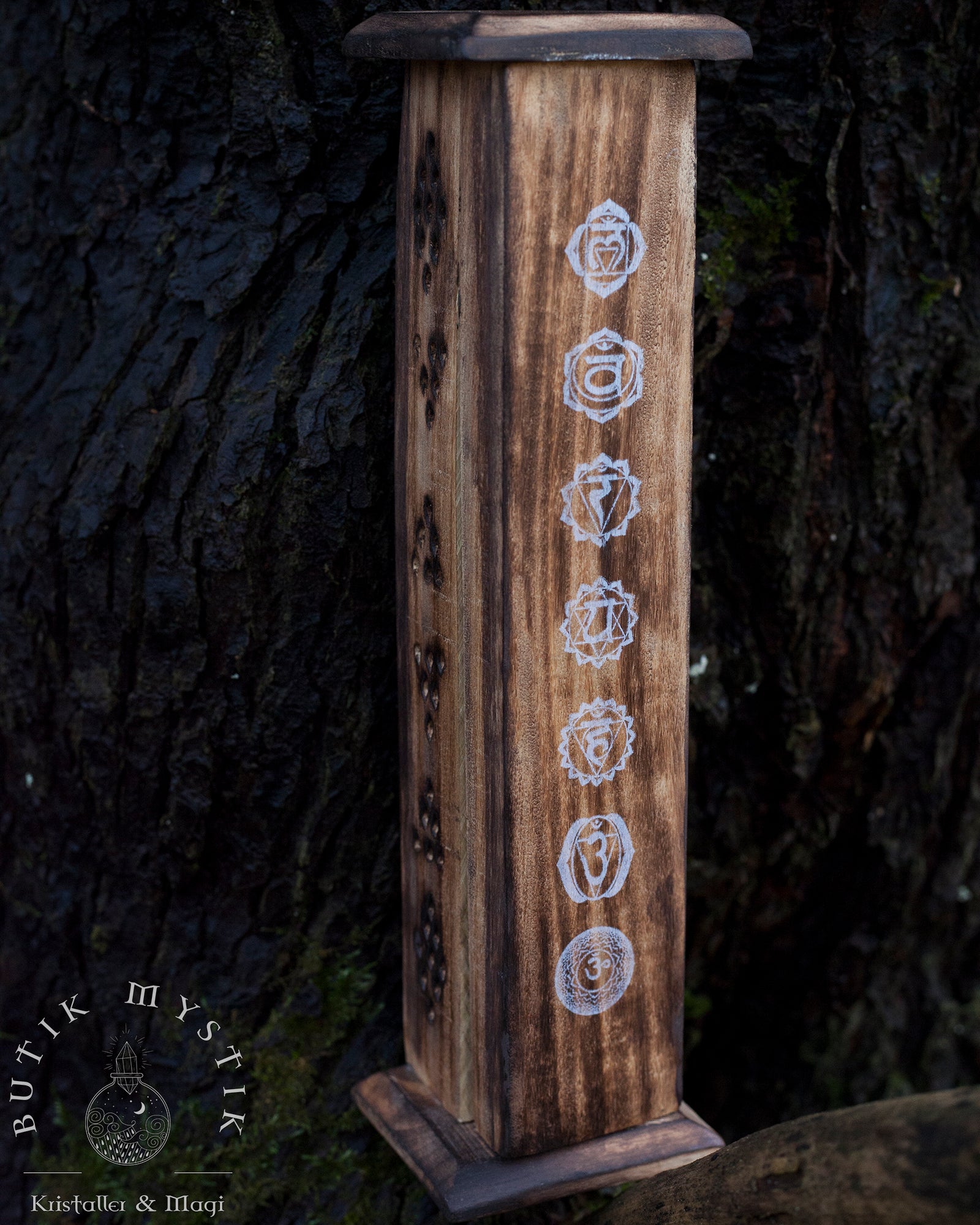 Denna rökelsebrännare är handsnidad i Indien. Den snidade blomman på toppen ger nio delikata utskärningar för röken att stiga upp genom. Var och en av de fyra sidorna är huggen i en vacker design. Trätornet kan bränna fyra rökelsepinnar åt gången samt en rökelsekon. Mycket lätt att rengöra.