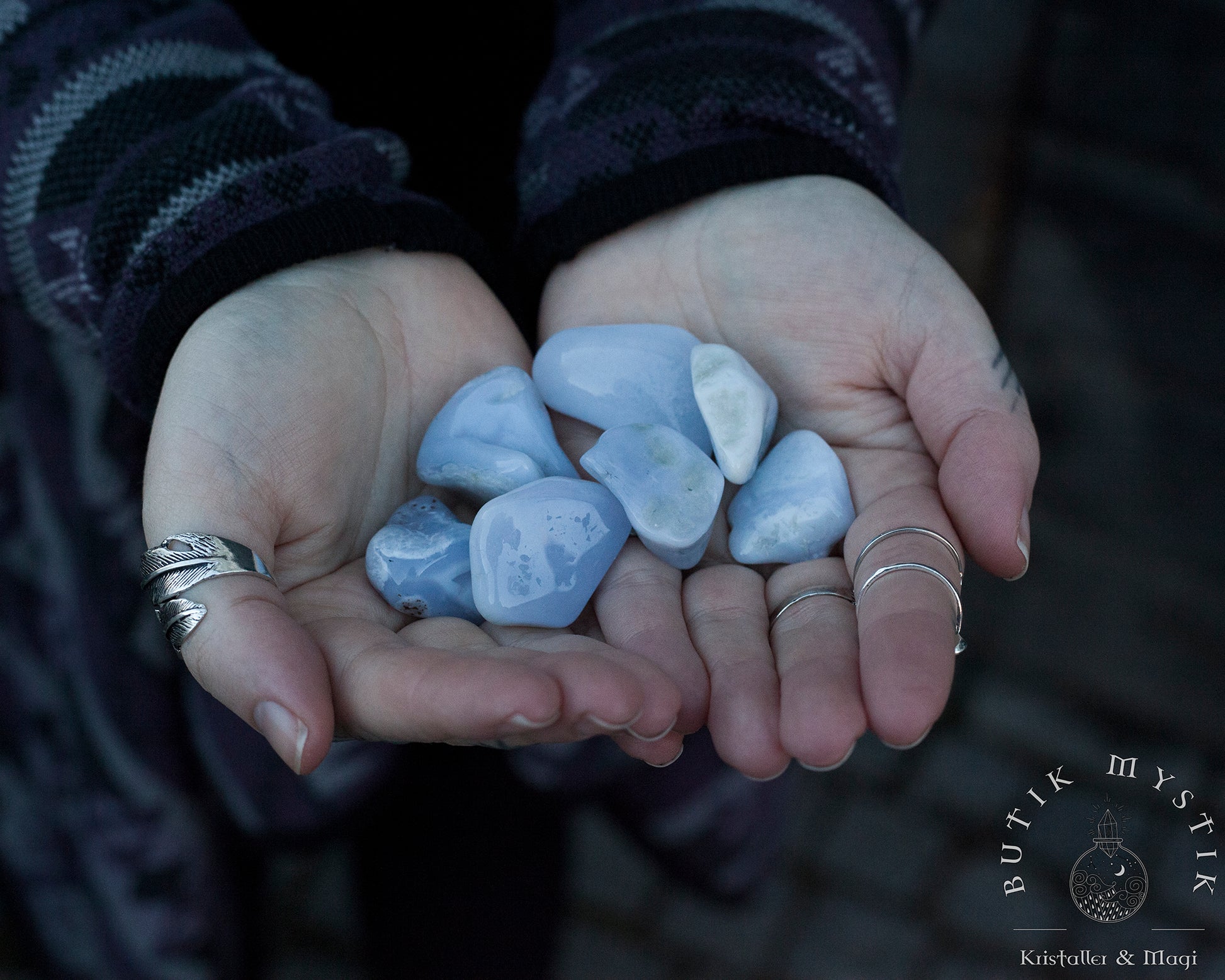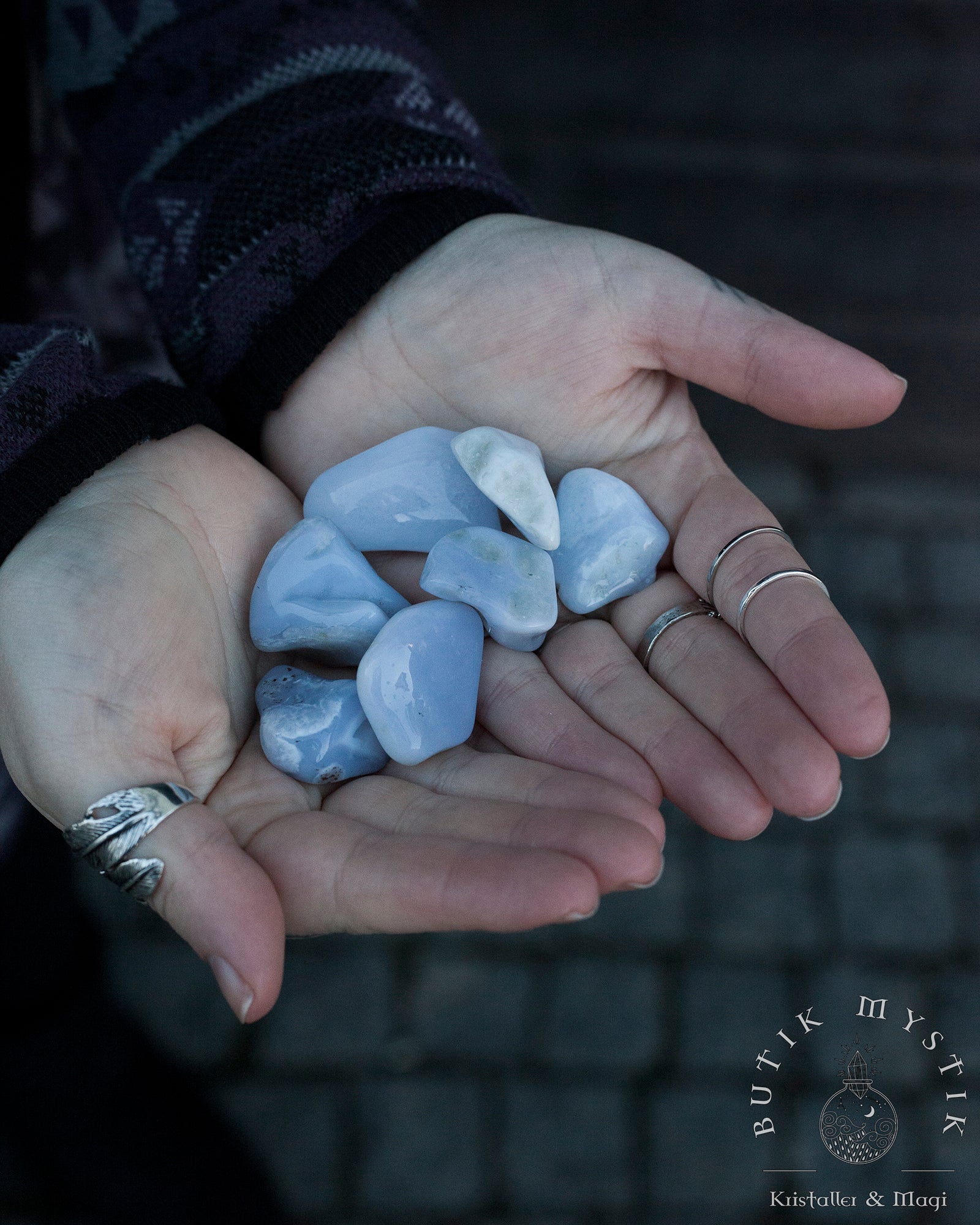 Blå kalcedon är en vacker, halvtransparent ädelsten som tillhör kvartsfamiljen. Den har en mild blå färg och ett mjukt, nästan mjölkigt utseende. Stenen anses ha lugnande och balanserande egenskaper, och många tror att den hjälper till att stärka kommunikation och främja inre frid. Blå kalcedon har använts både som smycke och som en spirituell sten i århundraden, och är populär inom alternativmedicin och kristallhealing.