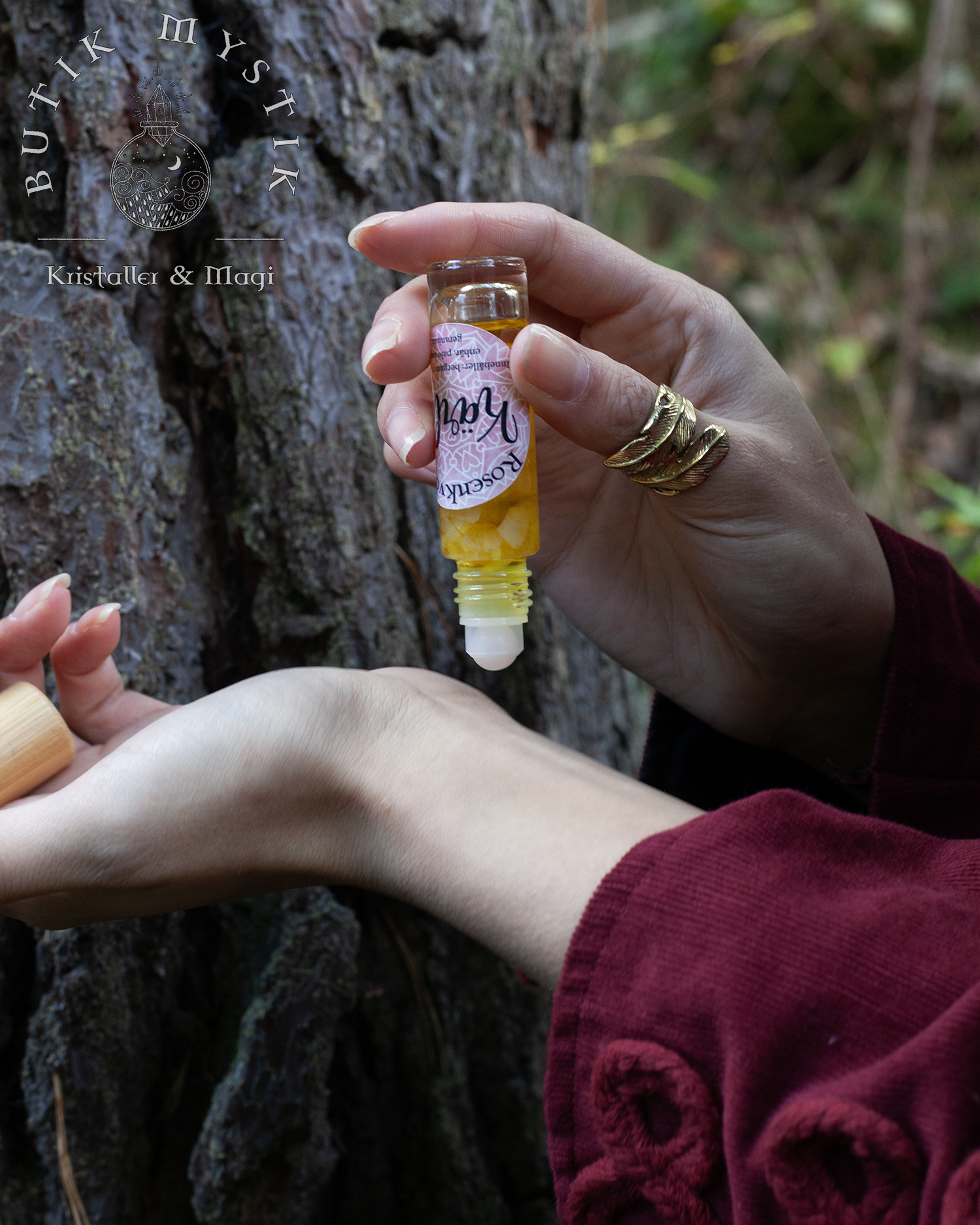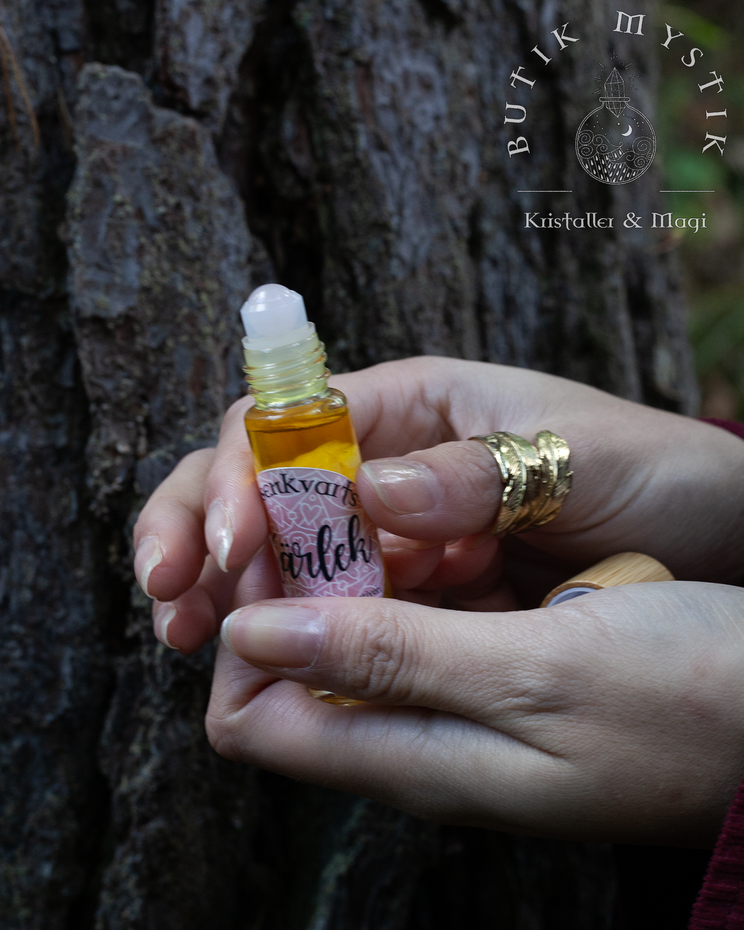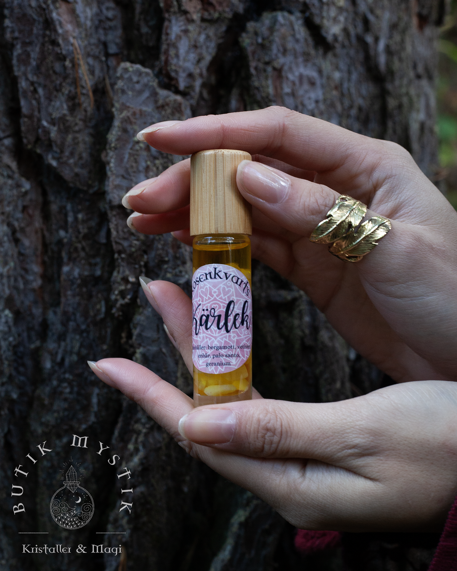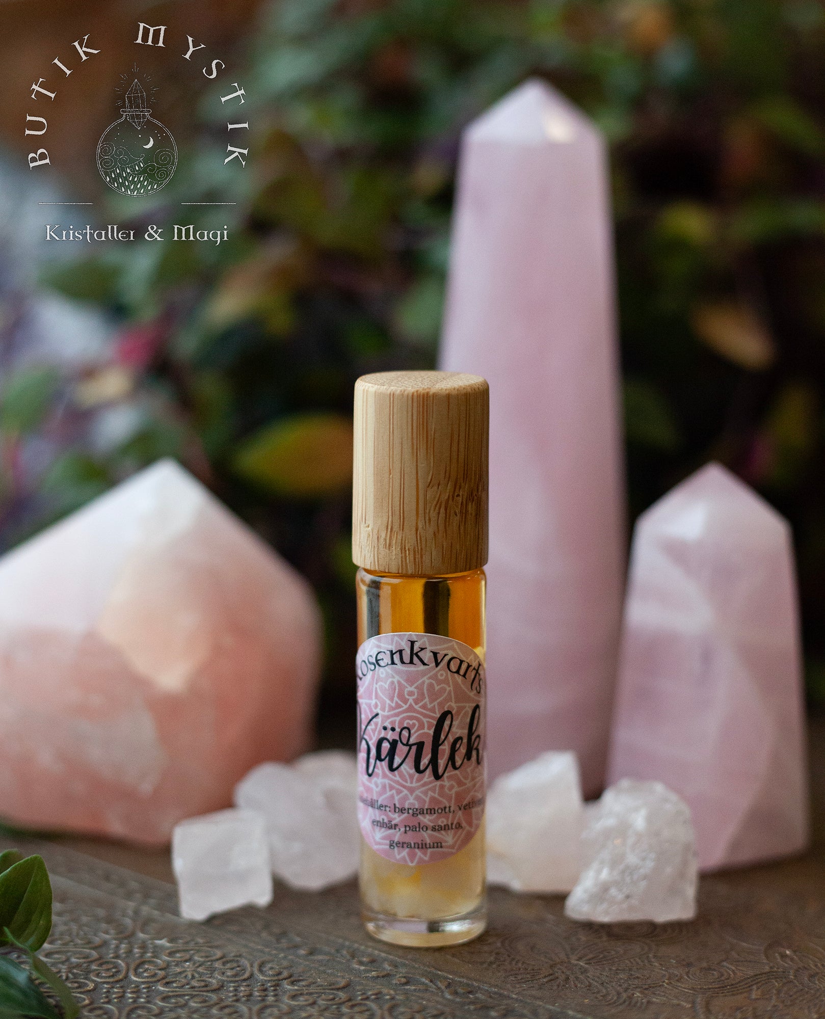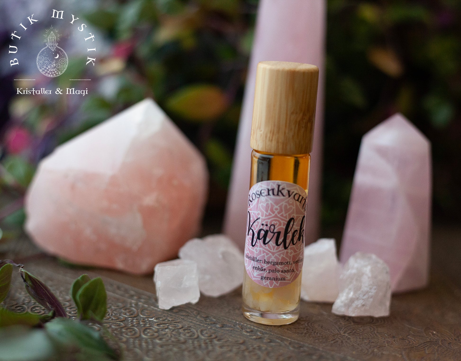 Kristallroller med rosenkvarts och eteriska oljor, allt med fokus på att öppna och läka ditt hjärta.