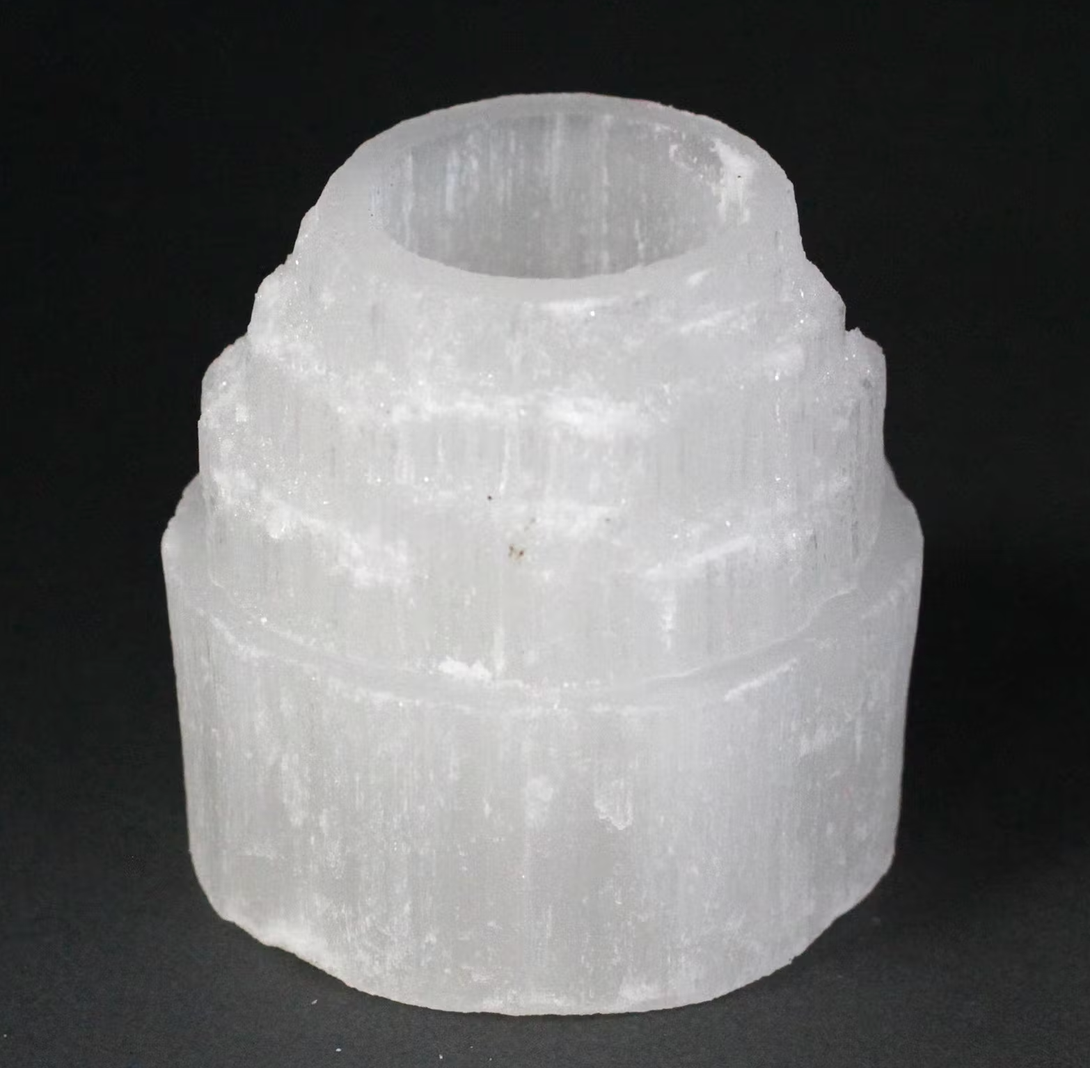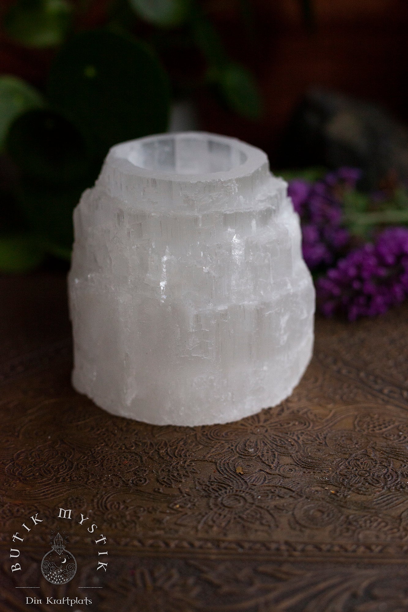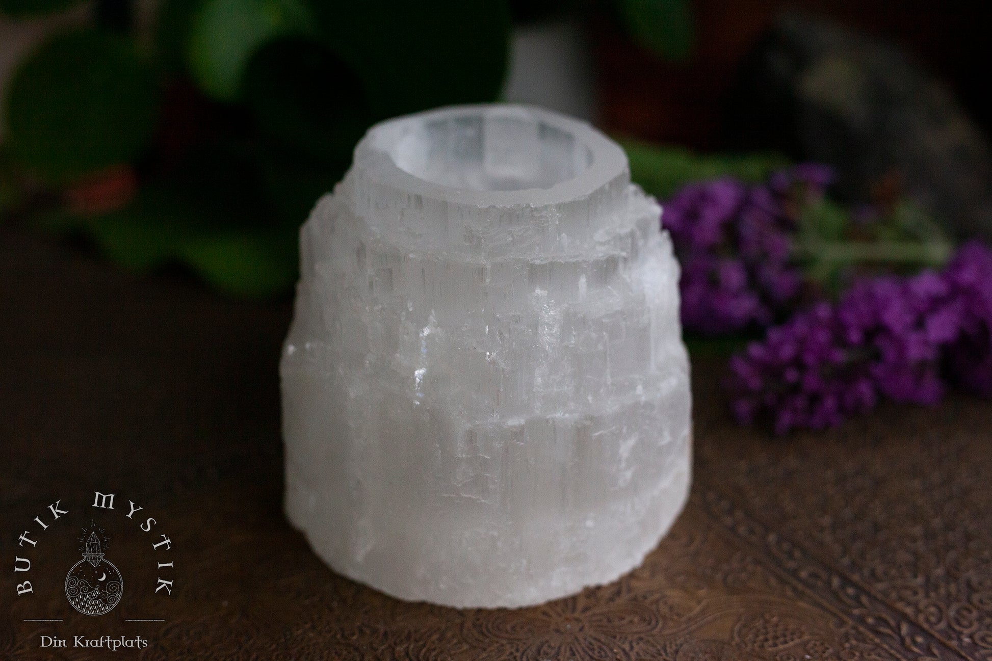 Selenit är en semi-genomskinlig kristall gör att ljusets låga flimrar något genom väggarna på ljushållaren. Kanterna på ljushållarna är näturäkta.