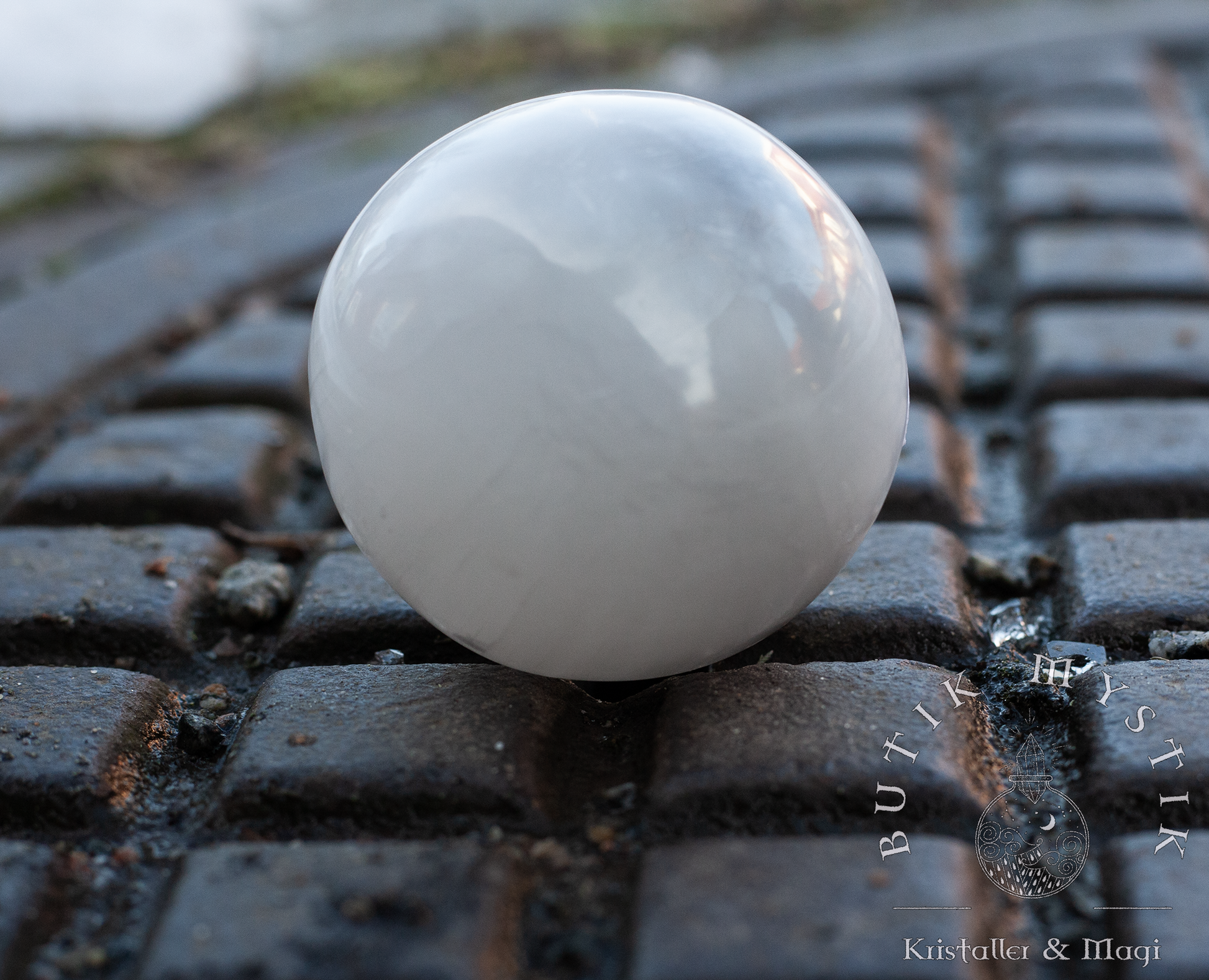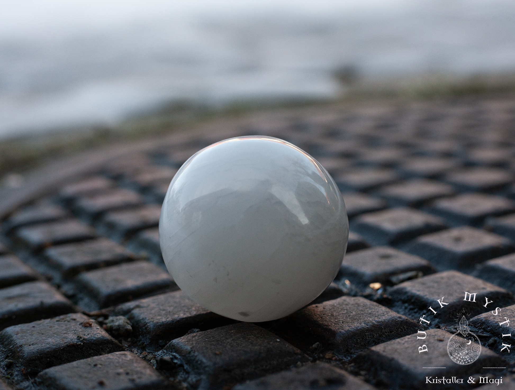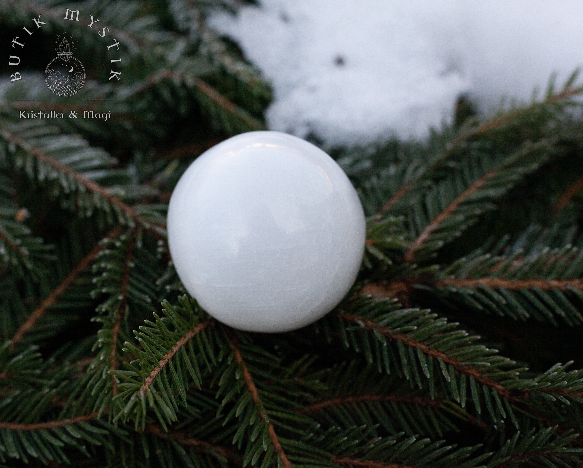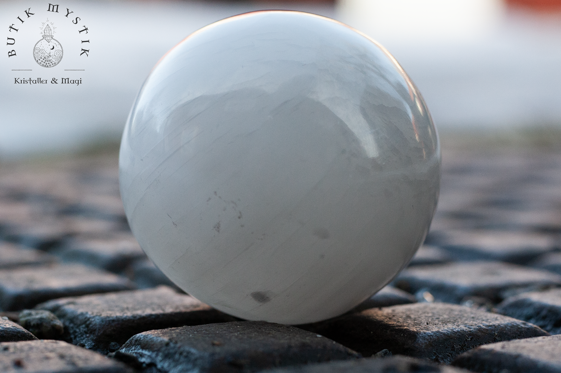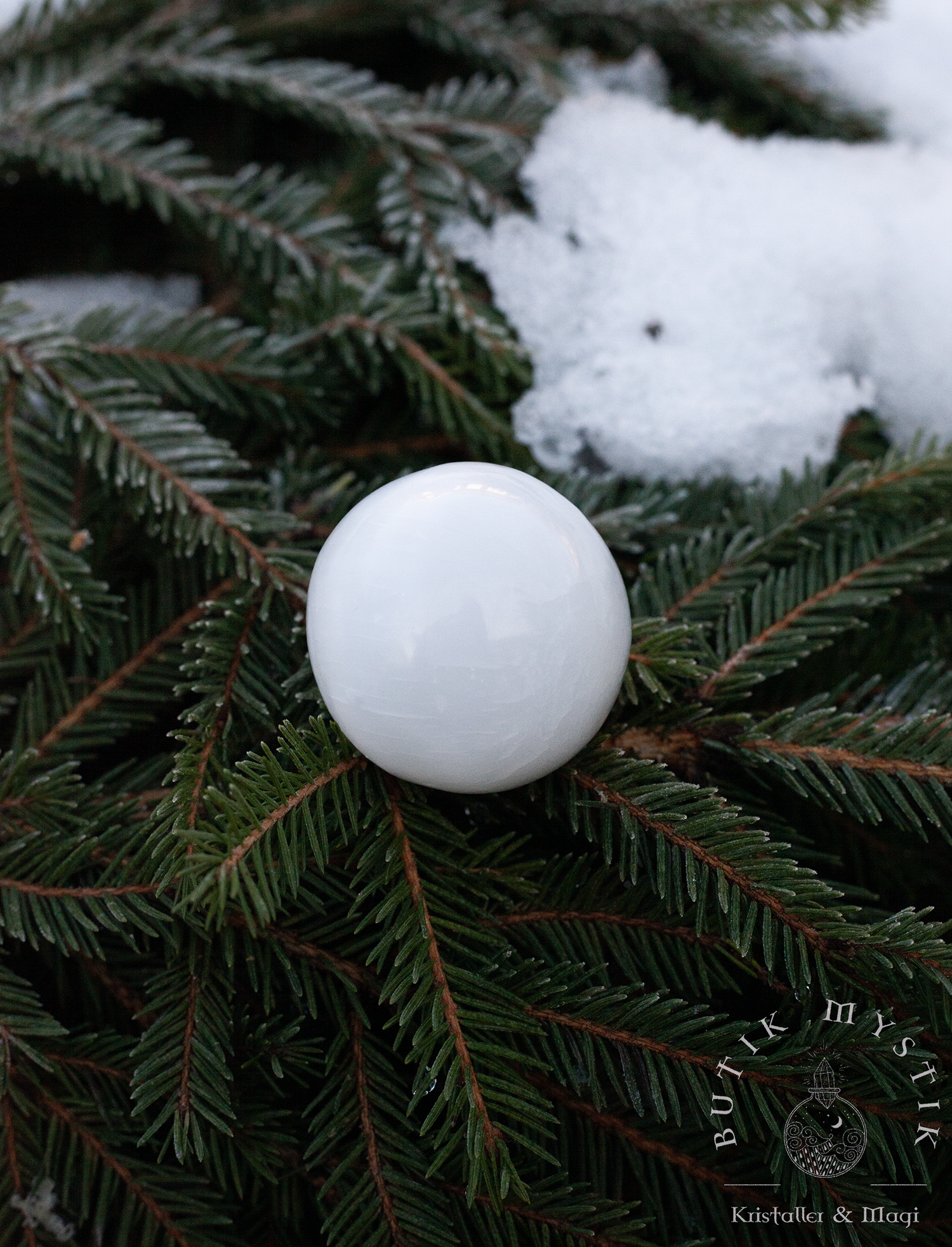 Ett kristallklot i selenit är en vacker och fascinerande sten som utstrålar lugn och klarhet.