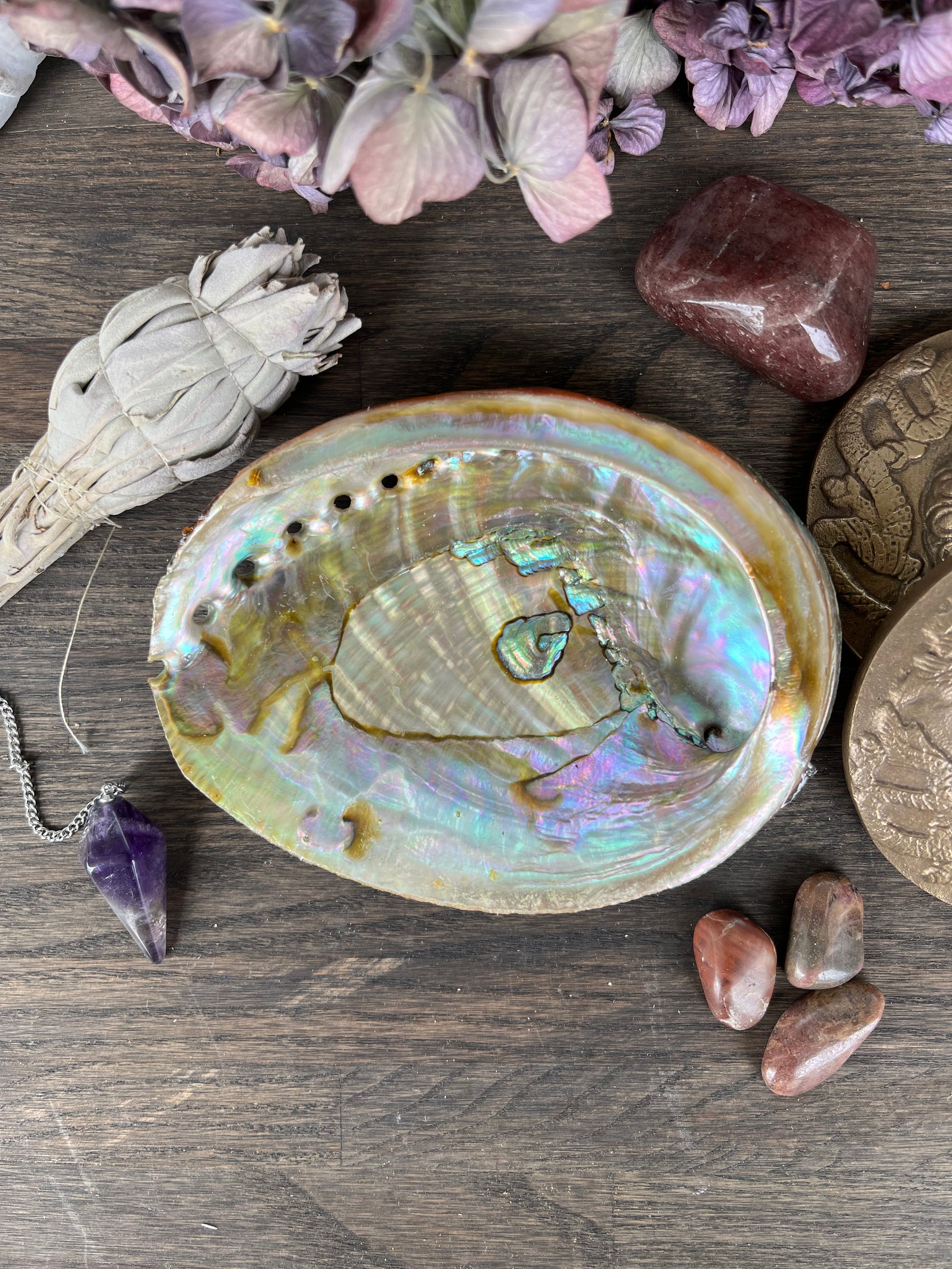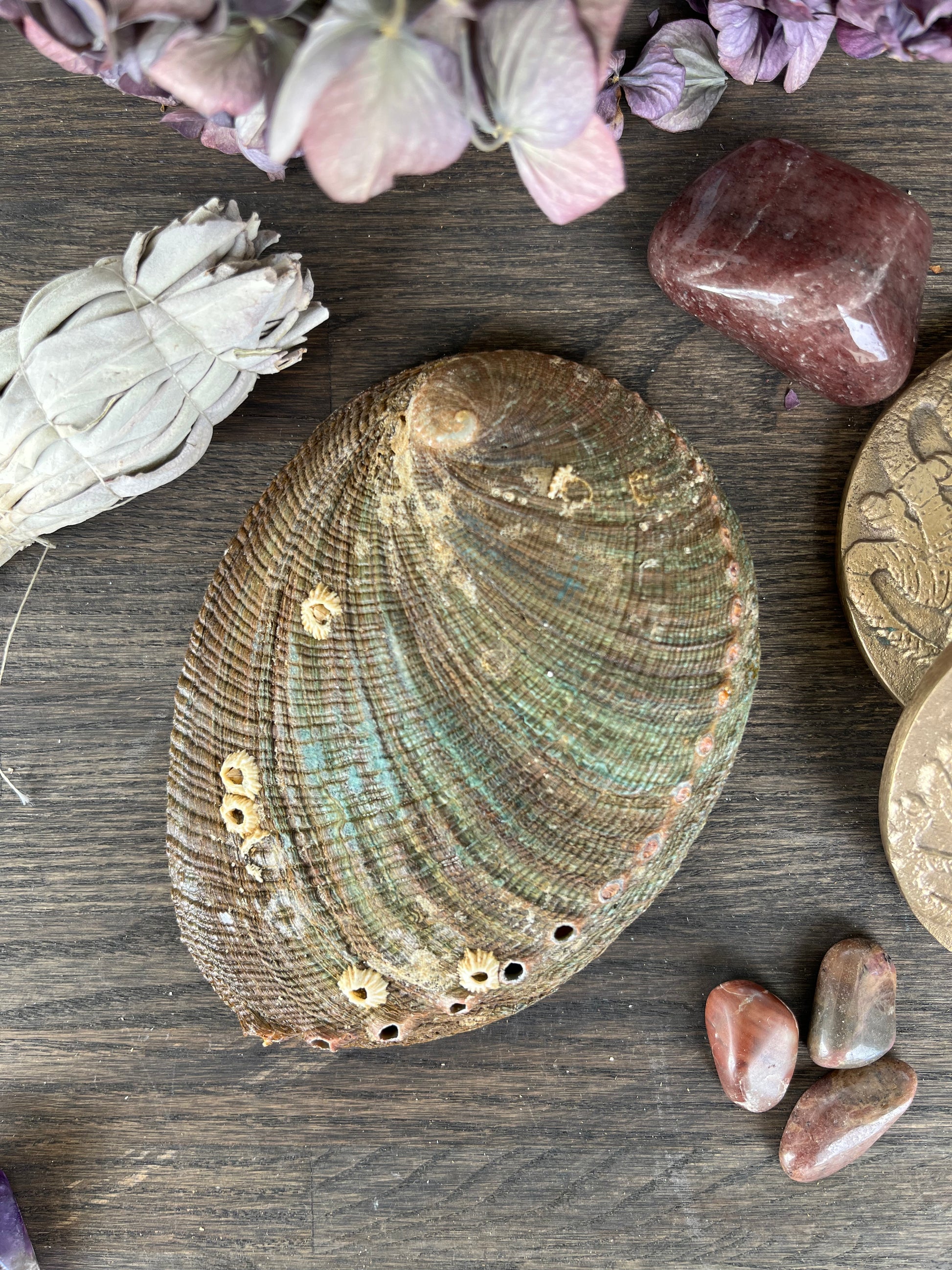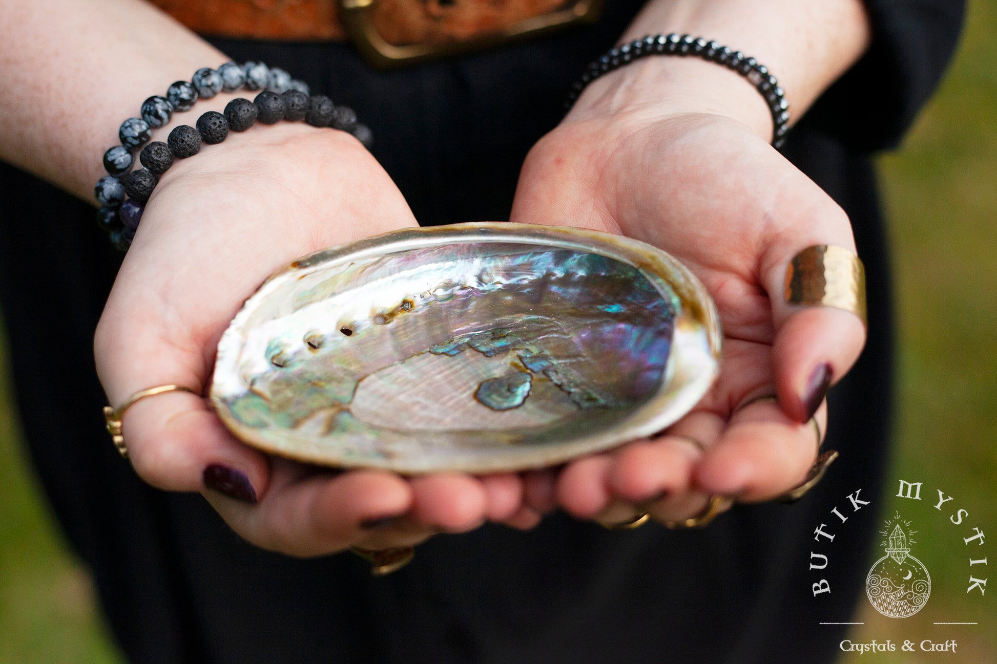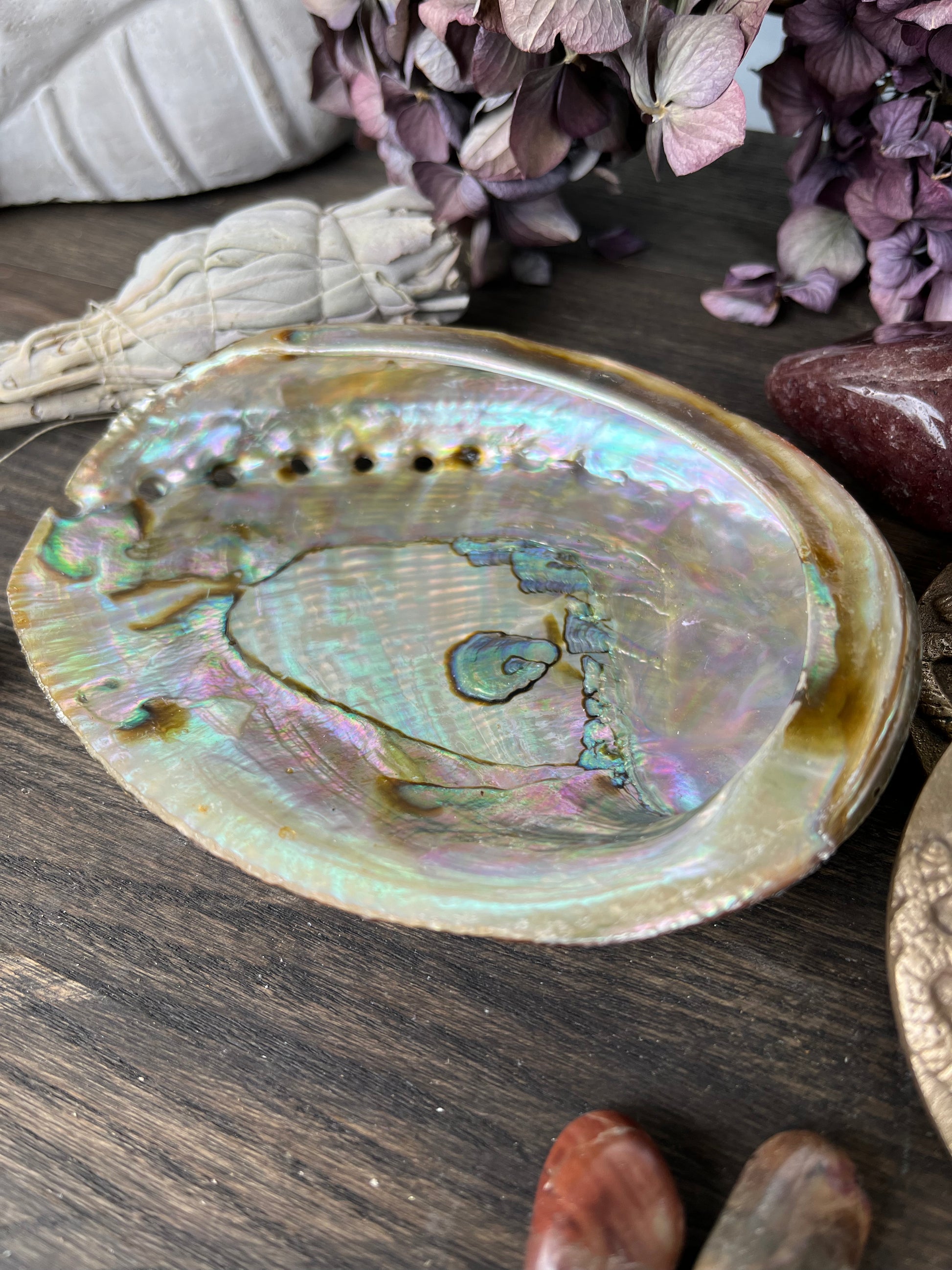 Vackert Grön Abalone-snäcka att använda som smudgeskål för en Salvia bunt. Eller så kan den används som skål till dina kristaller eller rökelser. Du kan även sätta ner rökelsepinnar i hålen längs med kanterna.