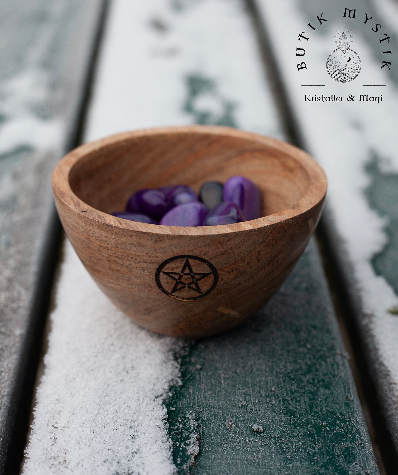 Denna handgjorda träskål är utsmyckad med ett vackert pentagram, som representerar den balans och harmoni mellan de fem elementen: jord, vatten, eld, luft och ande.